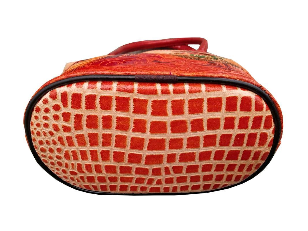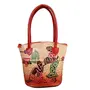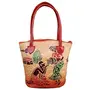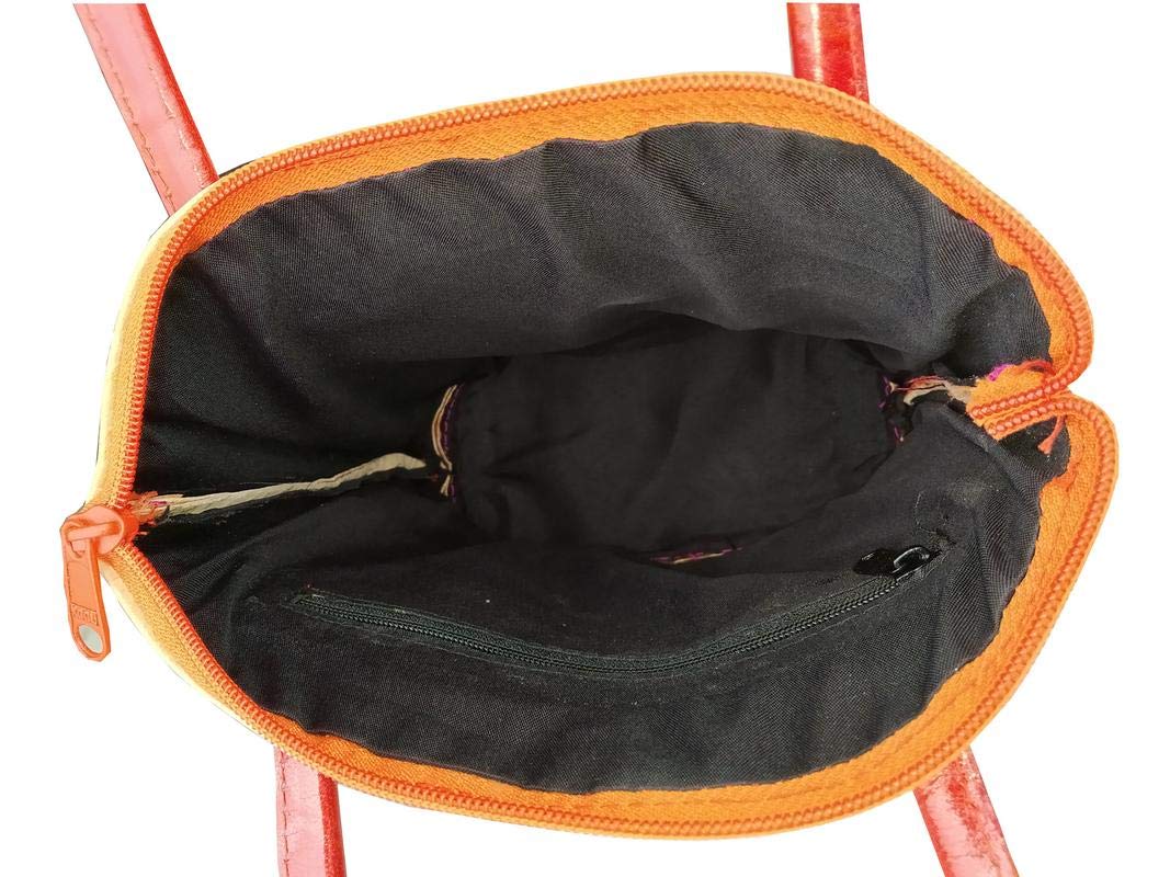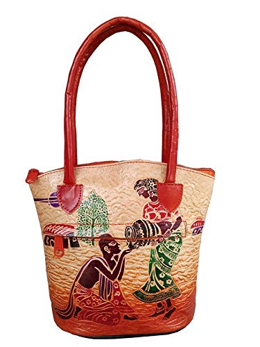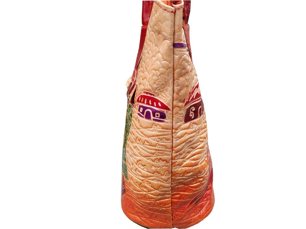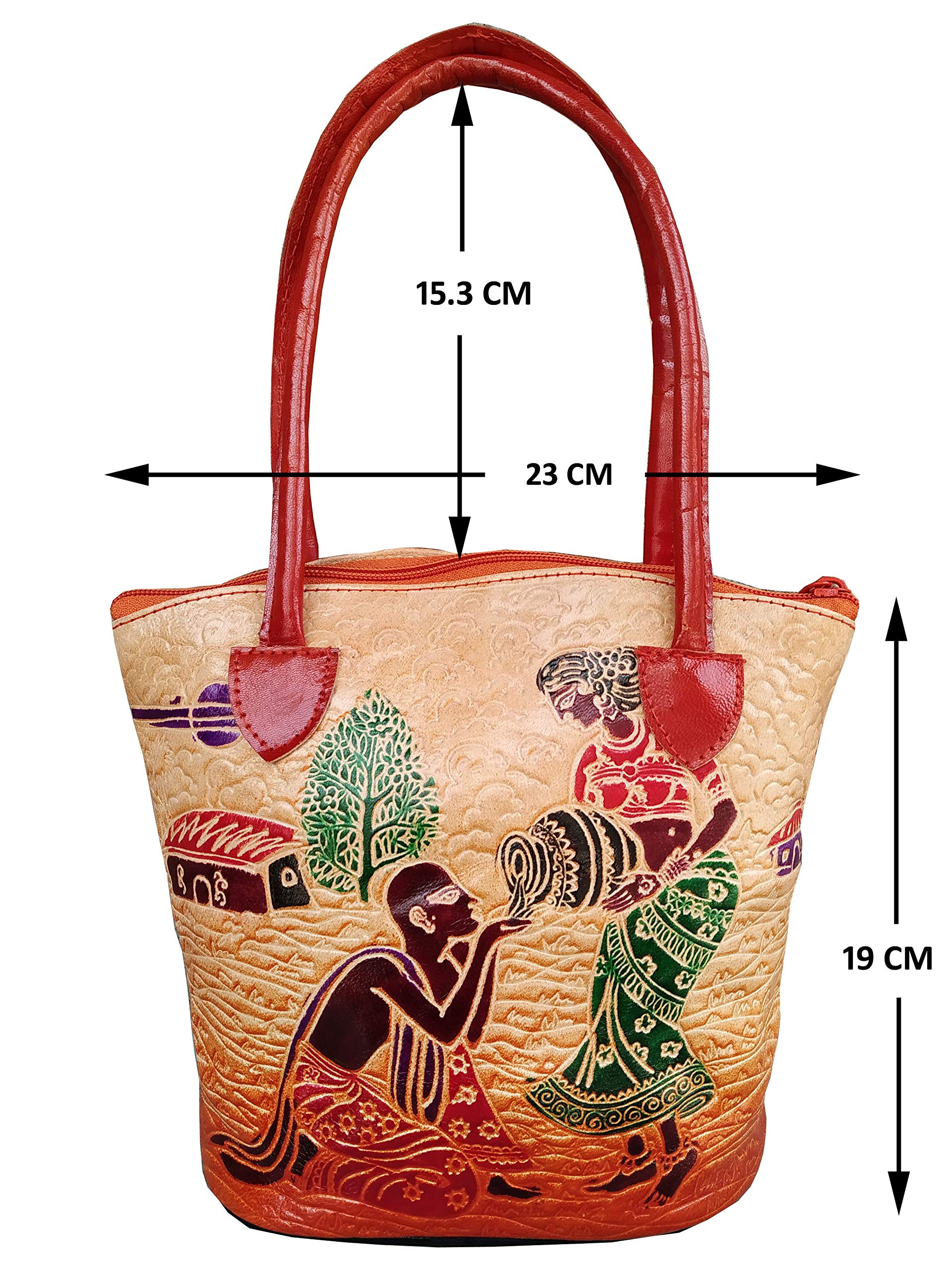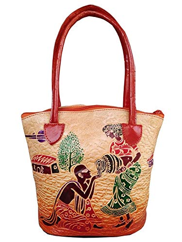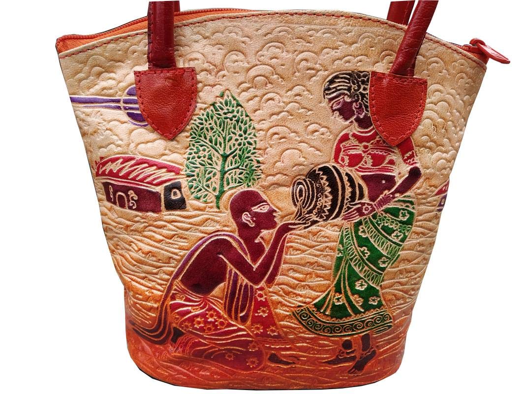 Handcrafted from Leather a Beautiful Ethnic Art of West Bengal. Design on Both Sides Double Handle One Main compartment and One Cell phone compartment Inside One pocket in the back. Closes fully with zip. Traditional Block print. This purse is a classic example of age old Shantiniketan craft which was introduced in West Bengal India during the 1940s. The traditional motifs used for these Shantiniketan bags depict the rich cultural heritage of India. It derives its name from the place where it was first introduced - Shantiniketan and was patronized by Nobel Laureate Rabindra Nath Tagore who revived a number of crafts that were nearing redundancy in Shantiniketan. The Shantiniketan style evolved as a result of the Art Movement and these products have now become world famous for their applique batik and embossed craft work. The process of burnishing the leather gives it an elegant sheen and brings out the colors. The major embossing craft is done by hand and is an intricate process. After the final leather made it is then stitched into the desired product coated with a lacquer finish for making the product shiny and long-lasting.