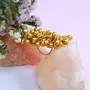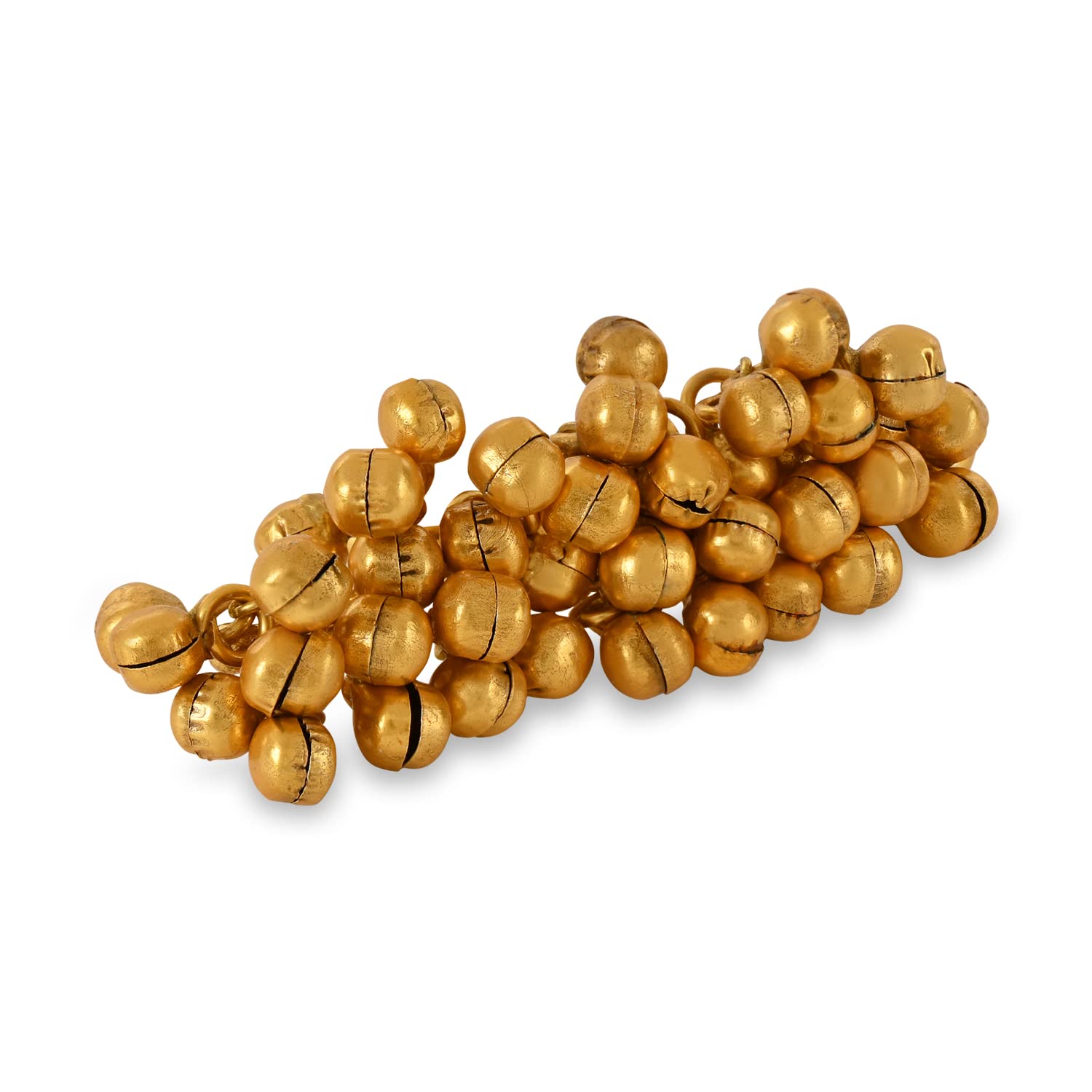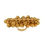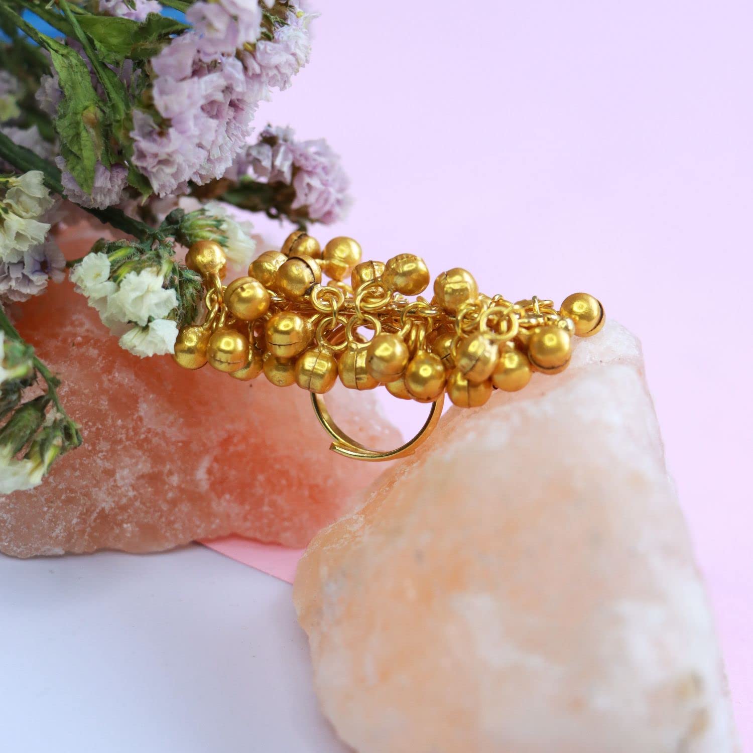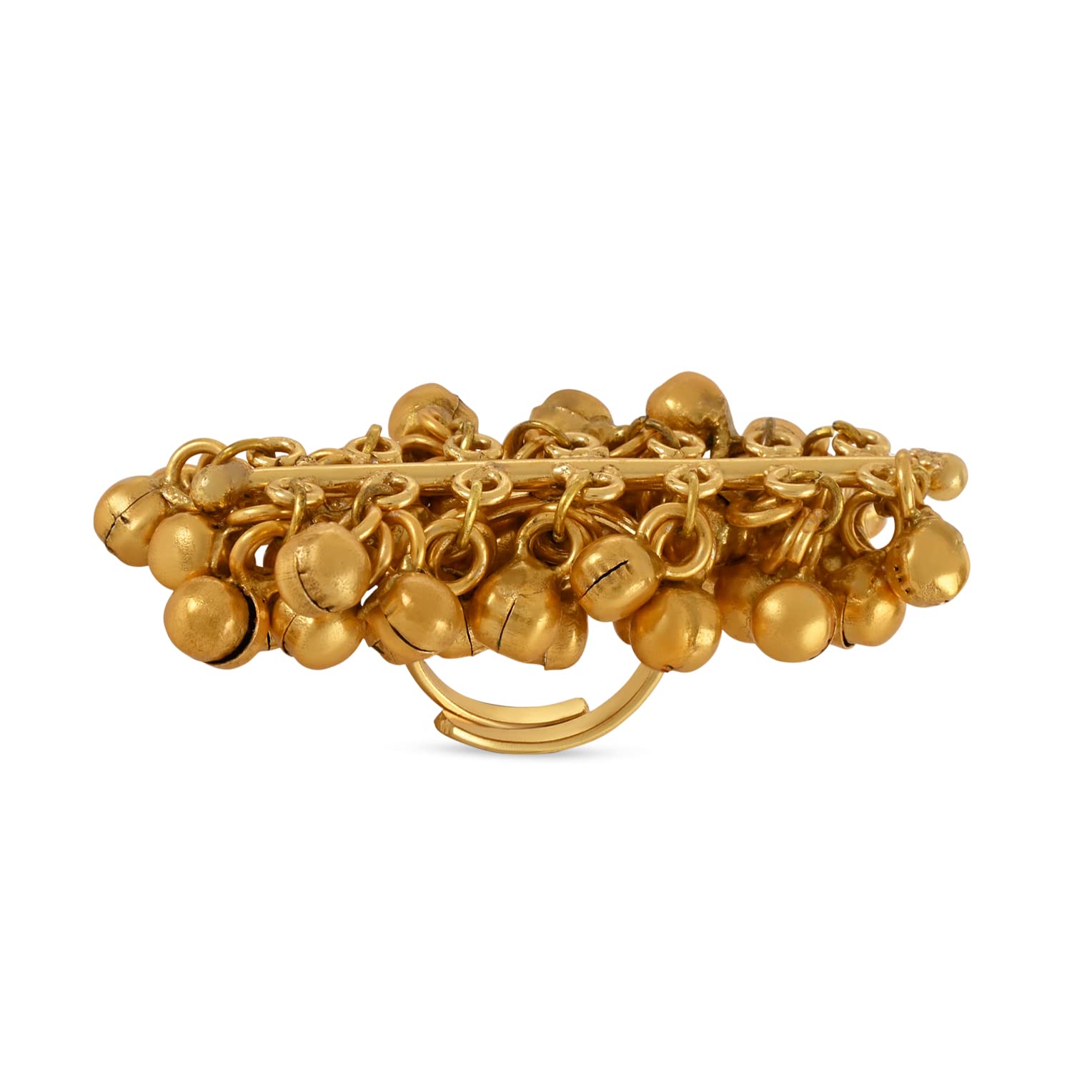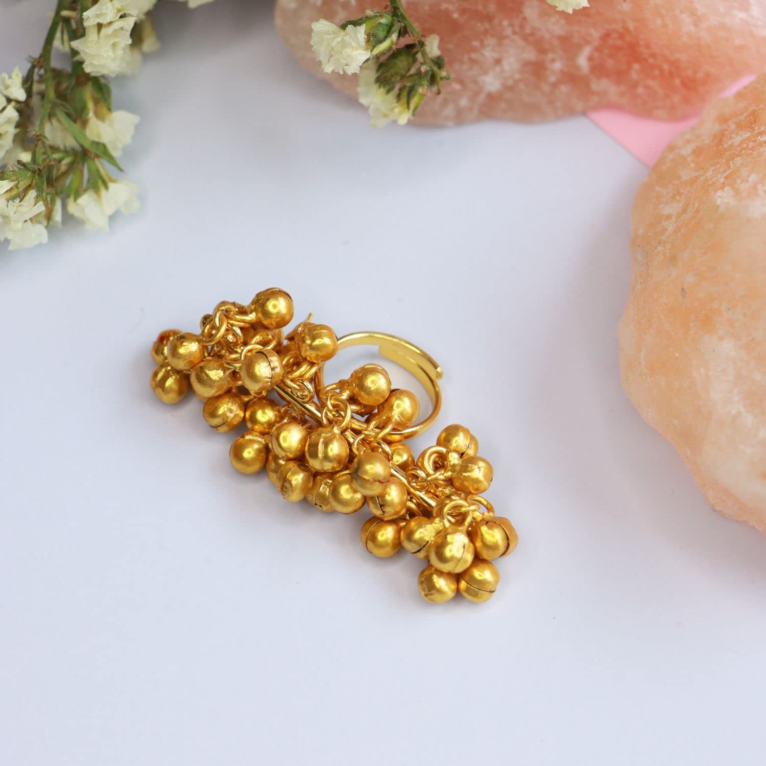 A ethnic adjustable finger ring embellished with ghungroo is a type of jewelry that is designed to be worn on the finger. The ring is made of a base metal which is then coated with a thin layer of gold plating. The ethnic design of the ring is inspired by traditional Indian jewelry and features ghungroos which are small metallic bells that produce a tinkling sound when the ring is moved. The adjustable design of the ring makes it suitable for most finger sizes and the ghungroos add a touch of elegance and movement to the piece. This type of ring is often worn as part of traditional Indian attire for weddings festivals and other special occasions. It's important to note that jewelry requires gentle care and maintenance to ensure that the plating does not wear off. It's best to avoid exposing the ring to water chemicals and harsh abrasives and to store it in a dry cool place when not in use.