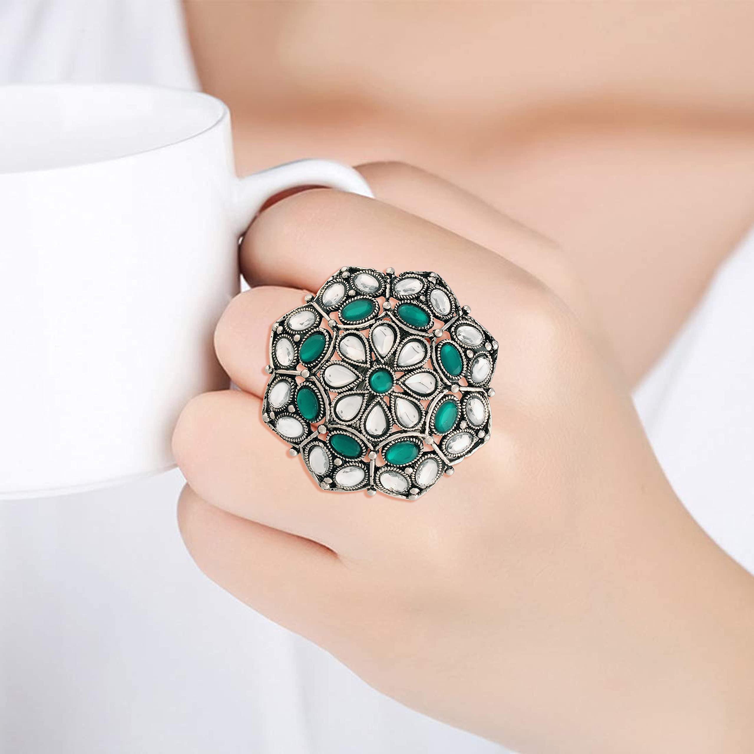 I Jewels Silver Oxidized Kundan Work Designer Adjustable Finger Ring for Women (FL204)