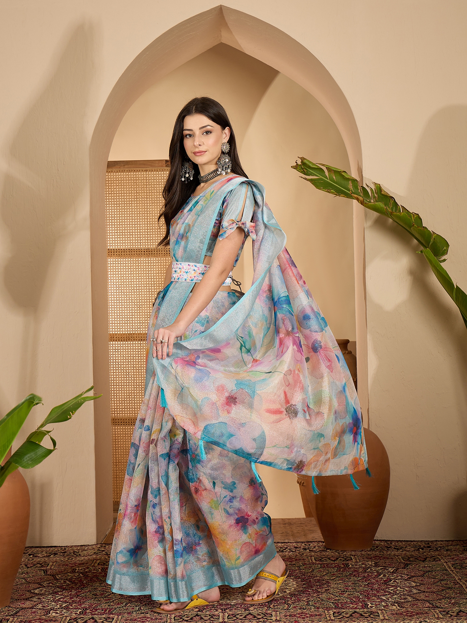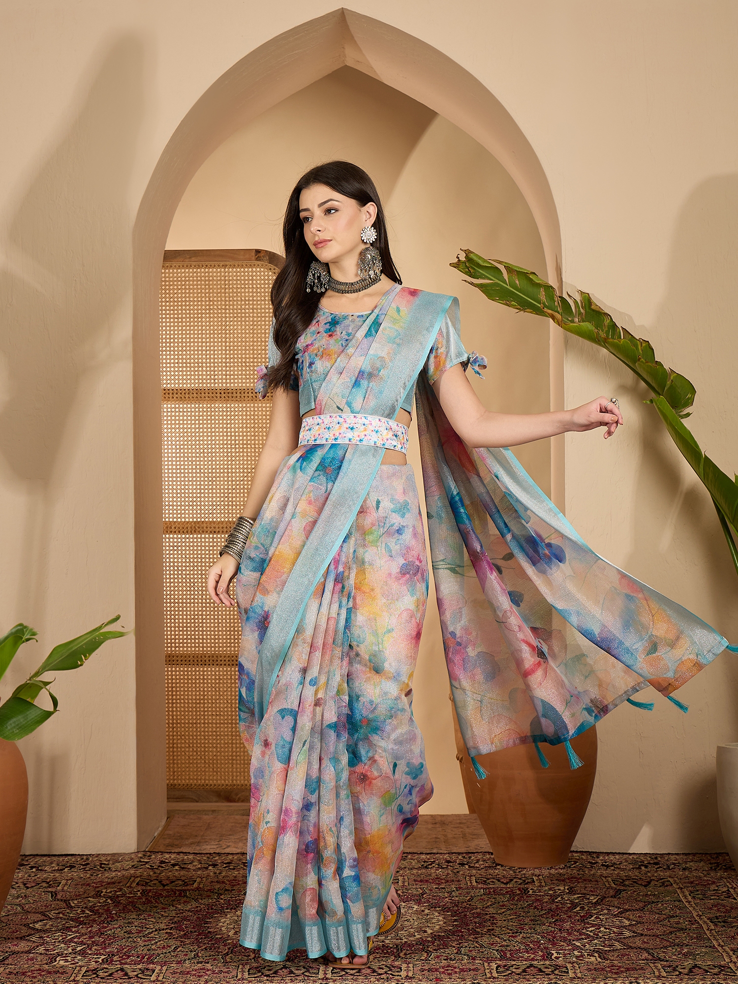 • Saree Work-Digital Print ,Blouse Work- Linen Zari Silver