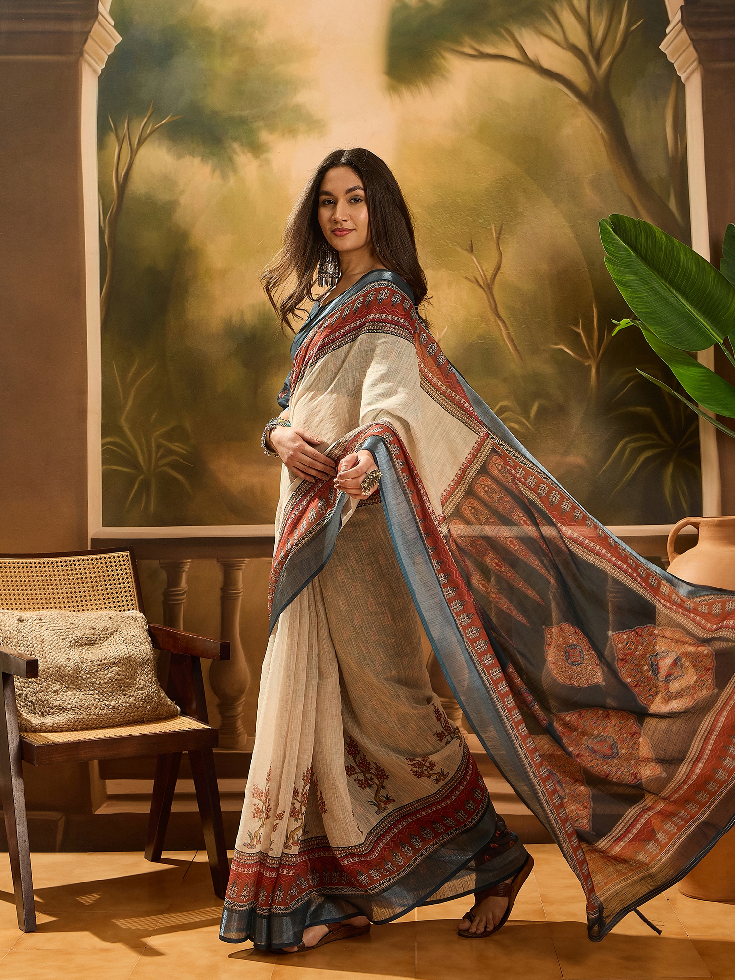 AASTHA FASHION Fashion Dream Womens Cream Linen Cotton Blend Saree | Soft & Elegant Traditional Wear