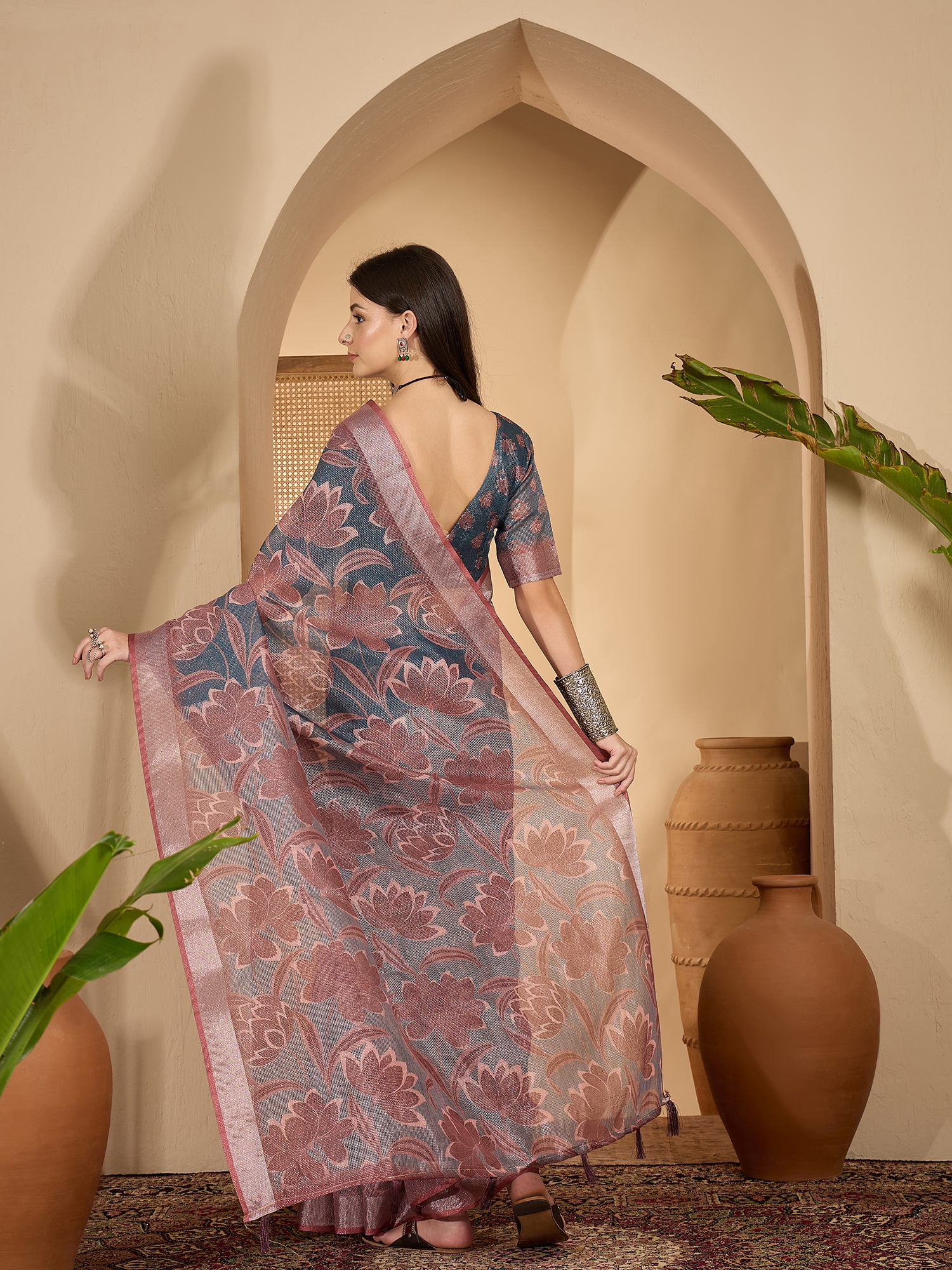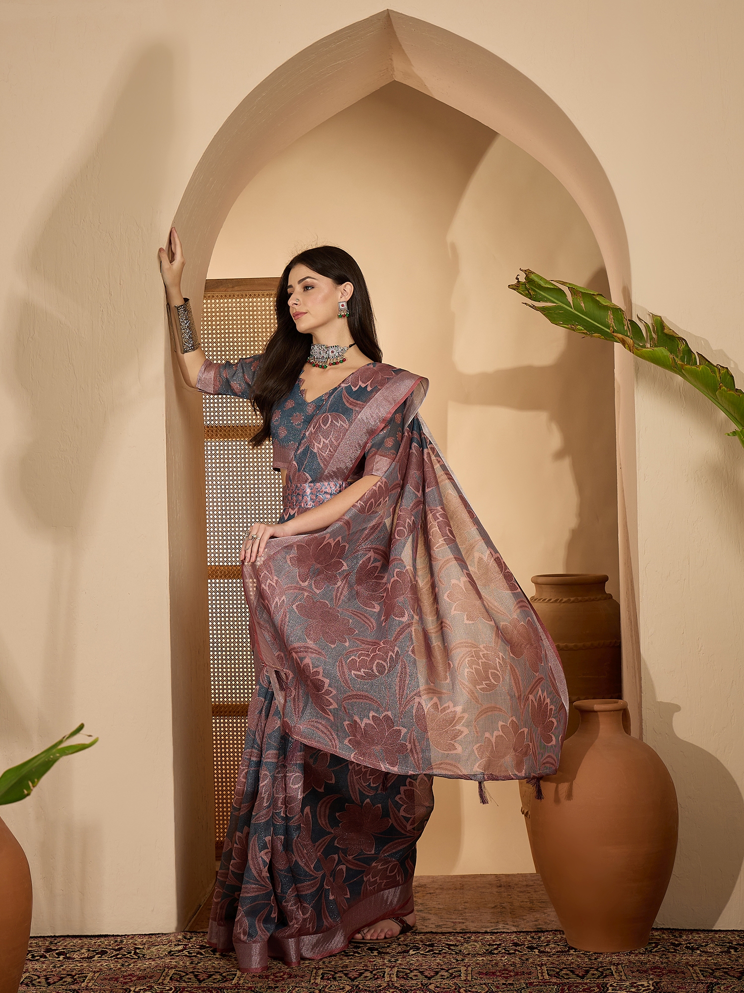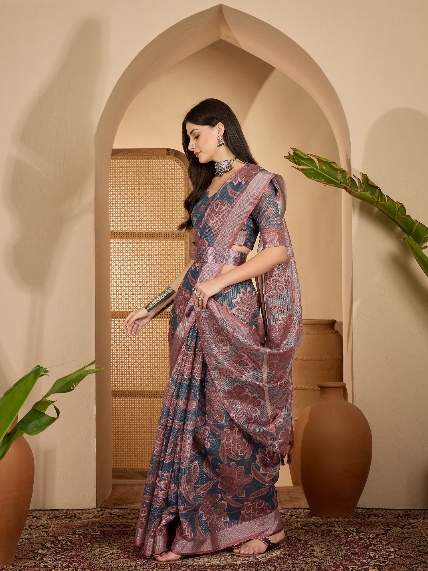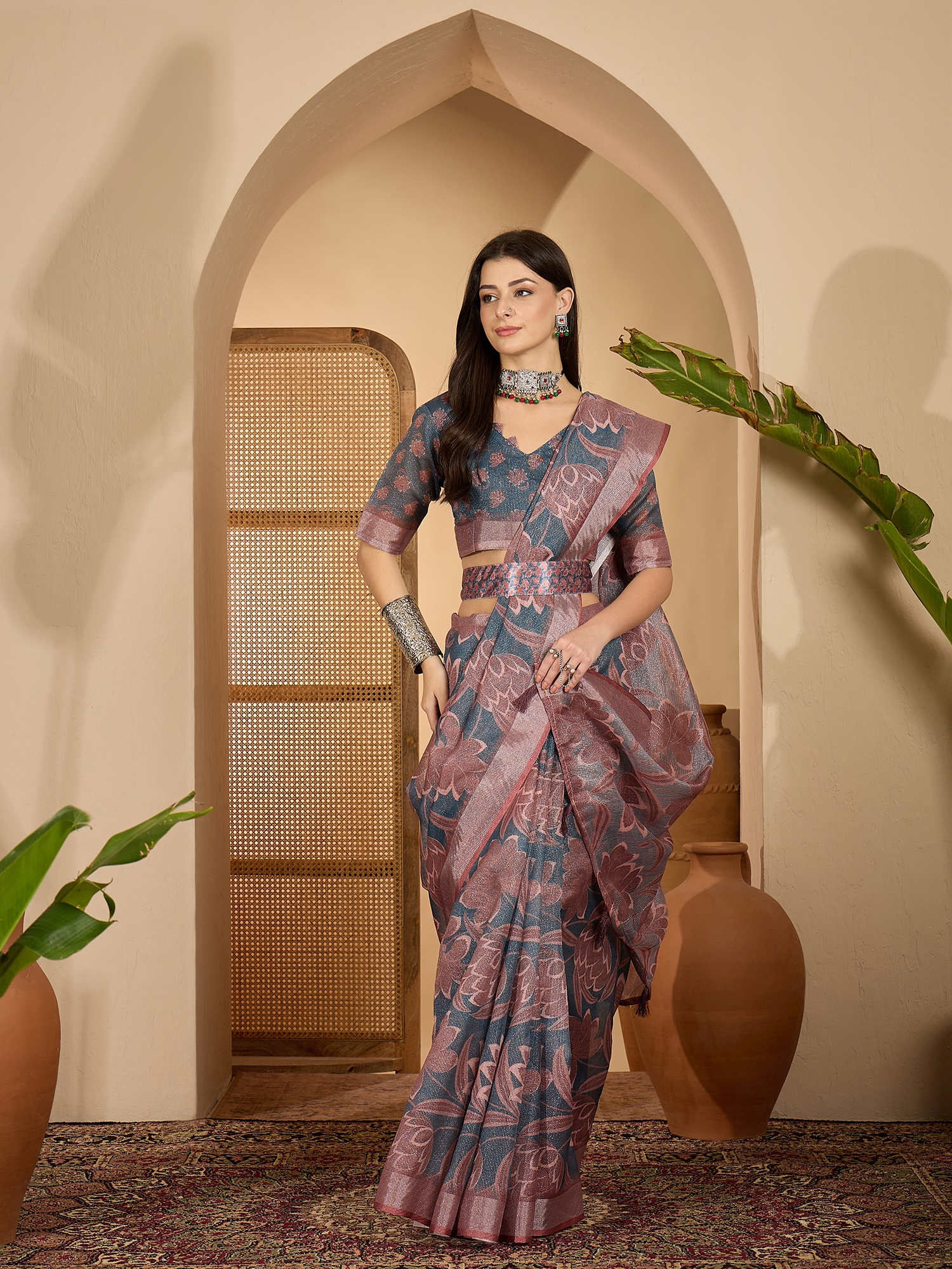 • Saree Work-Digital Print ,Blouse Work- Linen Zari Silver