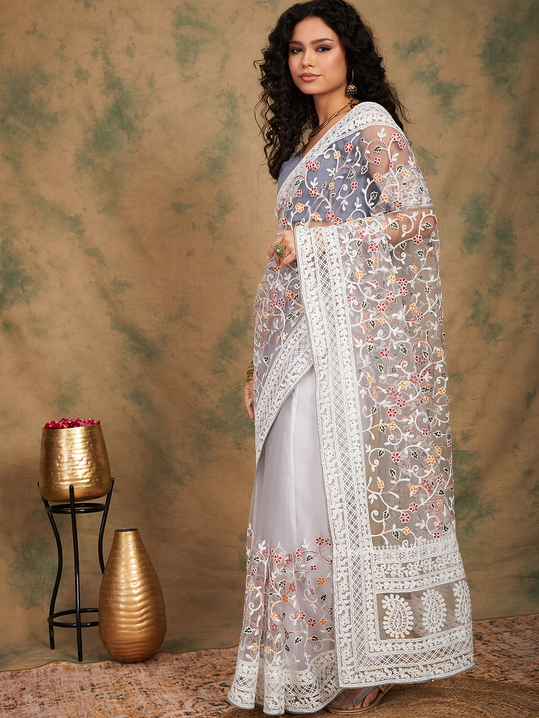 AASTHA FASHION Fashion Dream Womens Grey Net Saree | Soft & Elegant Traditional Wear