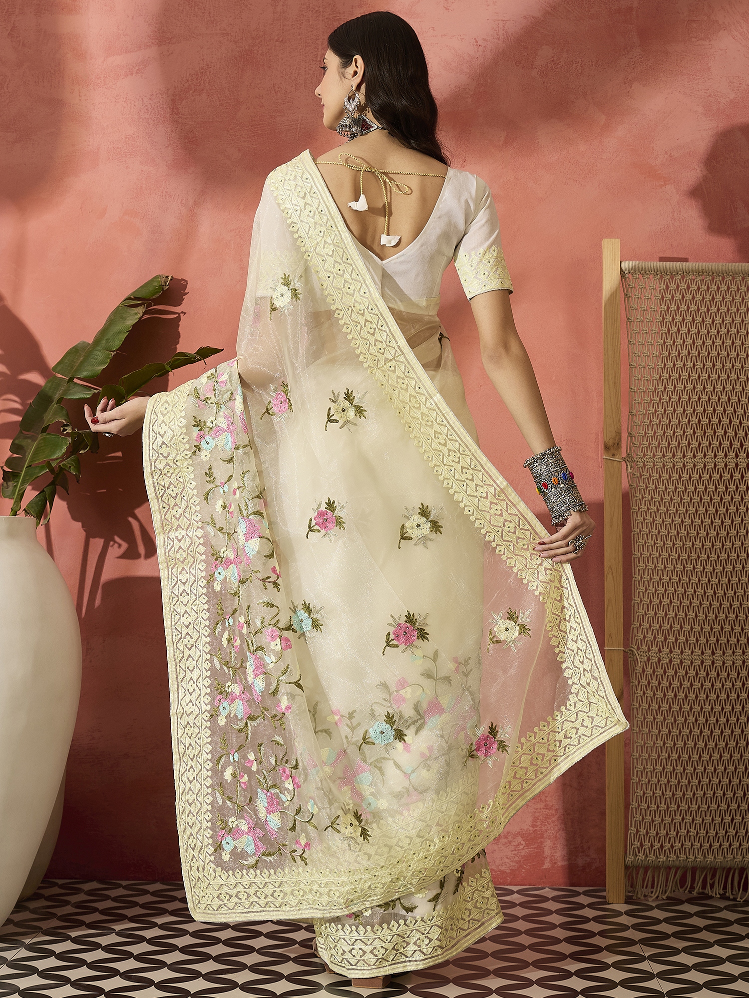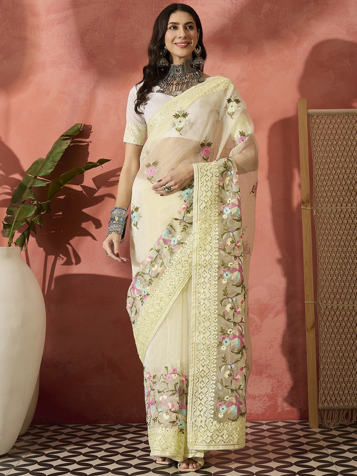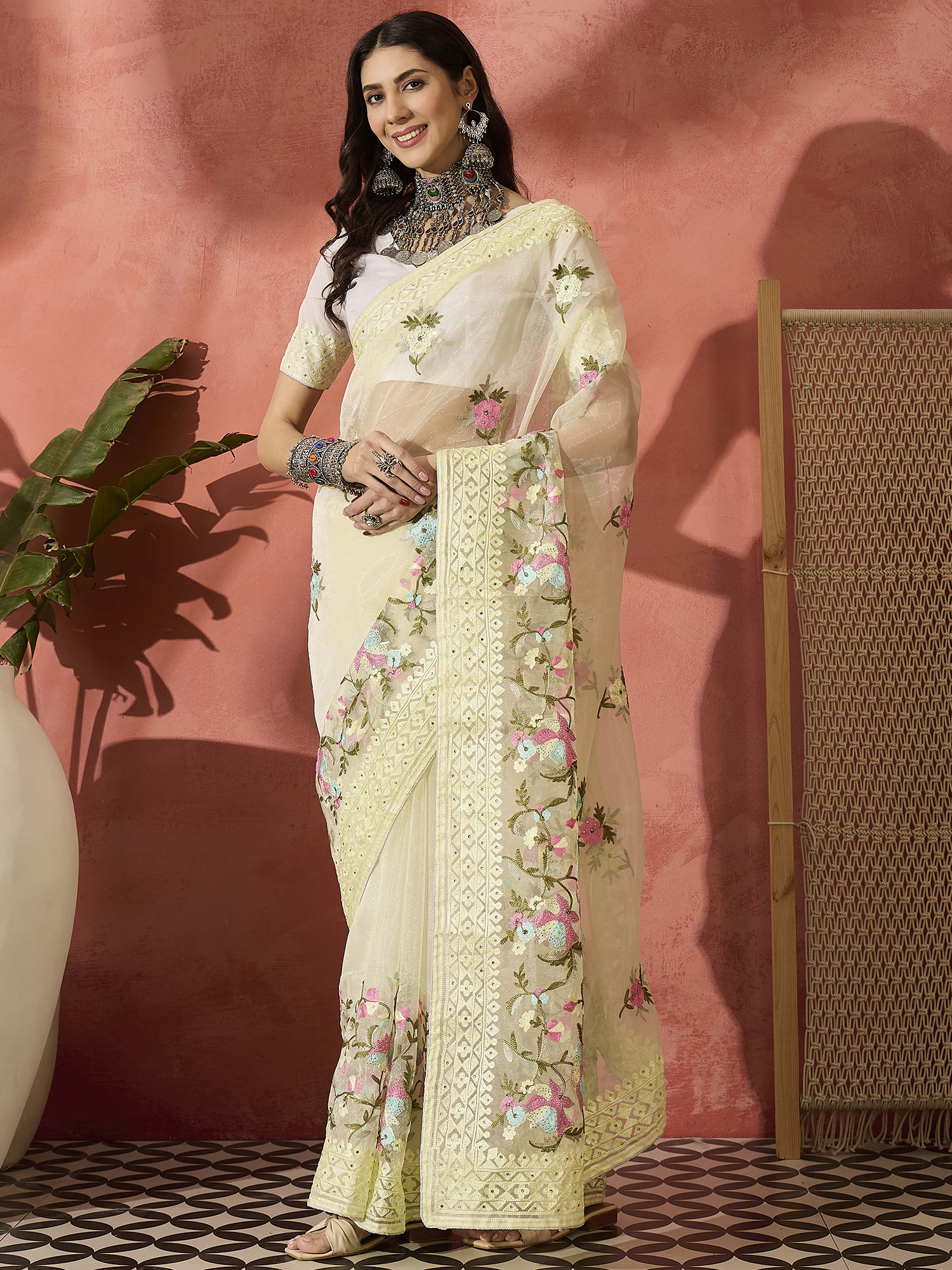 AASTHA FASHION Fashion Dream Womens Light Yellow Organza Saree | Soft & Elegant Traditional Wear