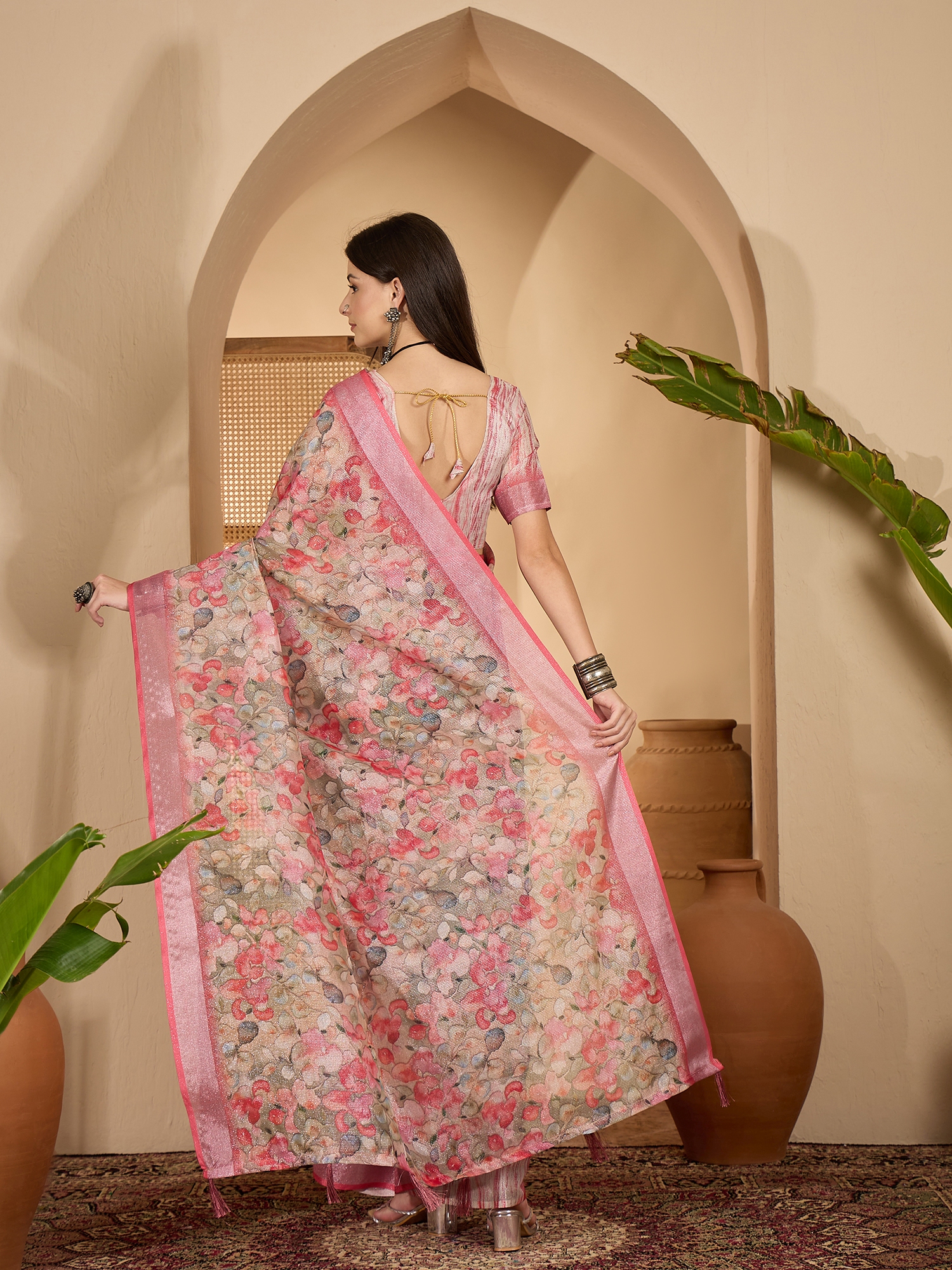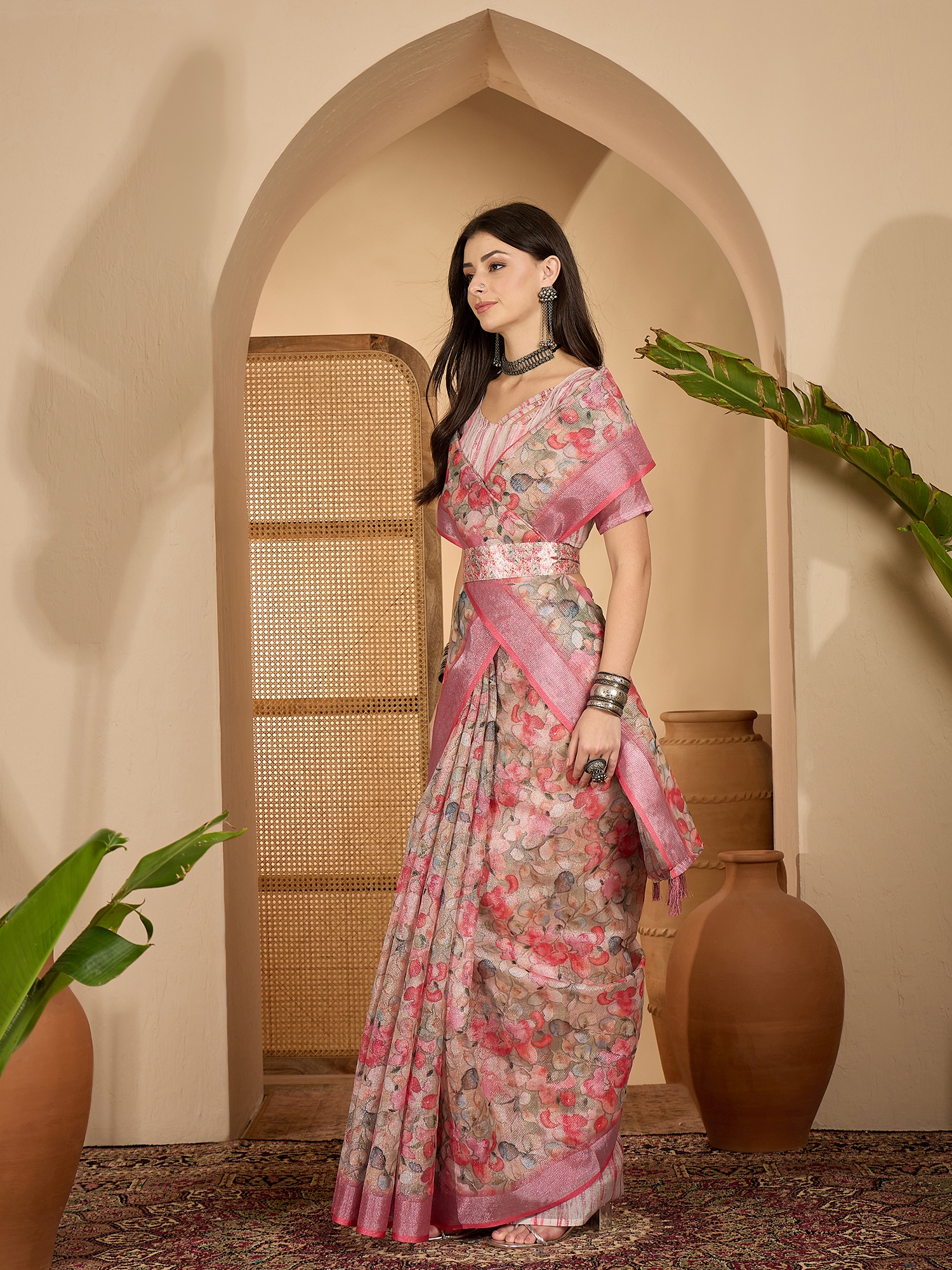 • Saree Work-Digital Print ,Blouse Work- Linen Zari Silver