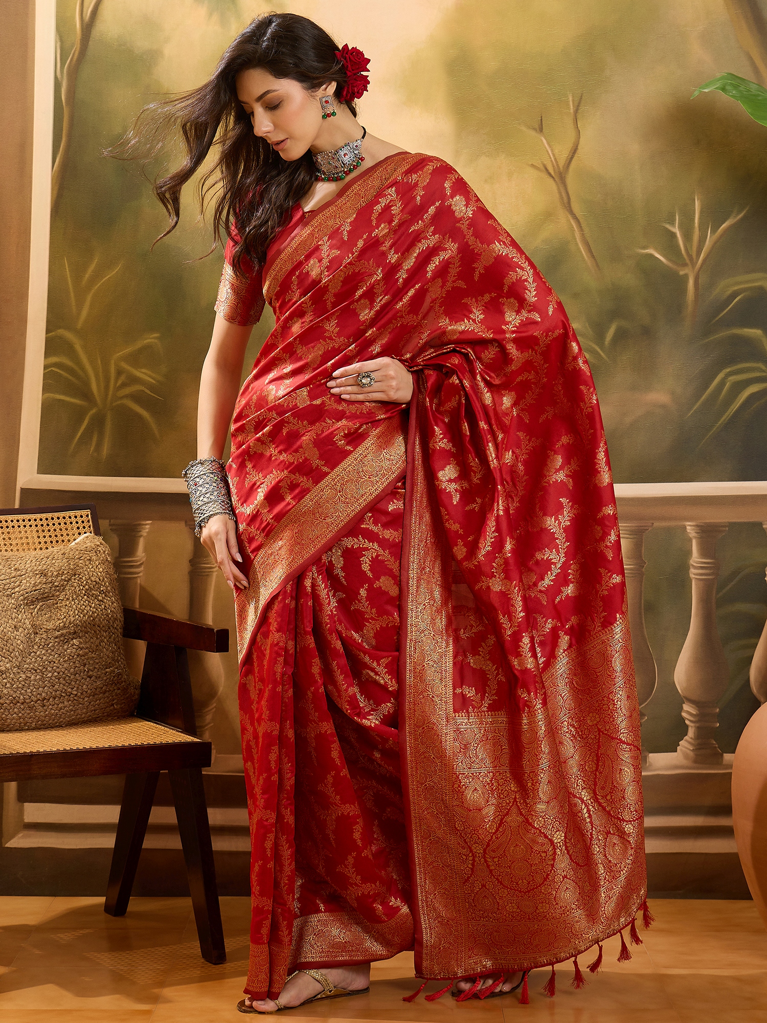 AASTHA FASHION Fashion Dream Womens Red Banarasi Jacquard Saree | Soft & Elegant Traditional Wear