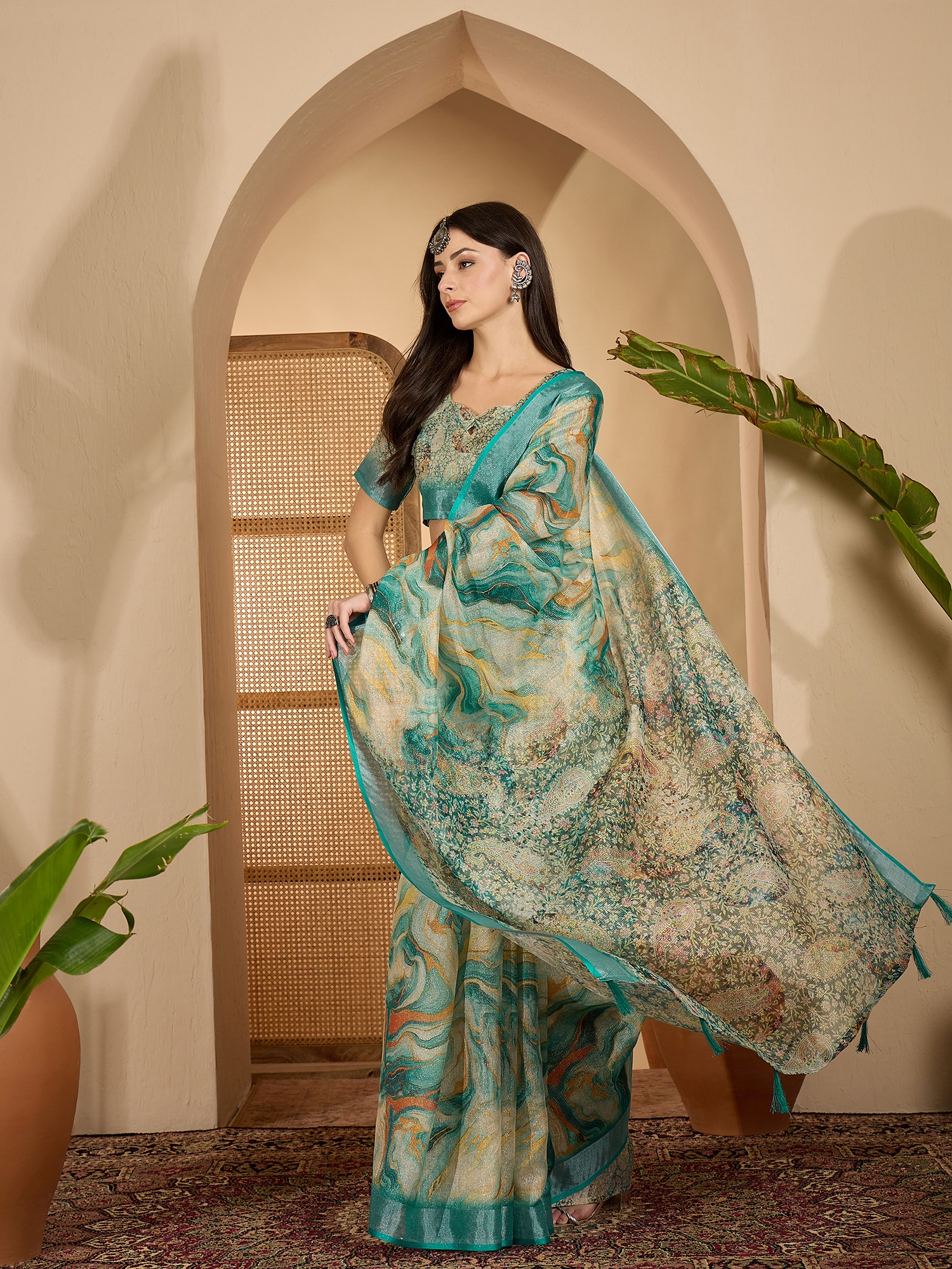• Saree Work-Digital Print ,Blouse Work- Linen Zari Gold