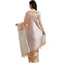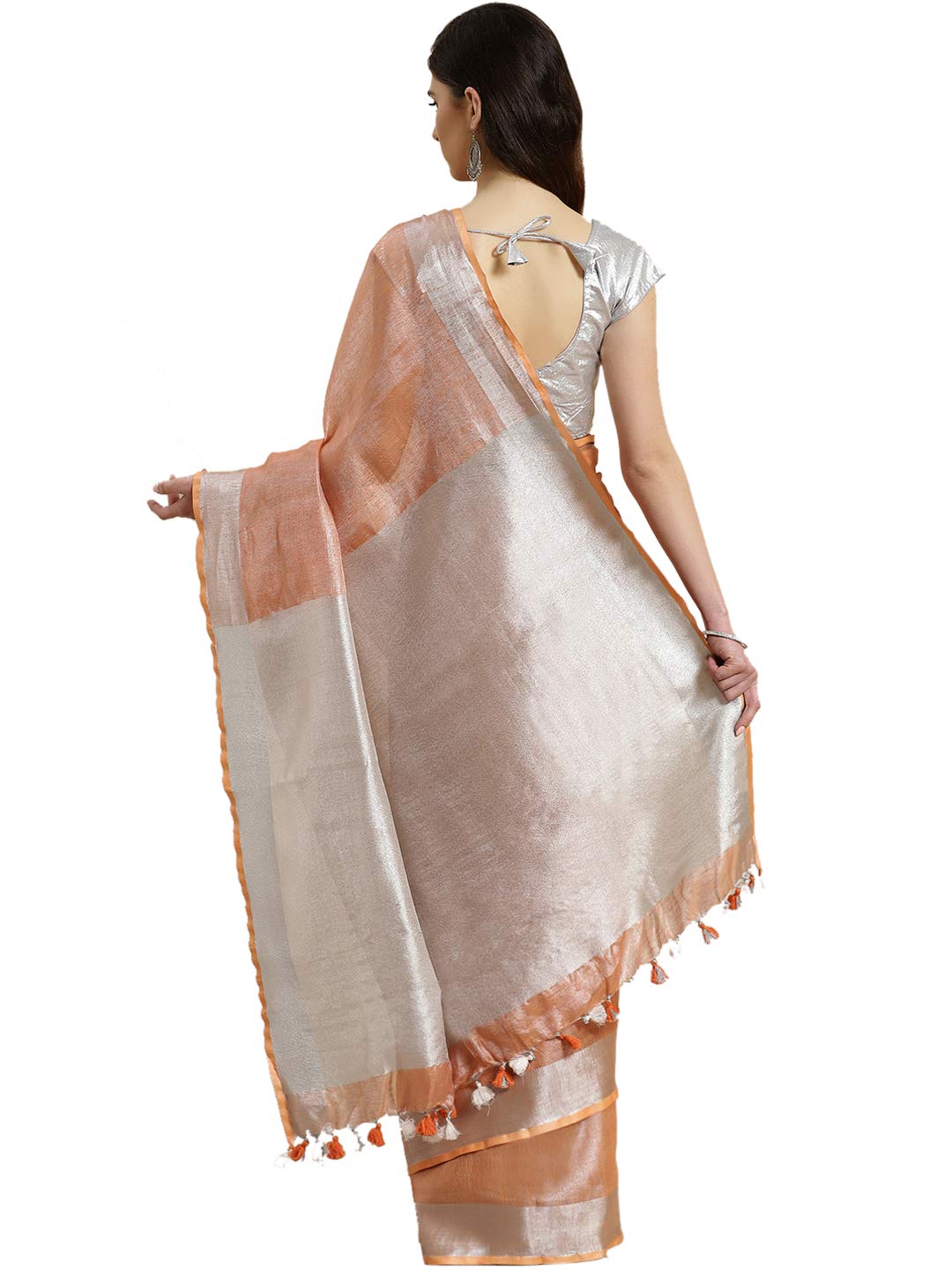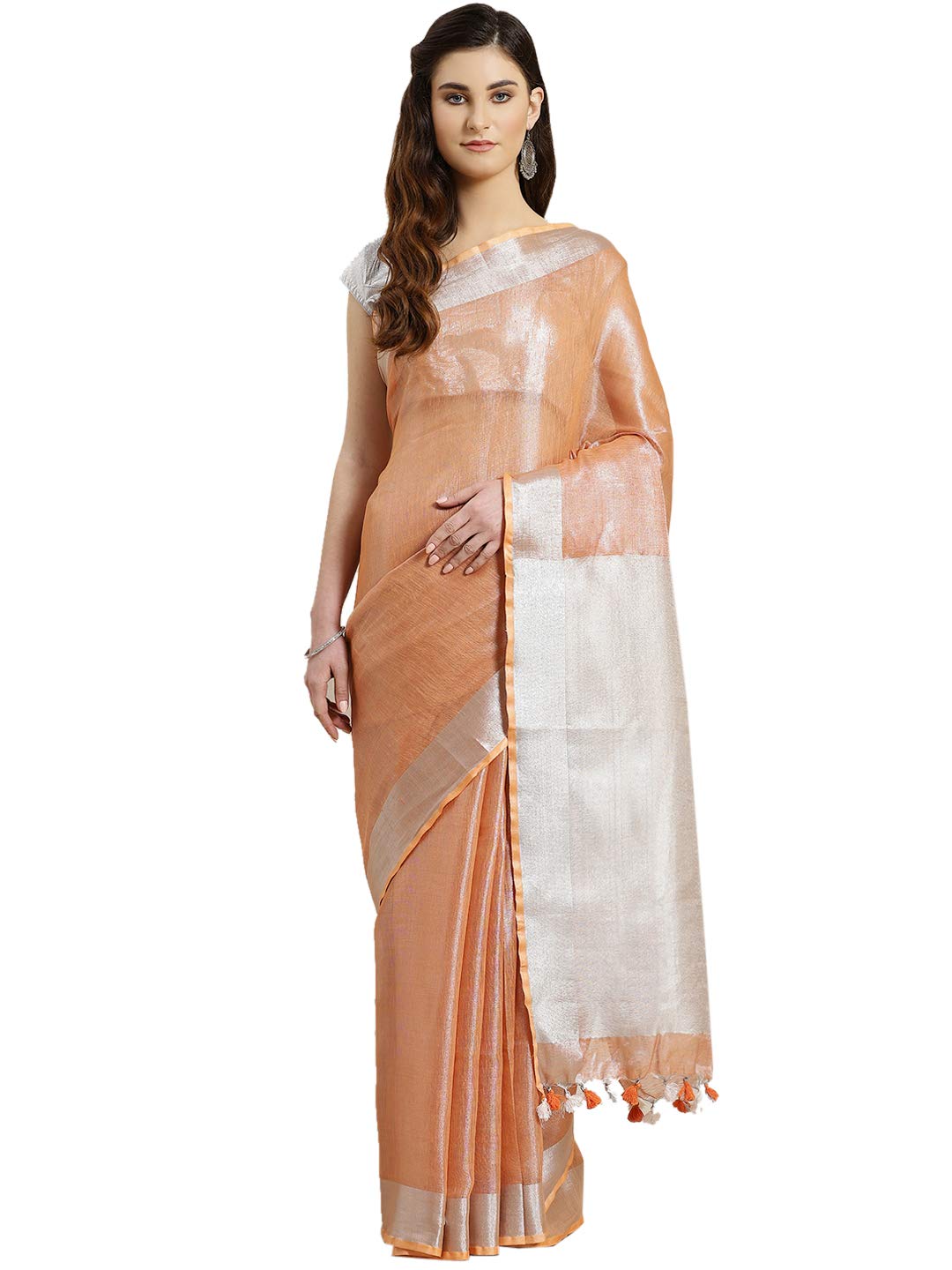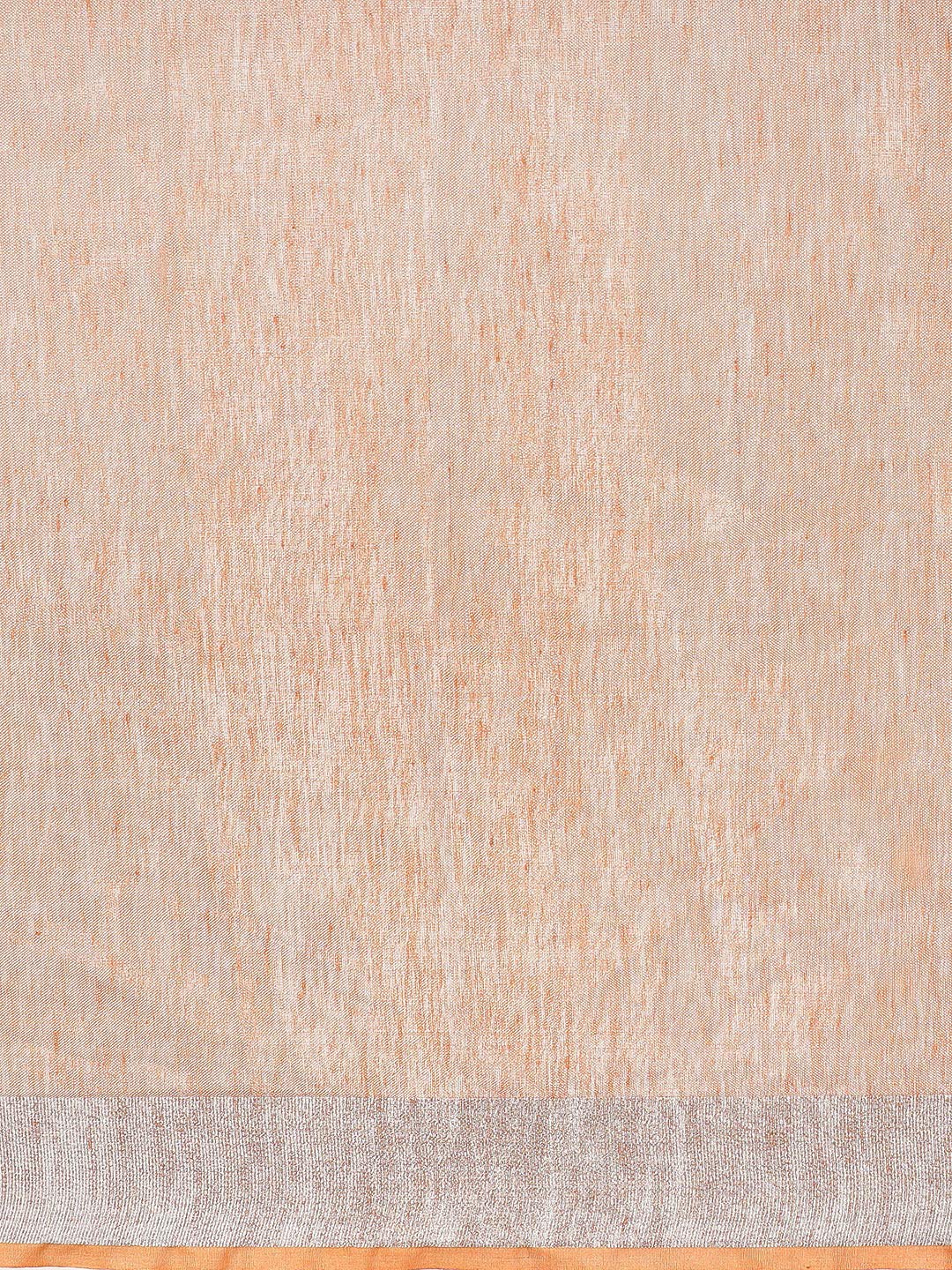A delicate blend of glowing tissue and textured linen fabric. The sari has a fine zari inclusions making apparel stand out. A timeless hand crafted piece to give you a chic and classy style statement.