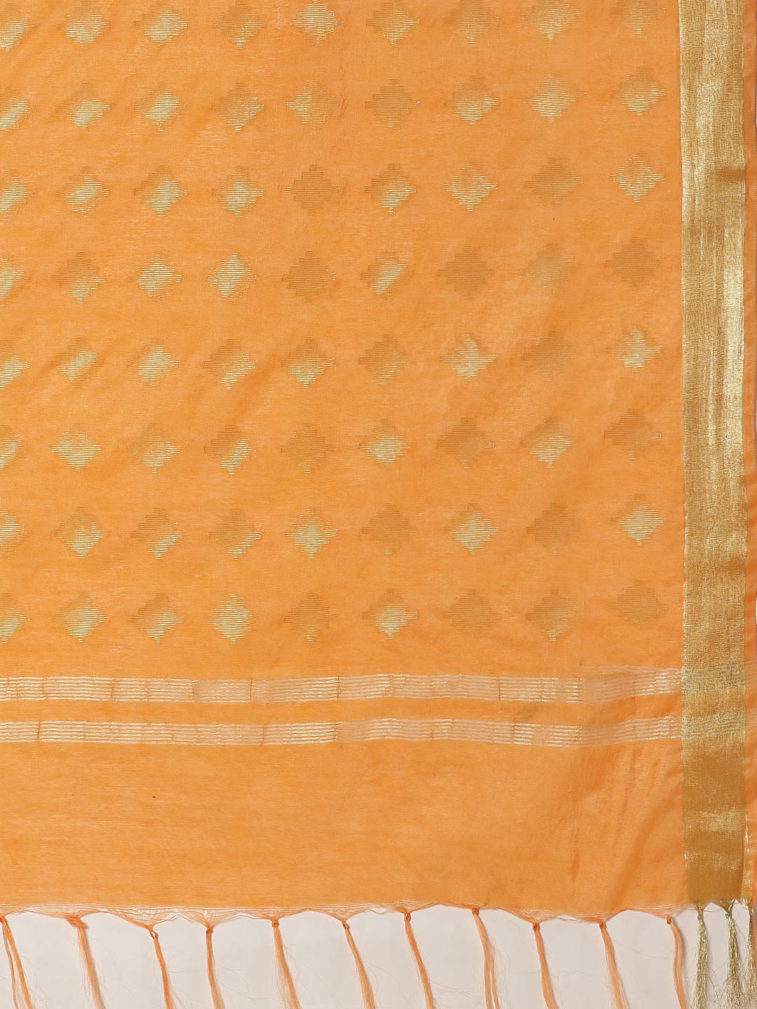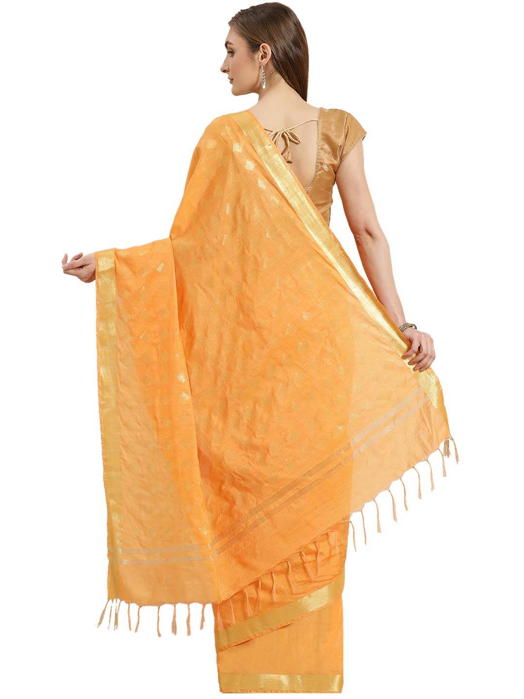Delicate and beautiful textured Kota Silk and Linen blended fabric. The sari has a fine zari woven design making apparel stand out. A timeless handcrafted piece to give you a chic and classy style statement.