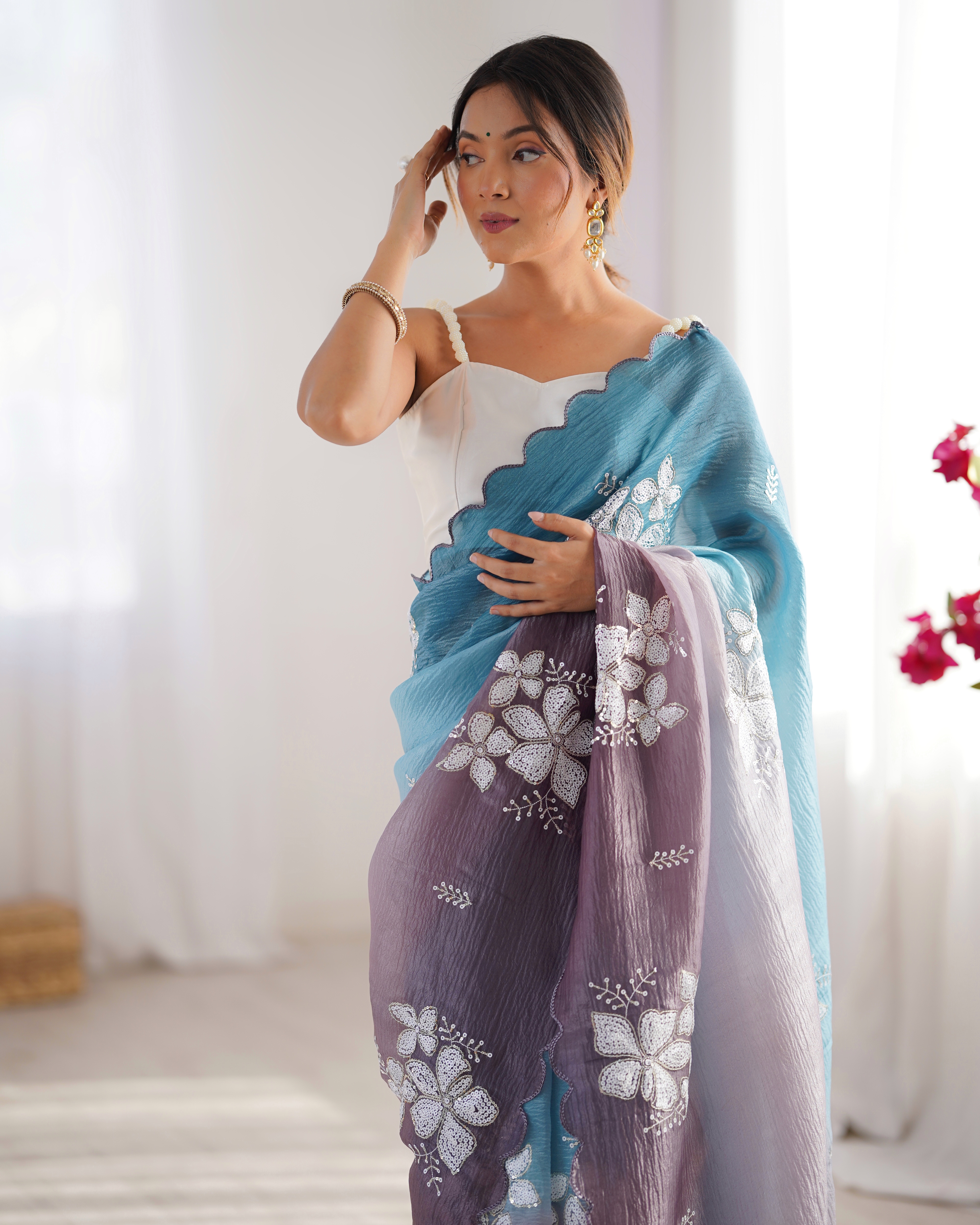 Looking These Party Wear Saree in Fine Dual Shaded Colored.These Saree Are Crunchy Crush And Blouse is Satin Silk Fabricated.Its Beautified With Pedding Color Printed With Designer Dual Sequance Embroidery Work.