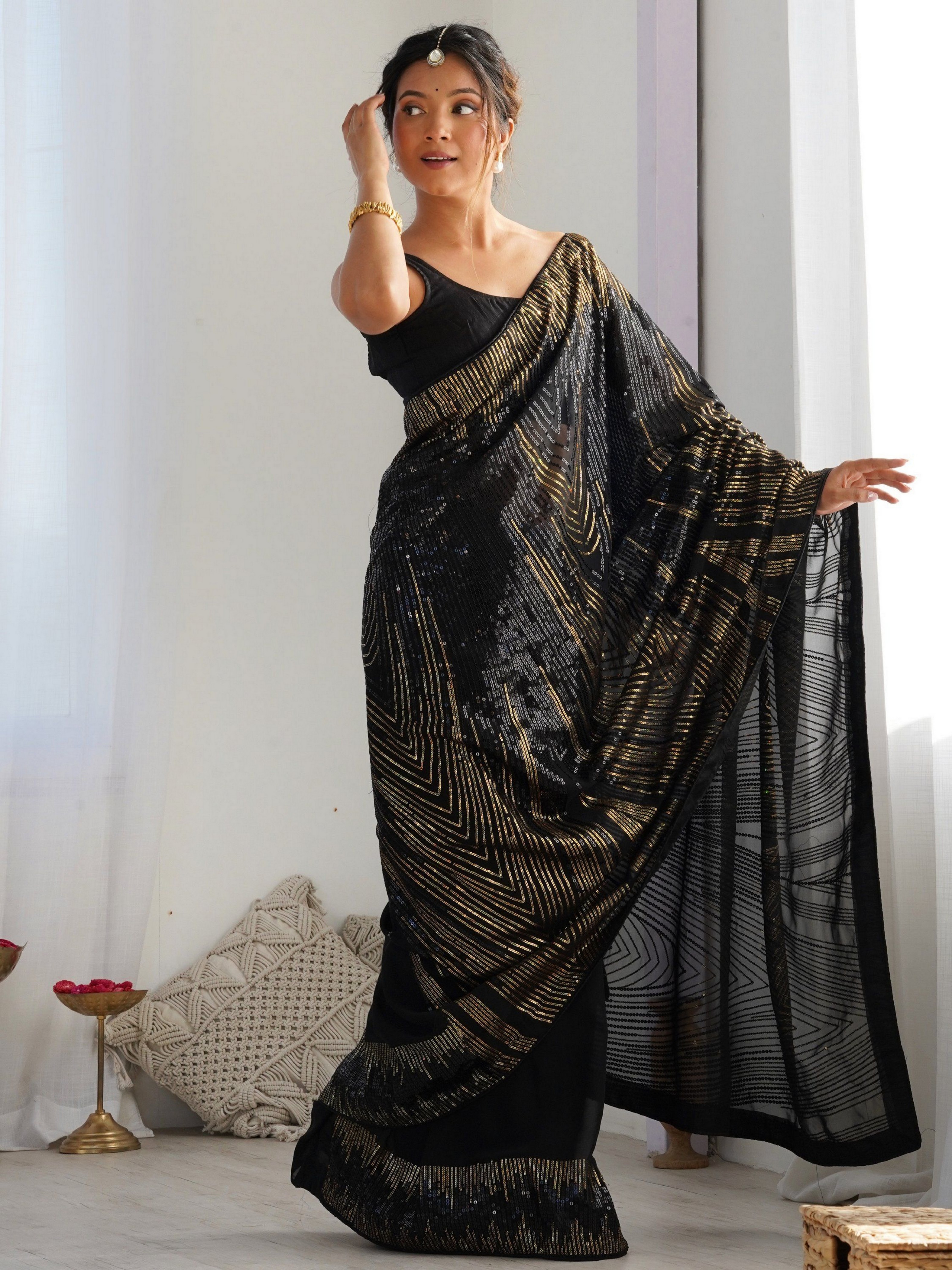 Black Color Bollywood Style Smart Embroidered Ceremonial Saree