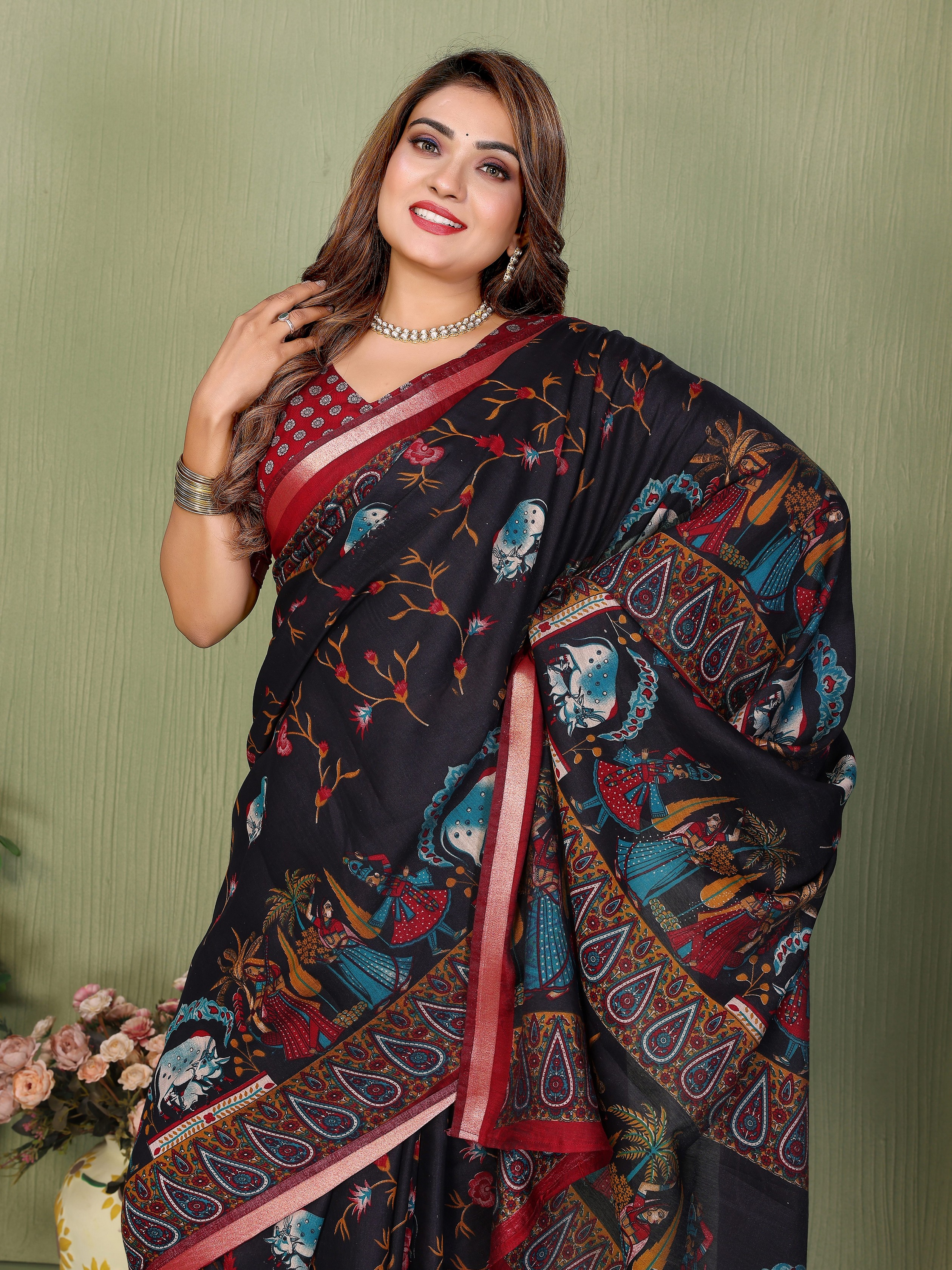 Black Color Mul Cotton Designer Kalamkari Printed Ethnic Partywear Saree