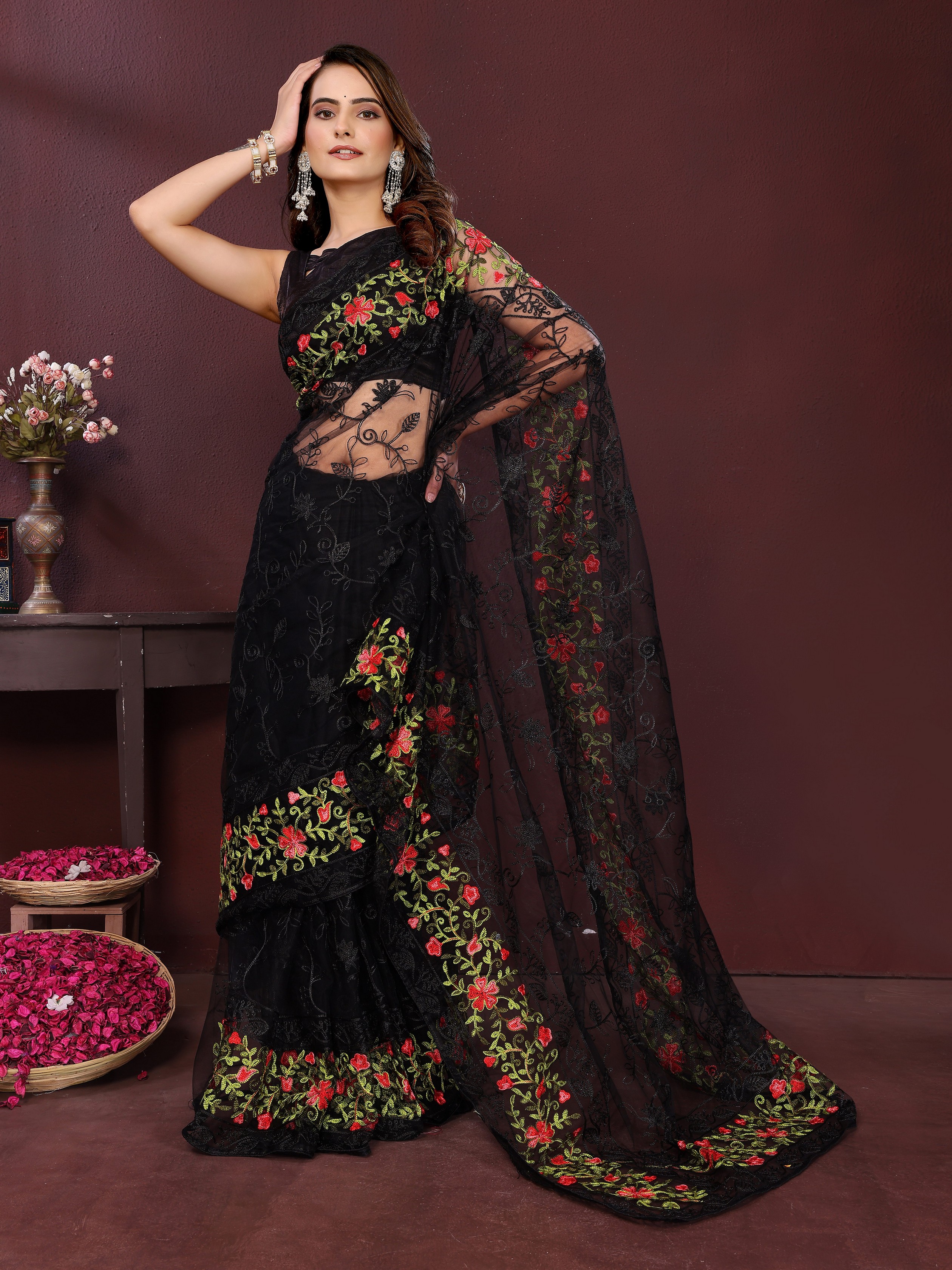 Black Color Net Fabric Designer Embroidery Work Ethnic Partywear Saree