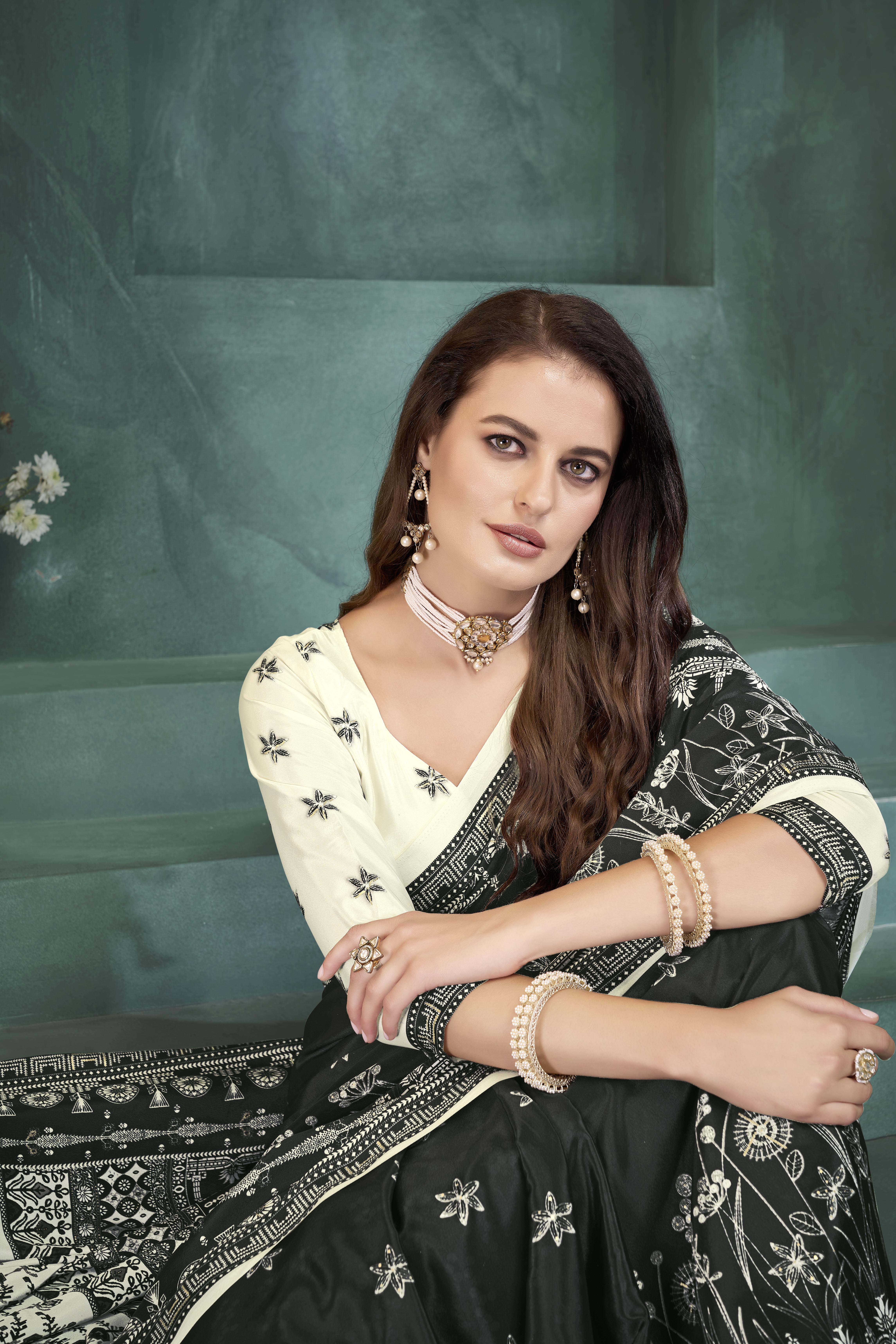 Black Color Sophisticated Position Digital Foil Printed Crepe Silk Saree