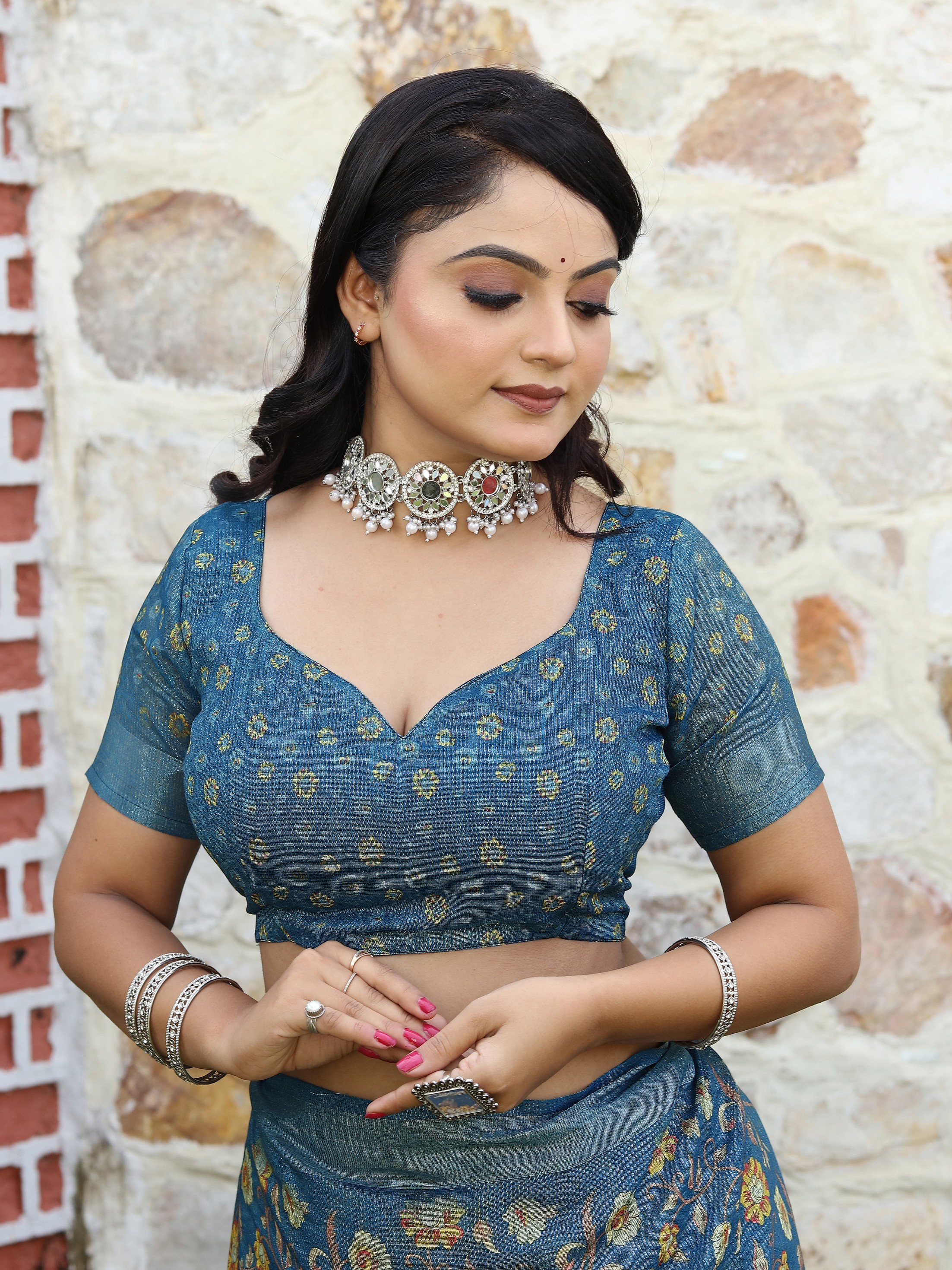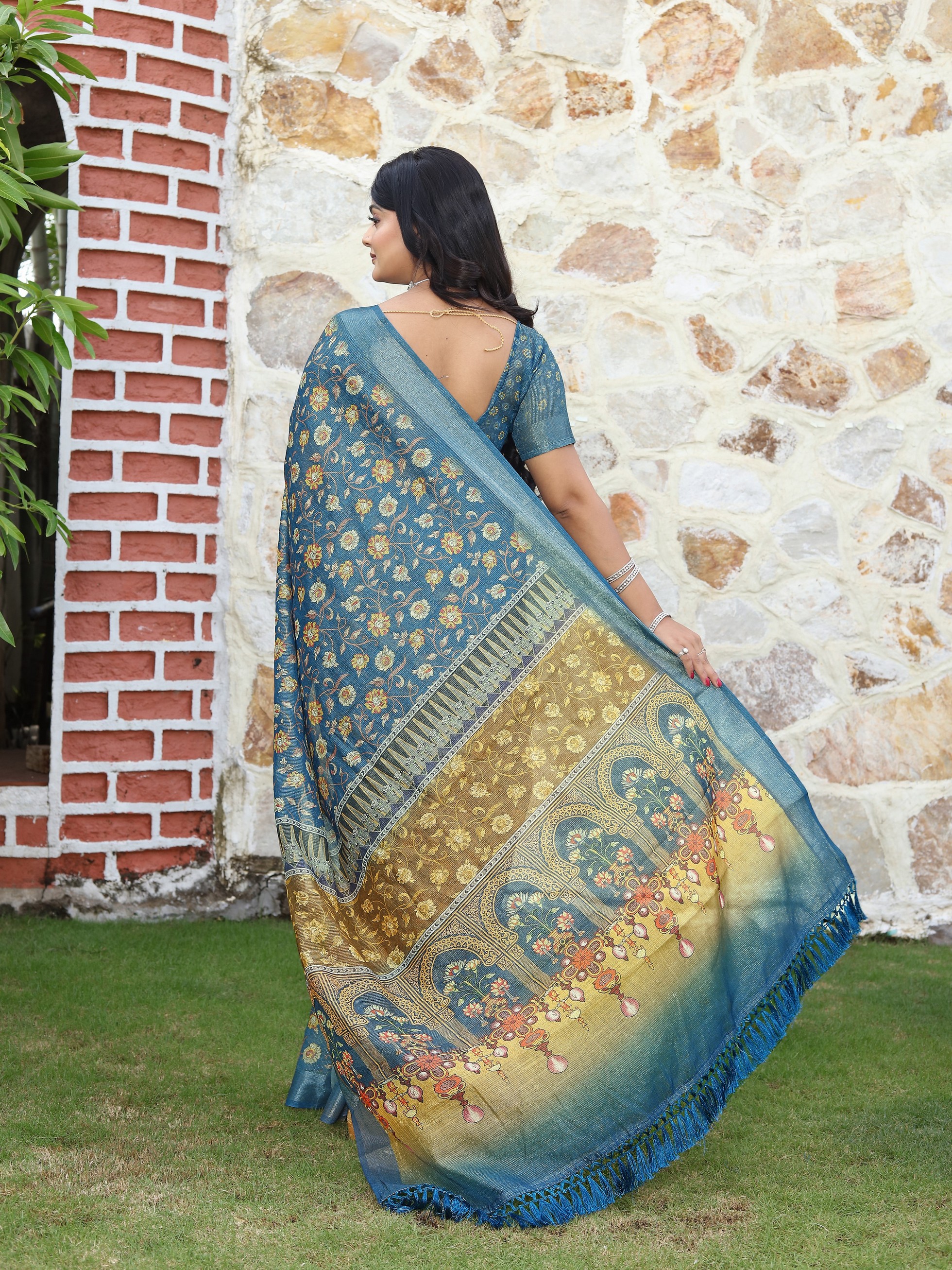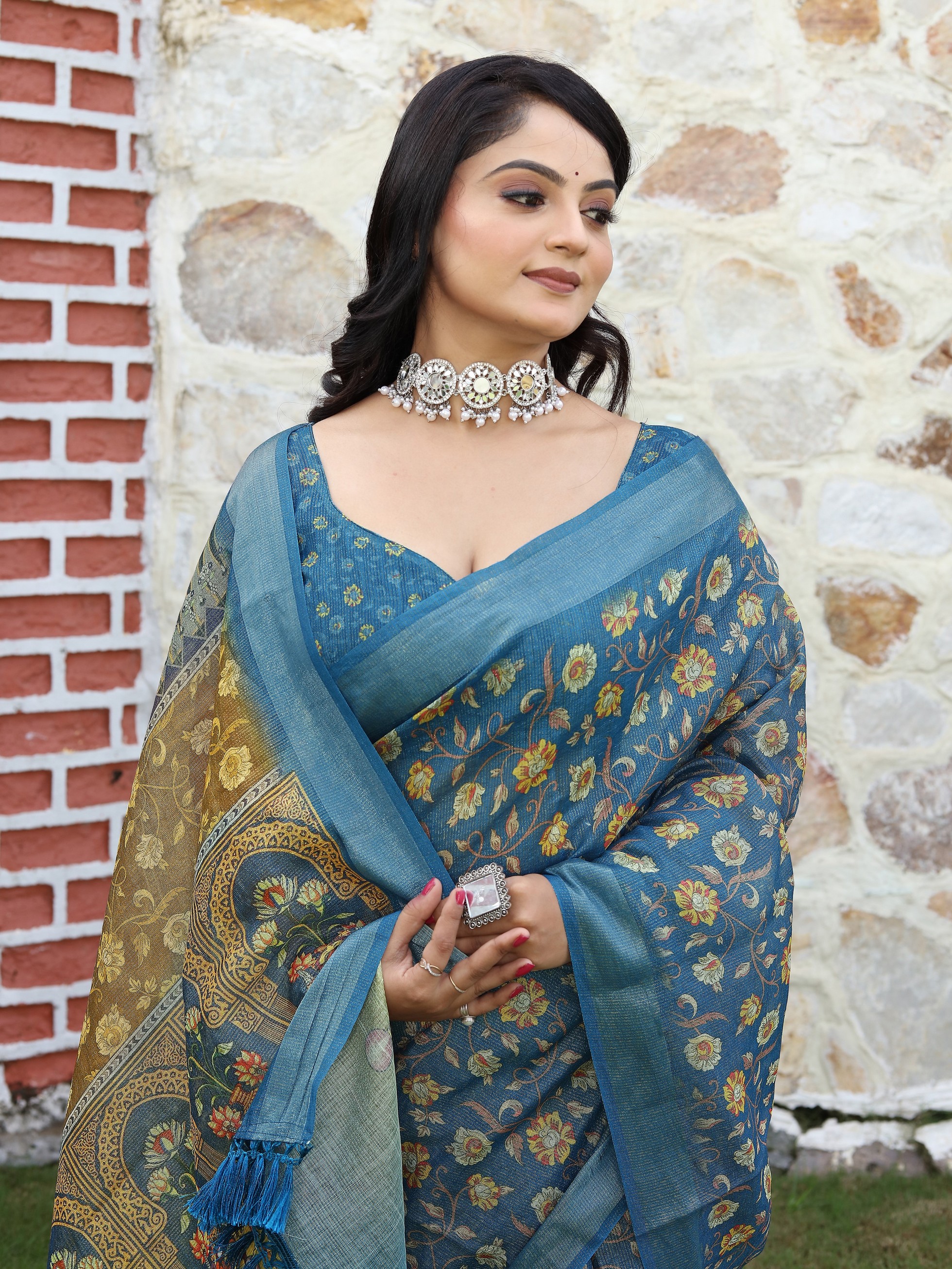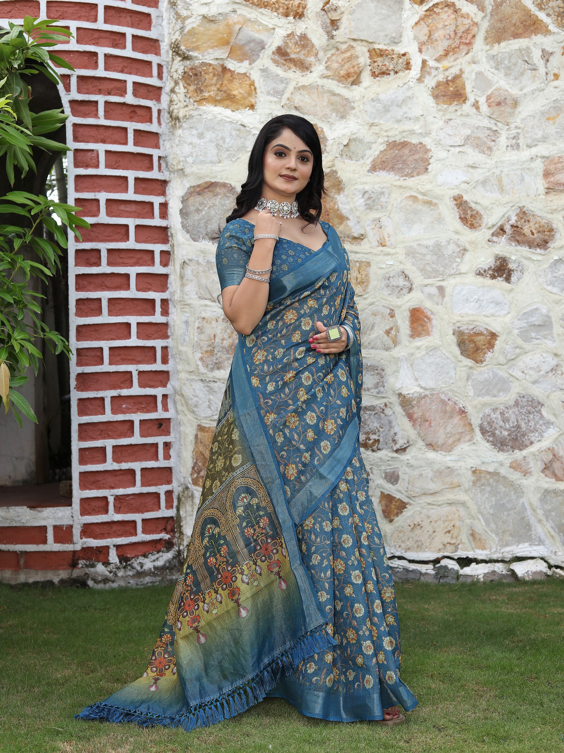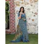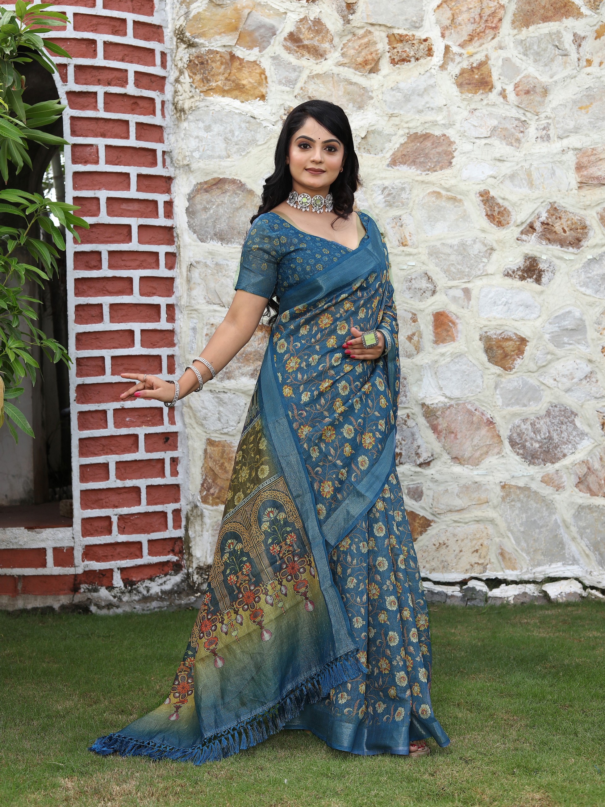 Blue Color Cotton Shimmer Fabric Smart Printed Saree With Woven Border