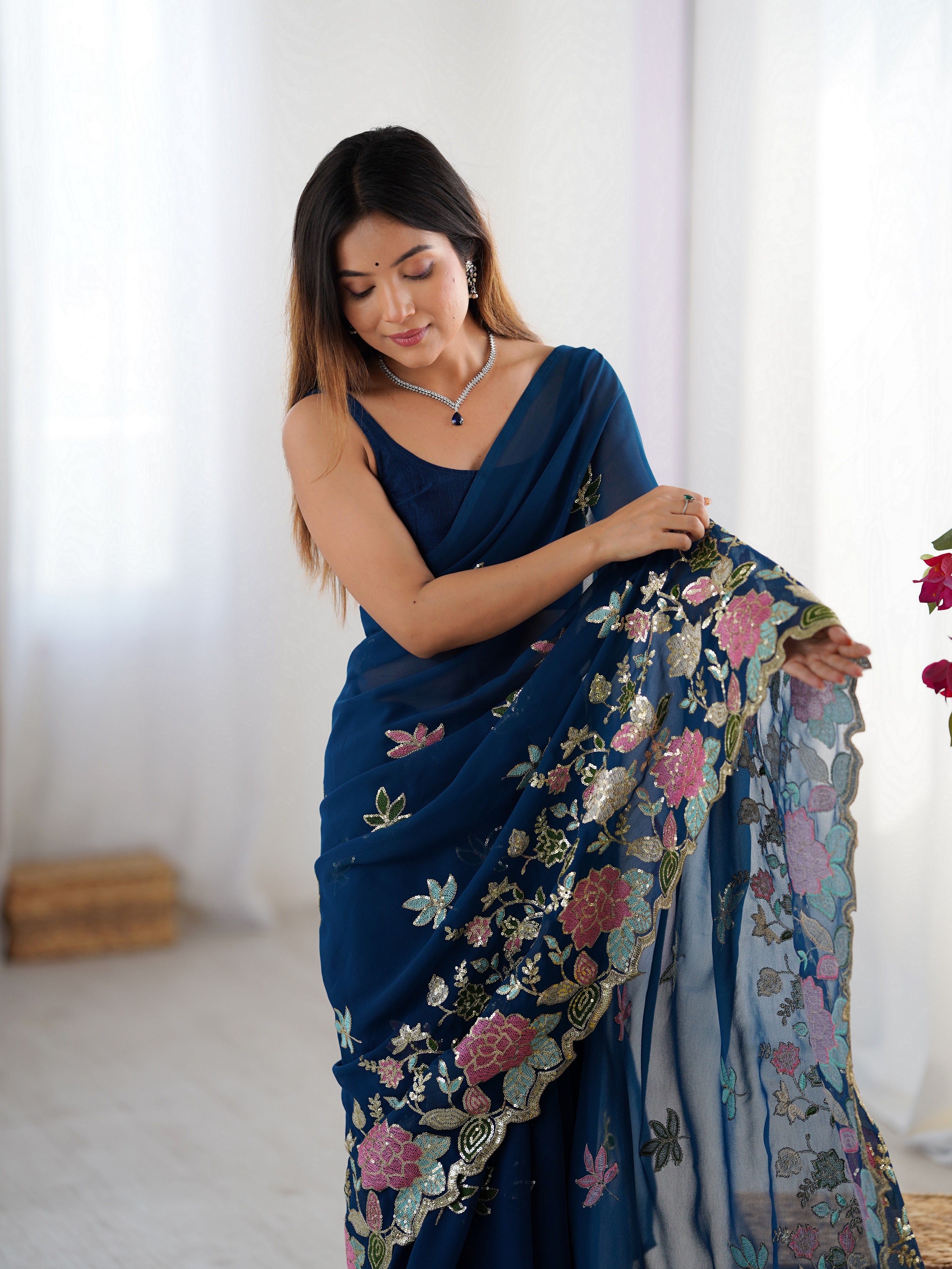 Blue Color Floral Embroidered Sequins Work Partywear Saree