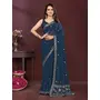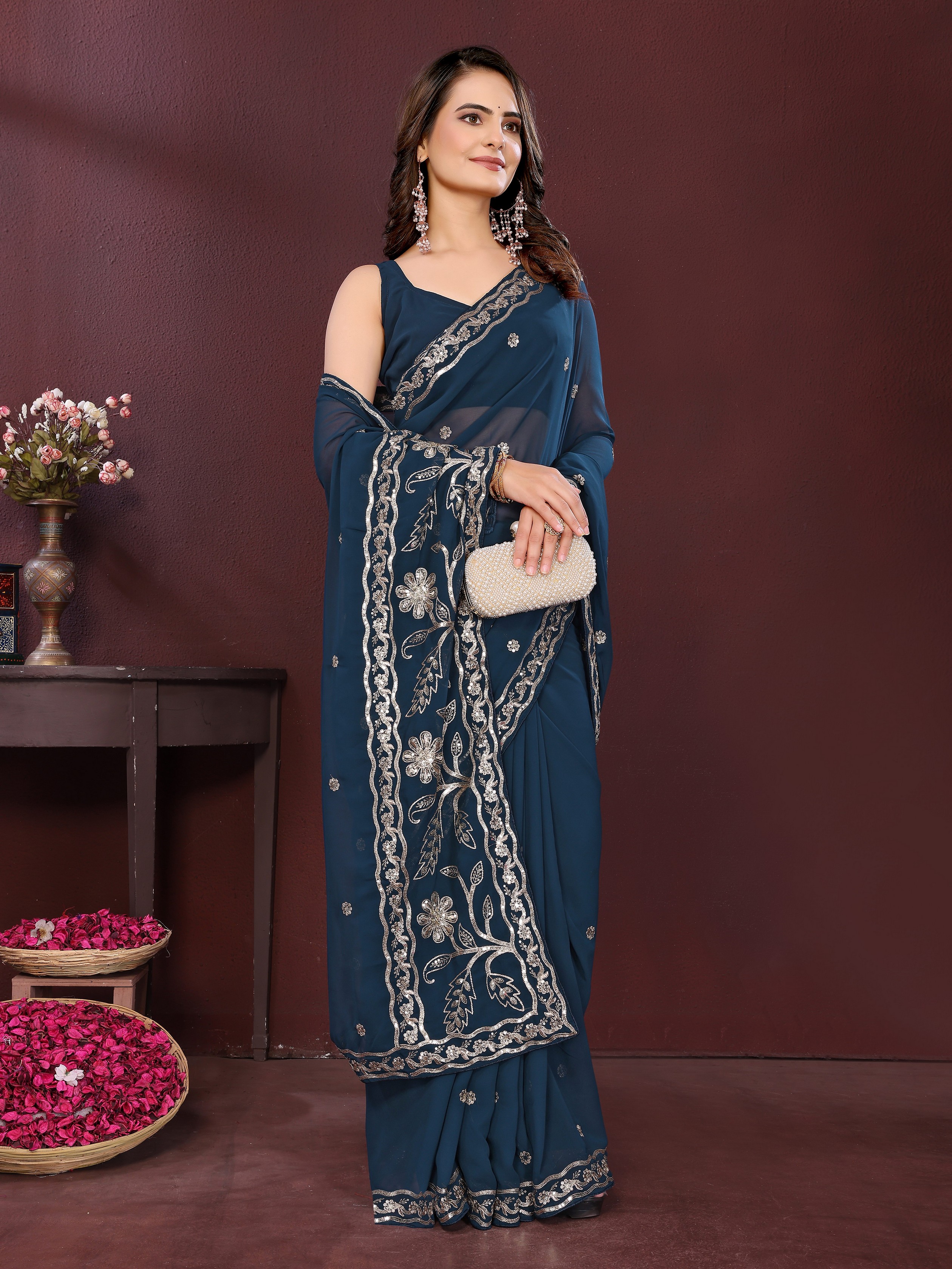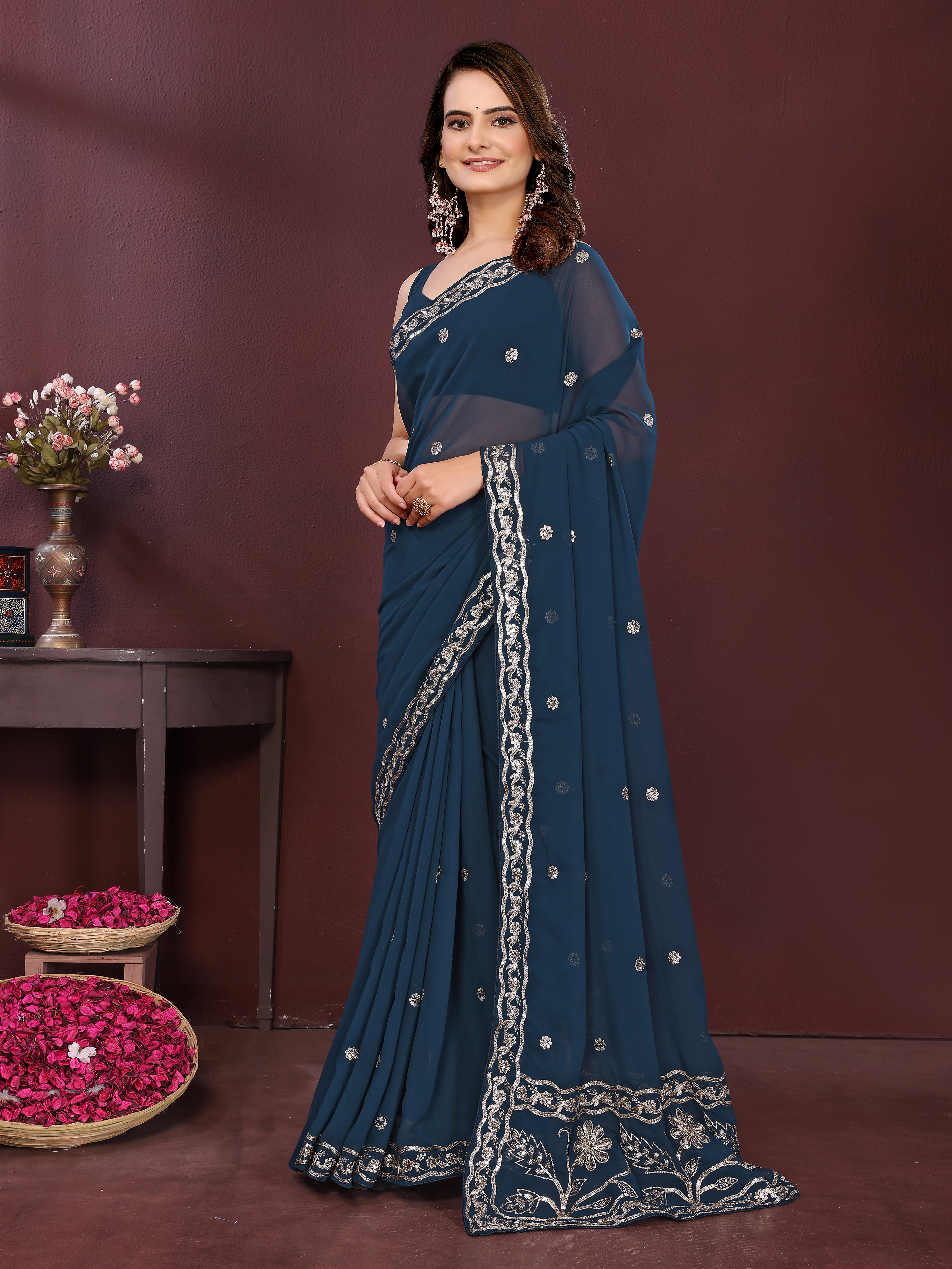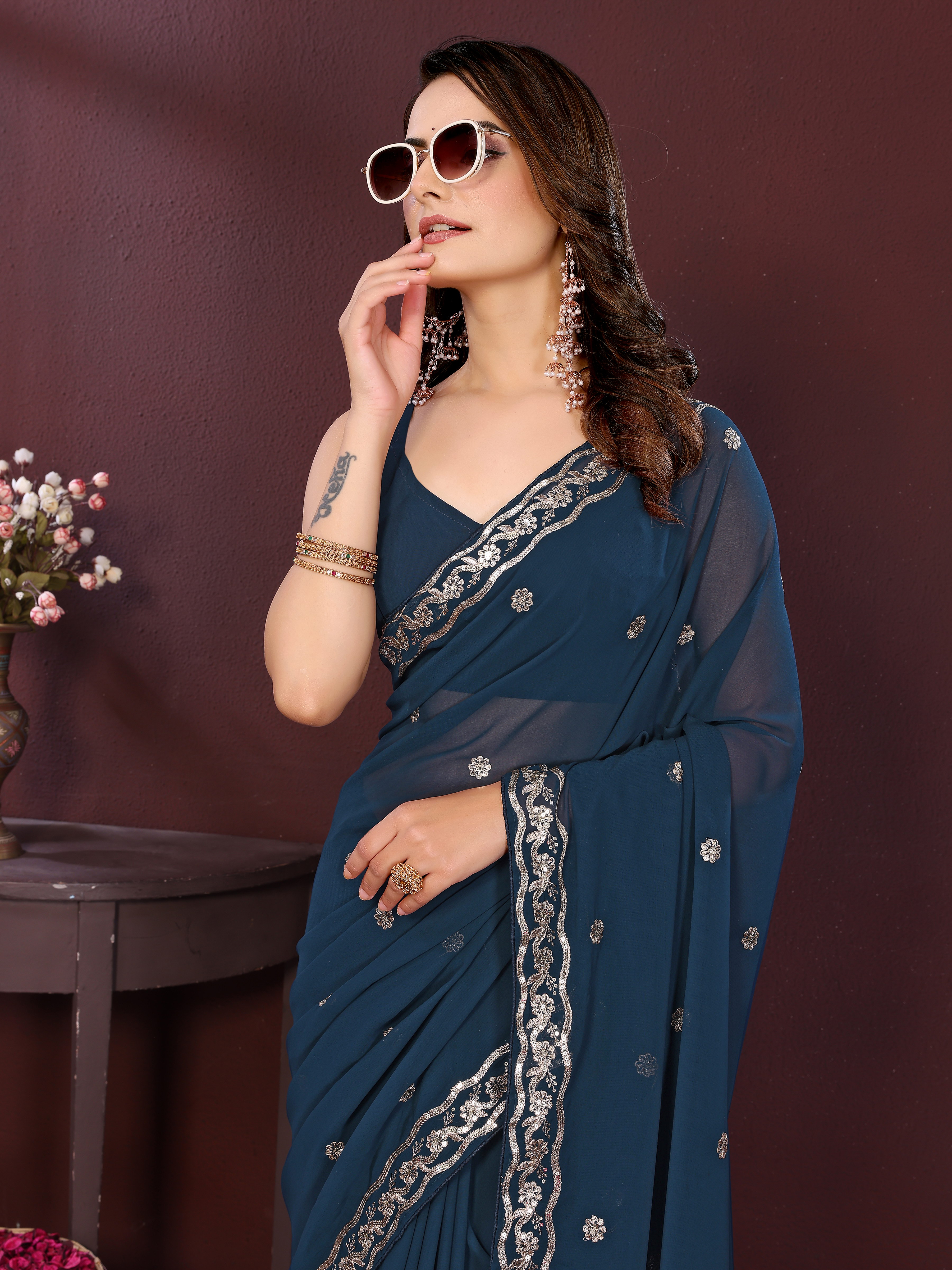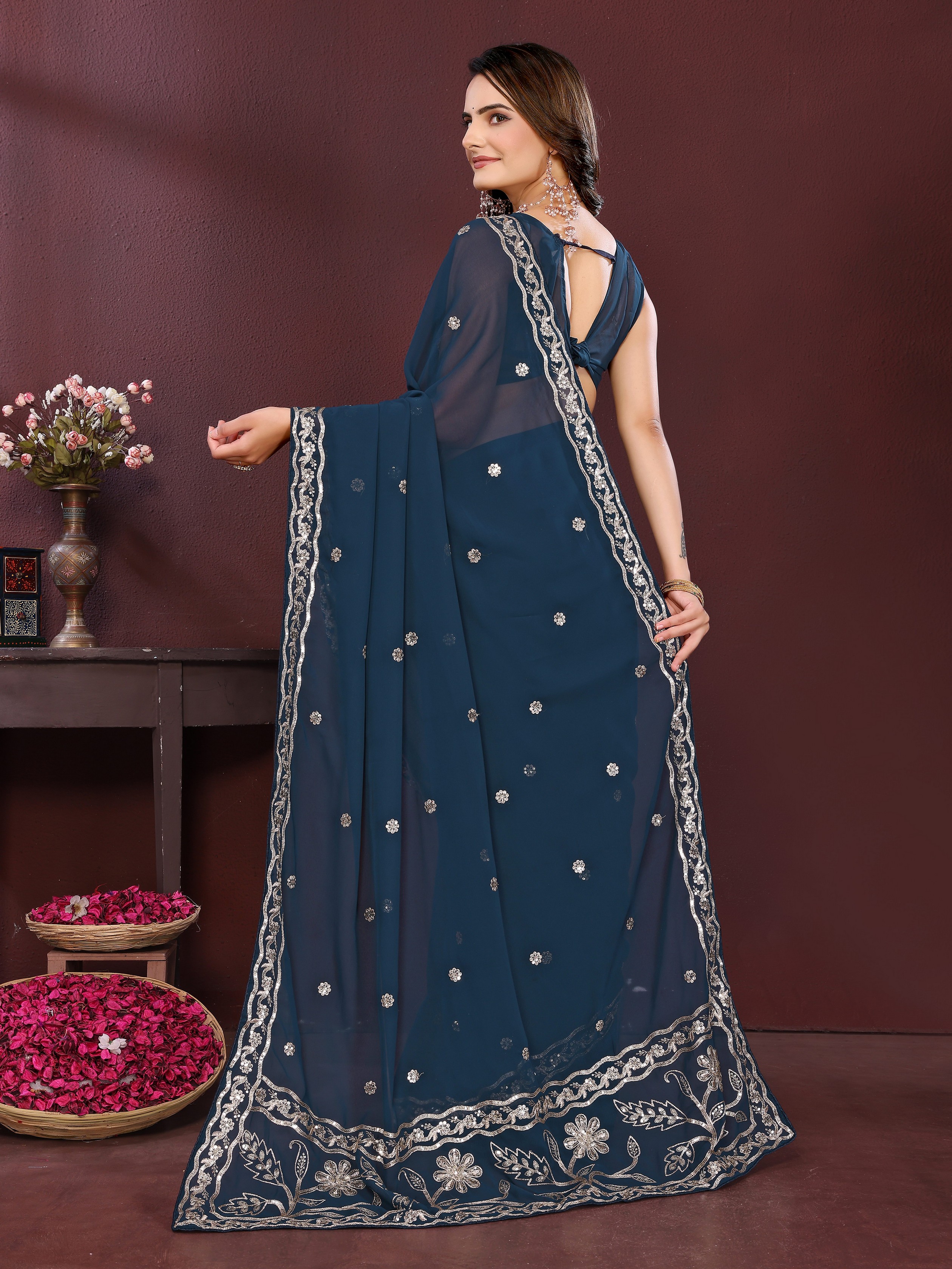 Blue Color Georgette fabric Designer Embroidery Work Ethnic Partywear Saree
