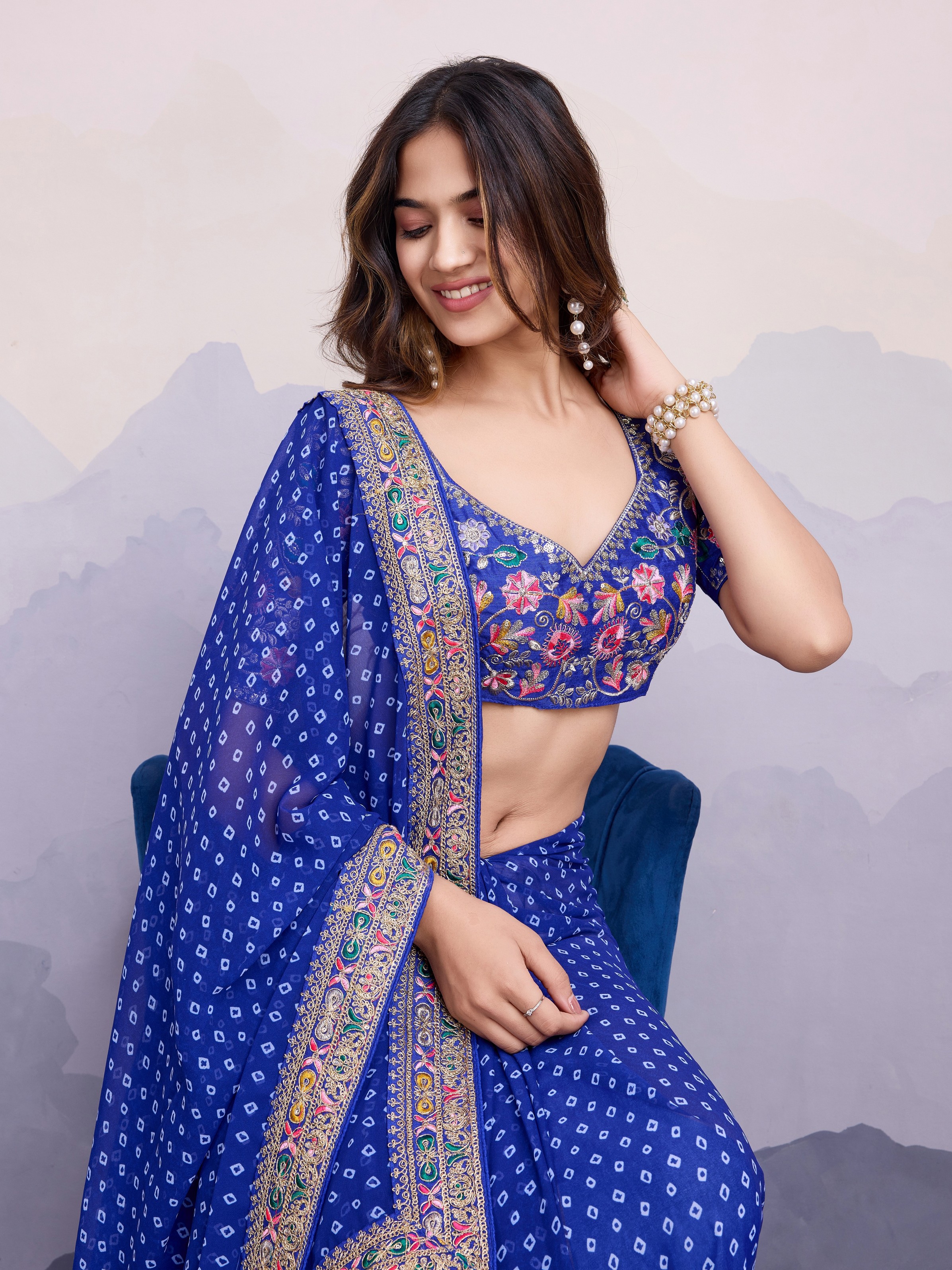 Blue Color Georgette Fabric Designer Partywear Bandhej Saree