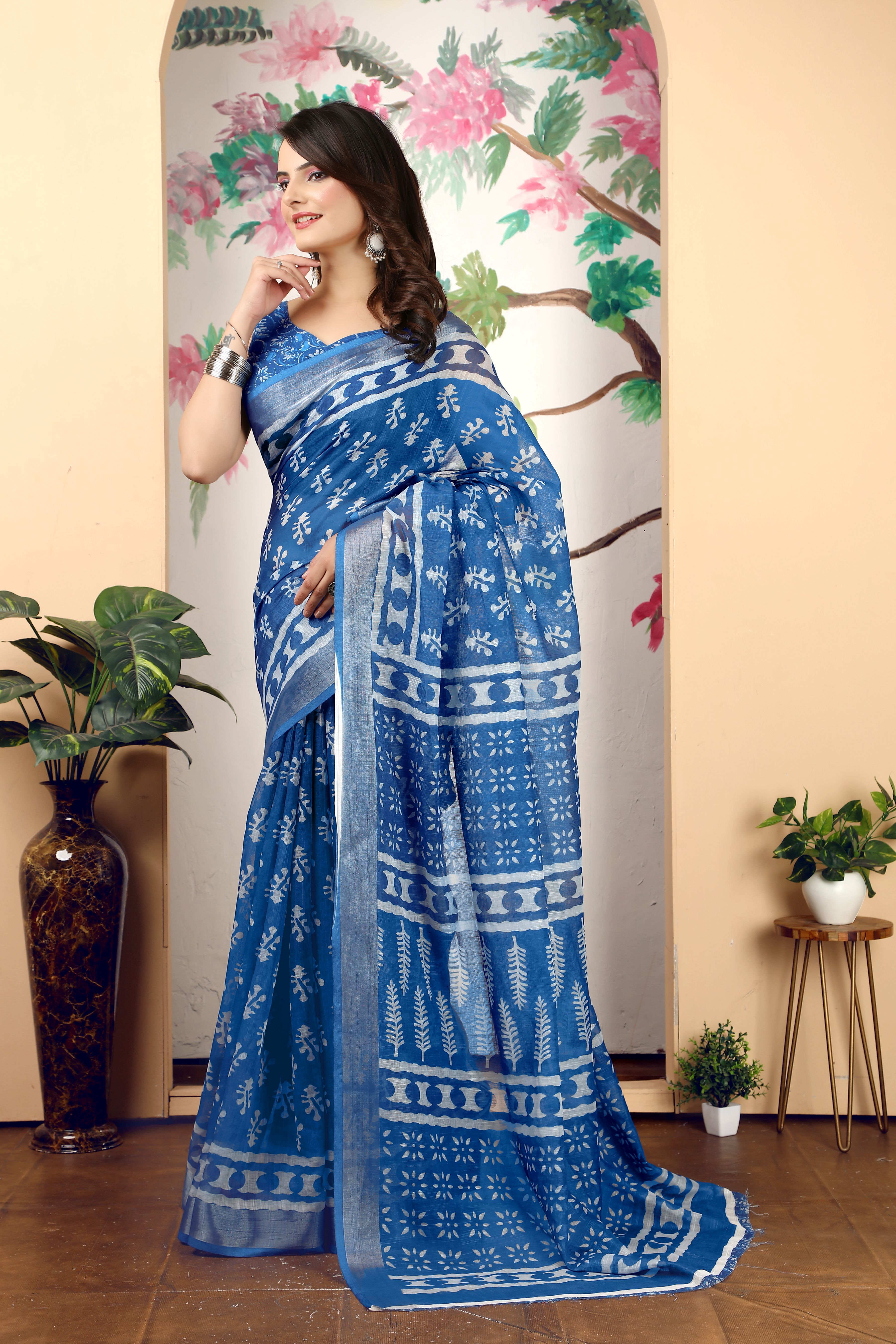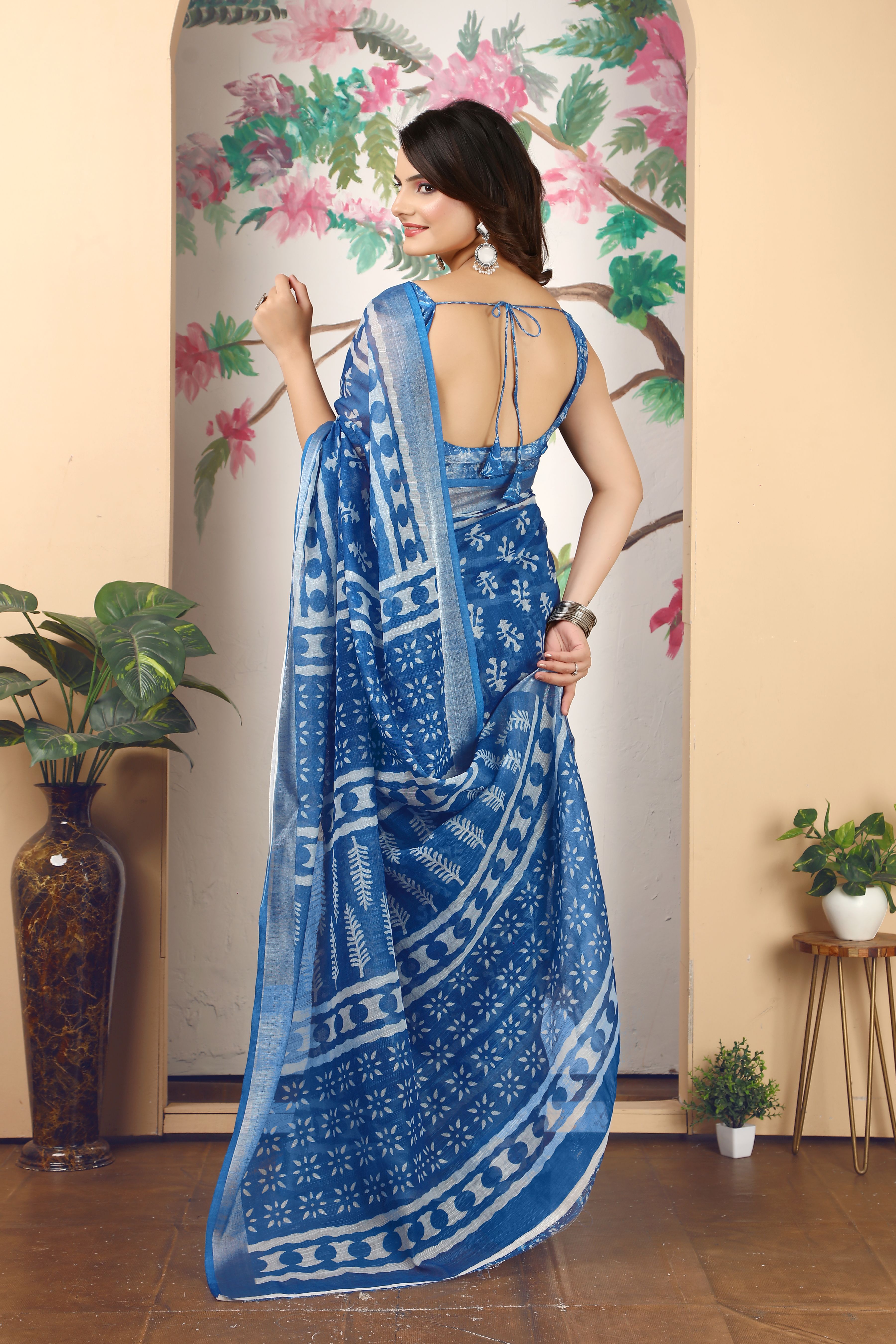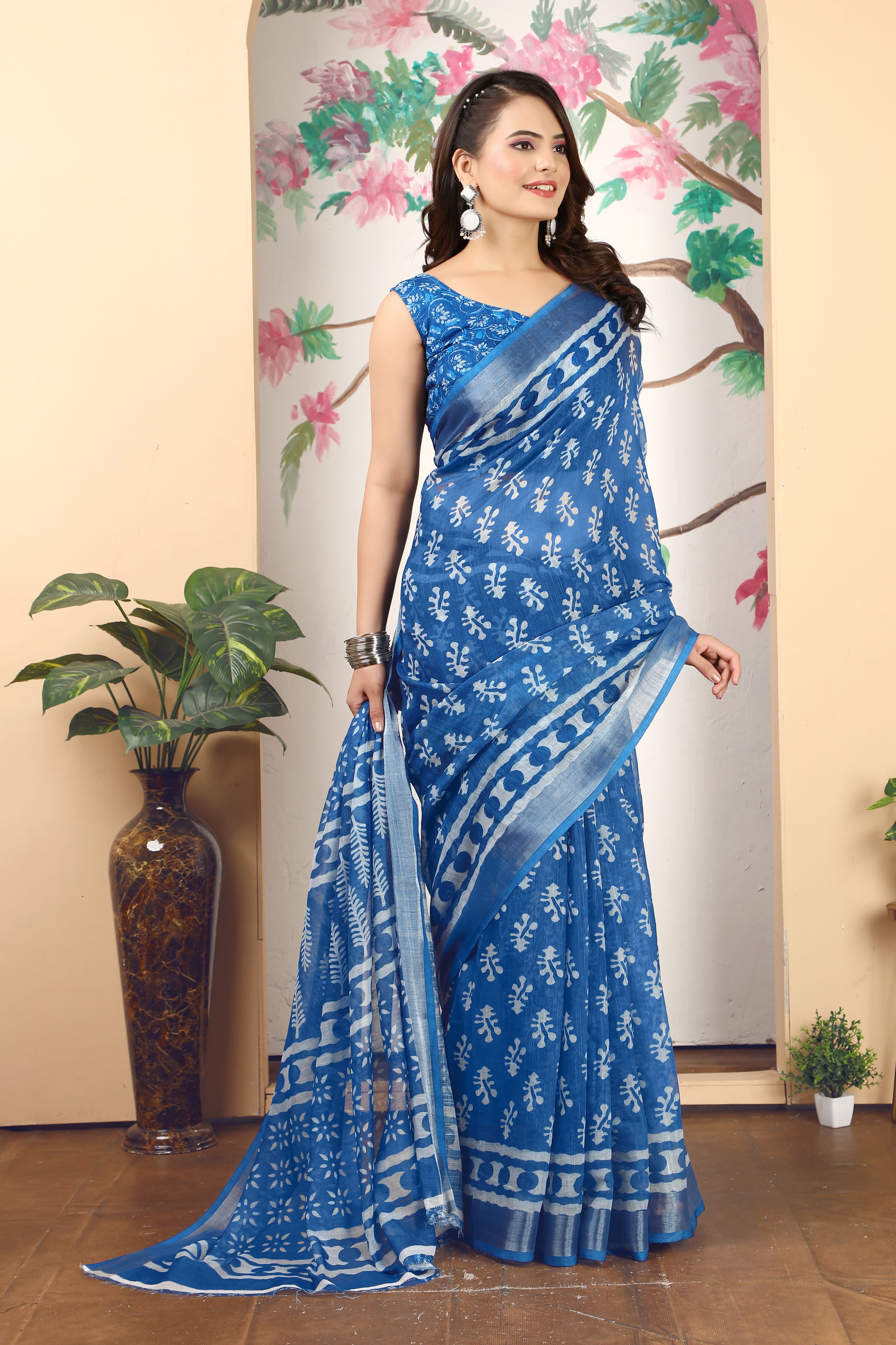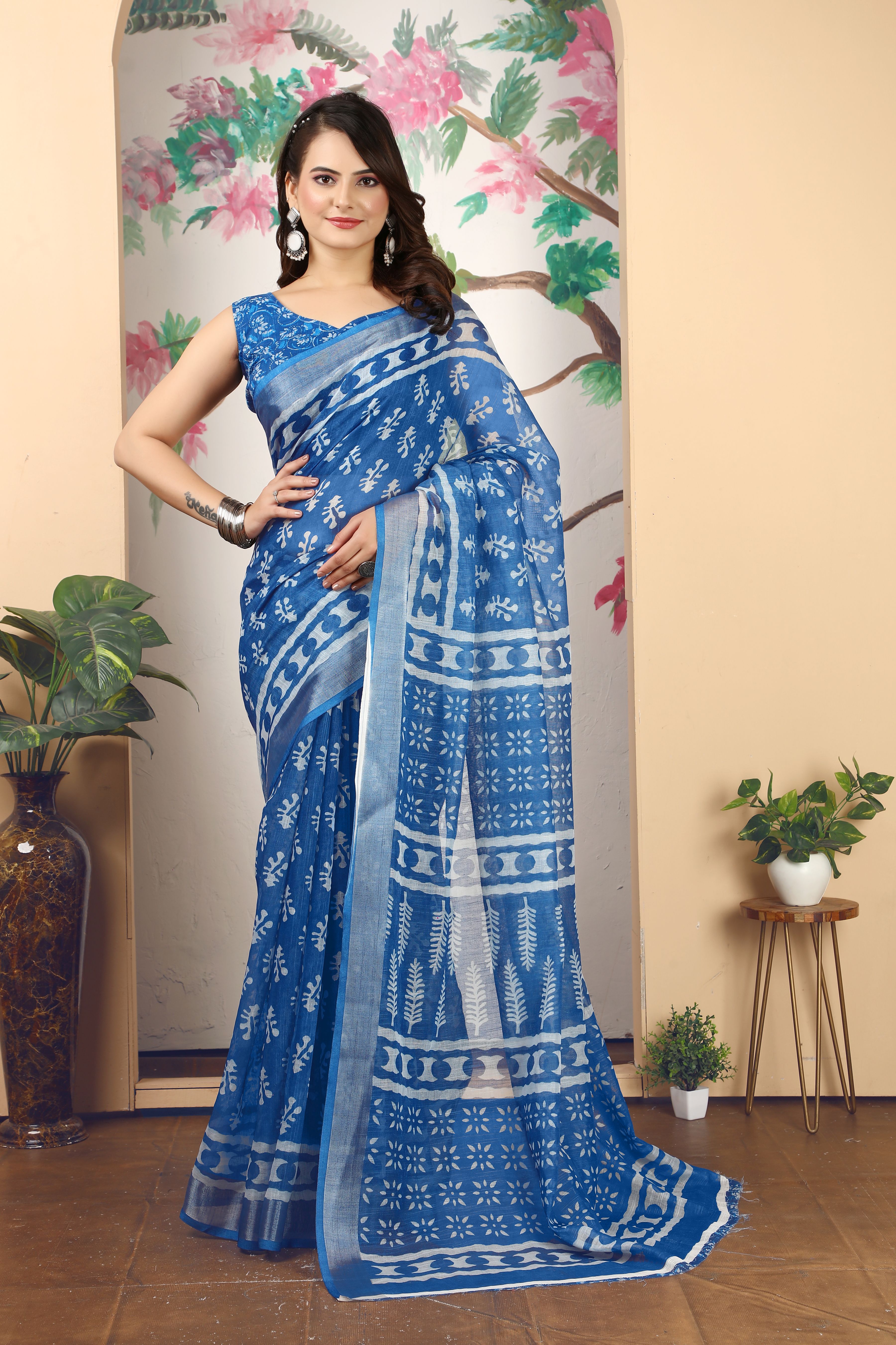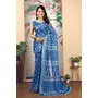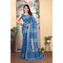 Blue Color Linen Cotton Fabric Beautiful Printed Saree