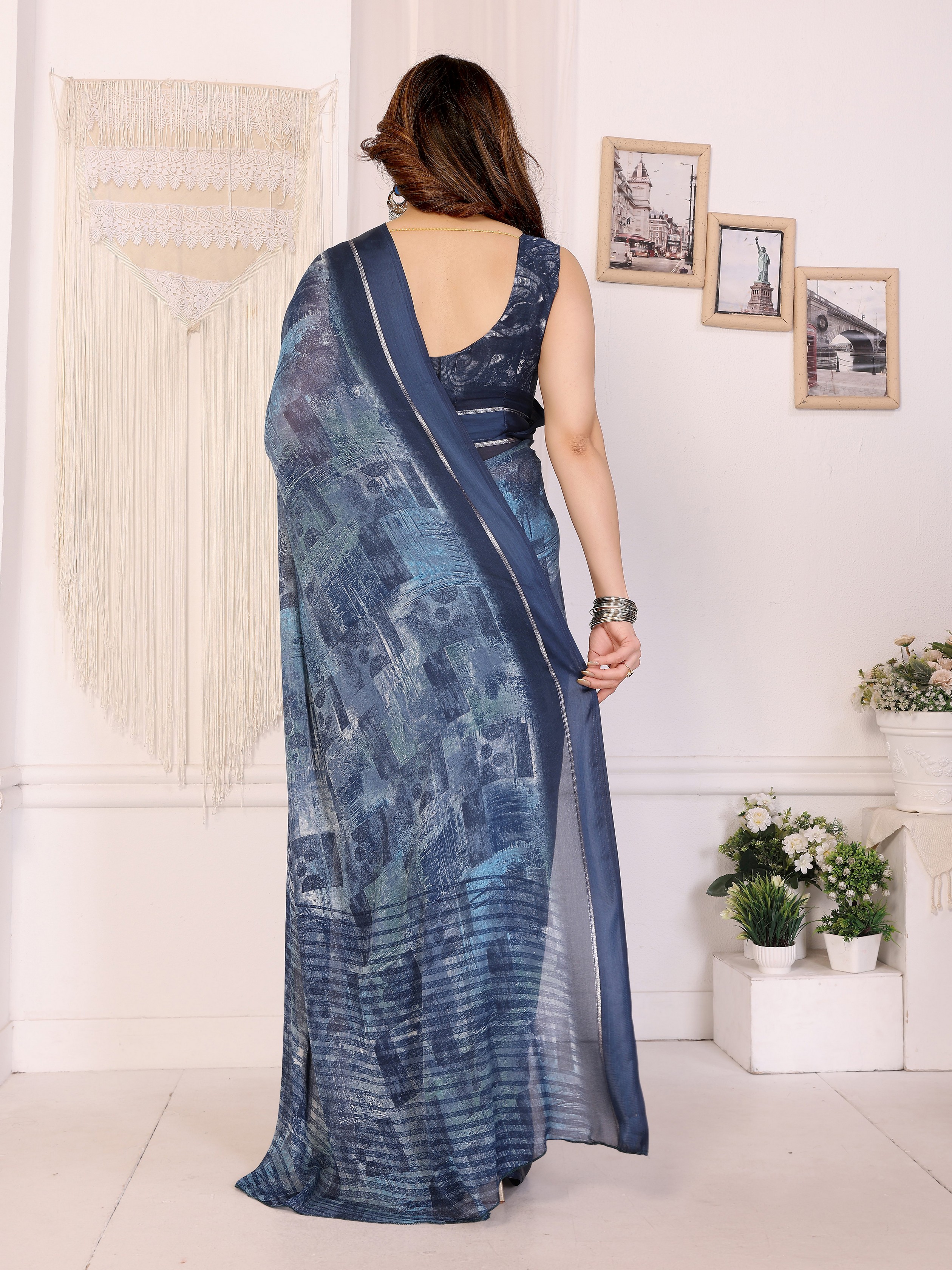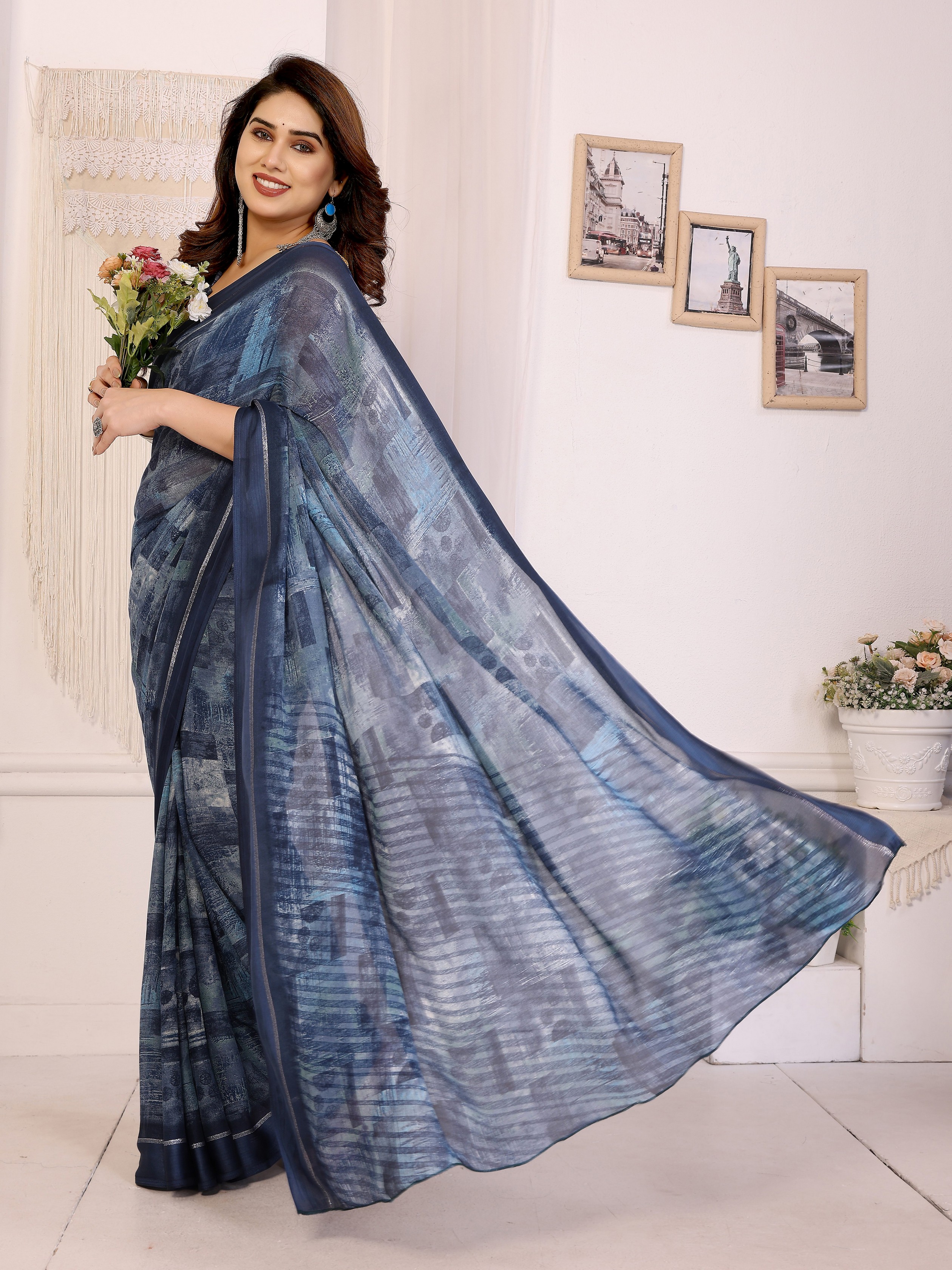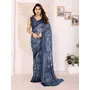 Blue Color Moss Satin Patta Fabric Designer Printed Saree