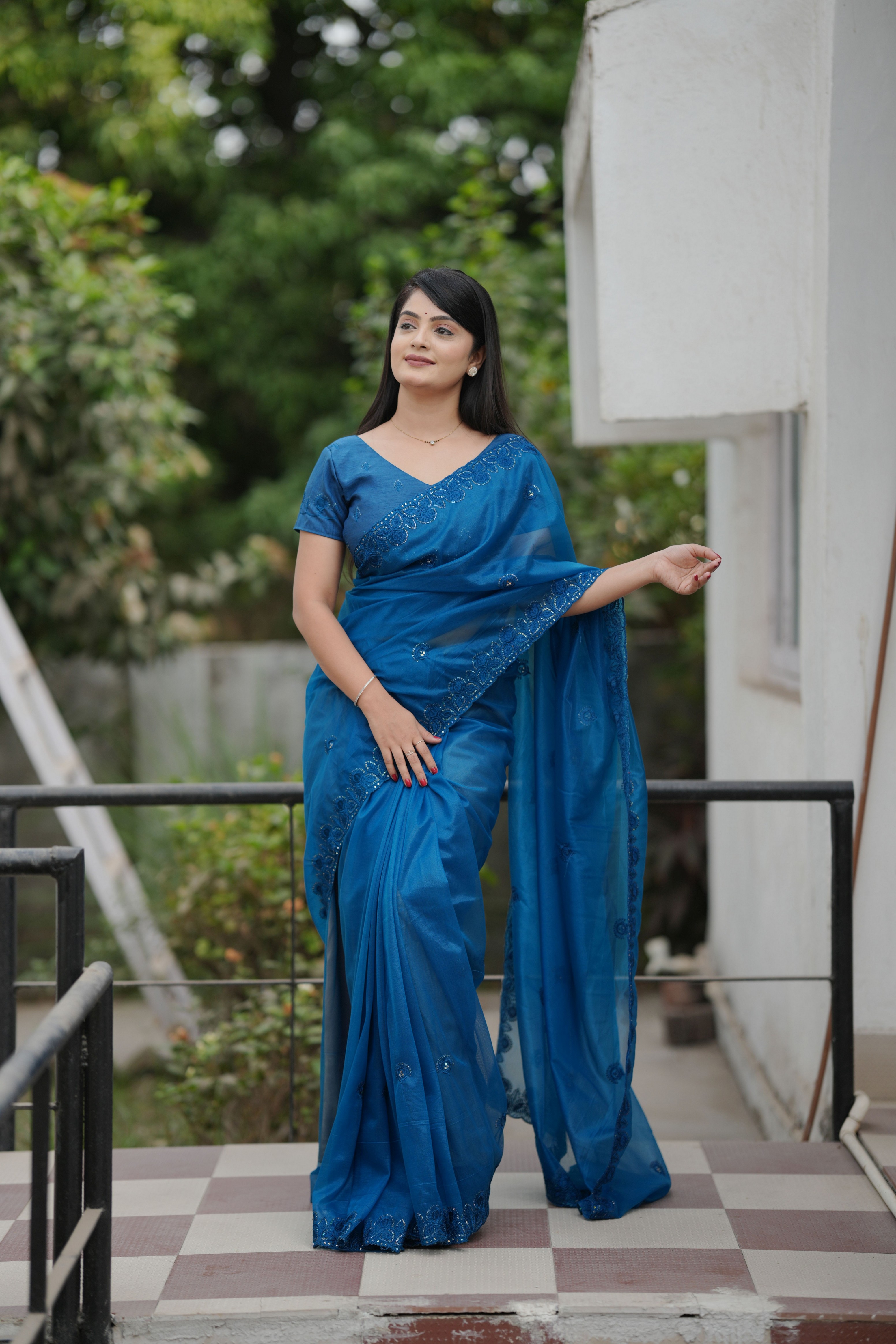 Blue Color Twill Net Fabric Sequins Work Ceremonial Saree