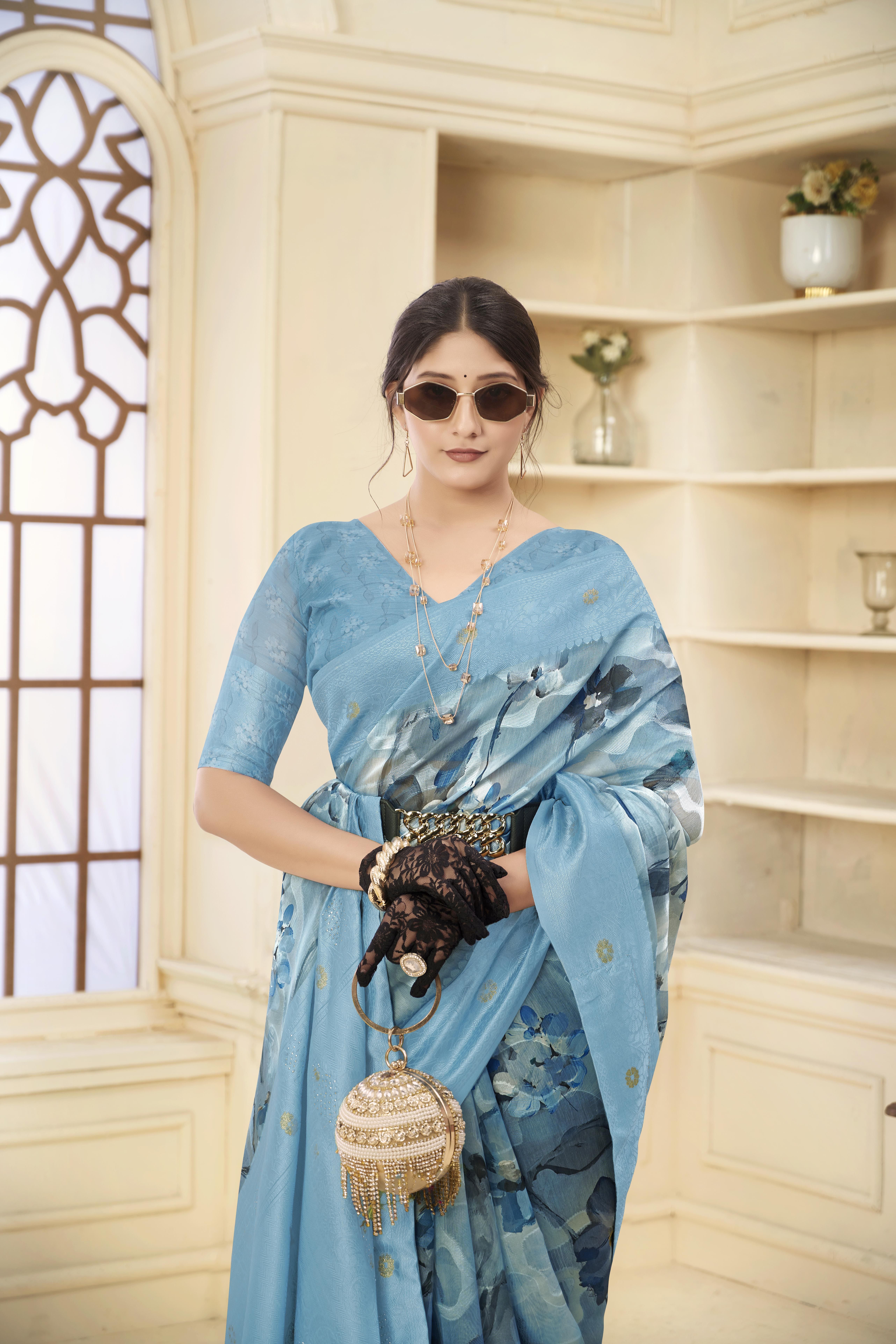 Blue Color Wevon Jacquard Designer With Printed Rich Silk Fabric Stylish Ceremonial Saree