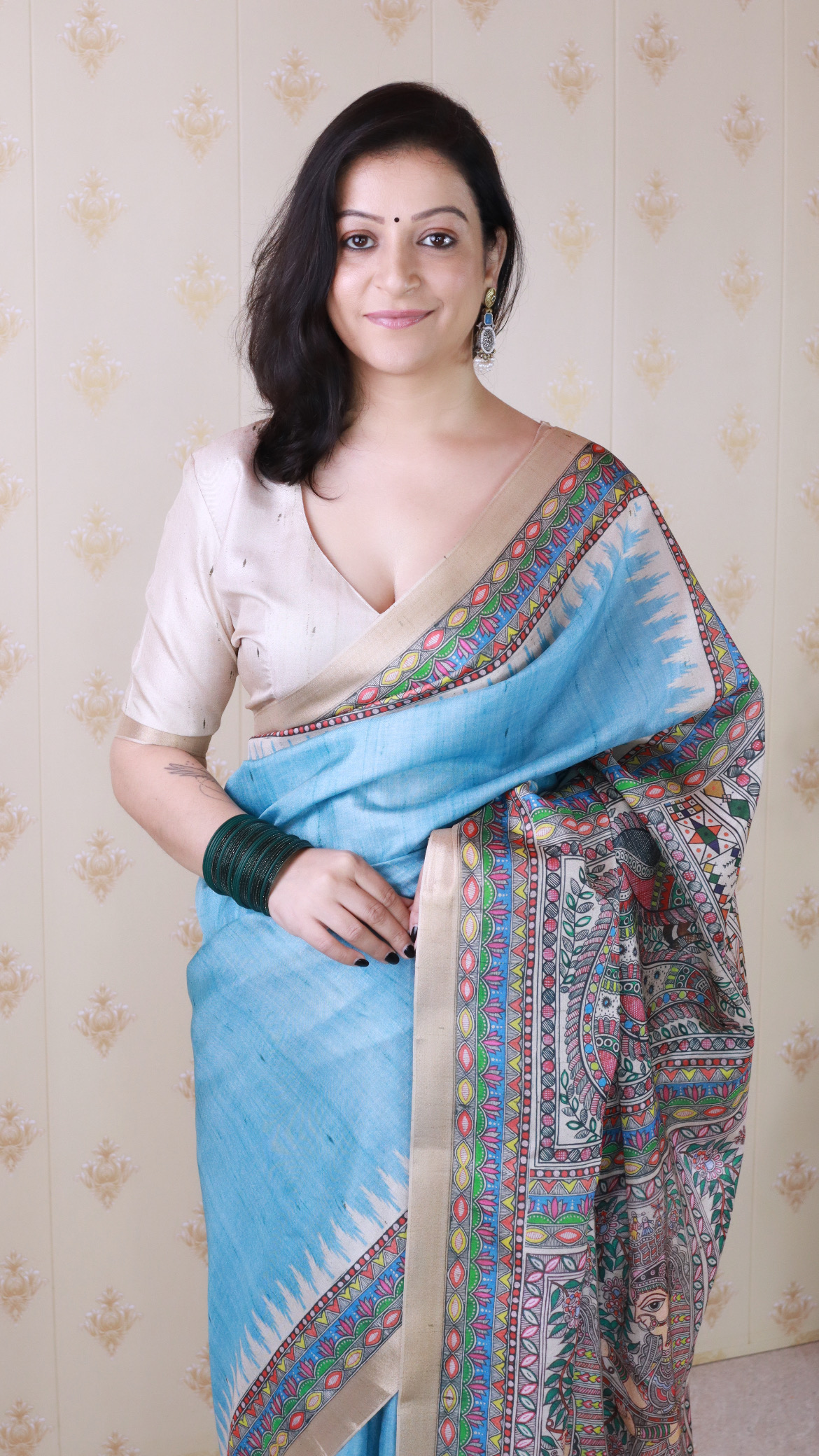 Blue Color Woven Jari Border Designer Madhubani Digital Printed Ethnic Tussar Silk Saree