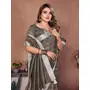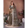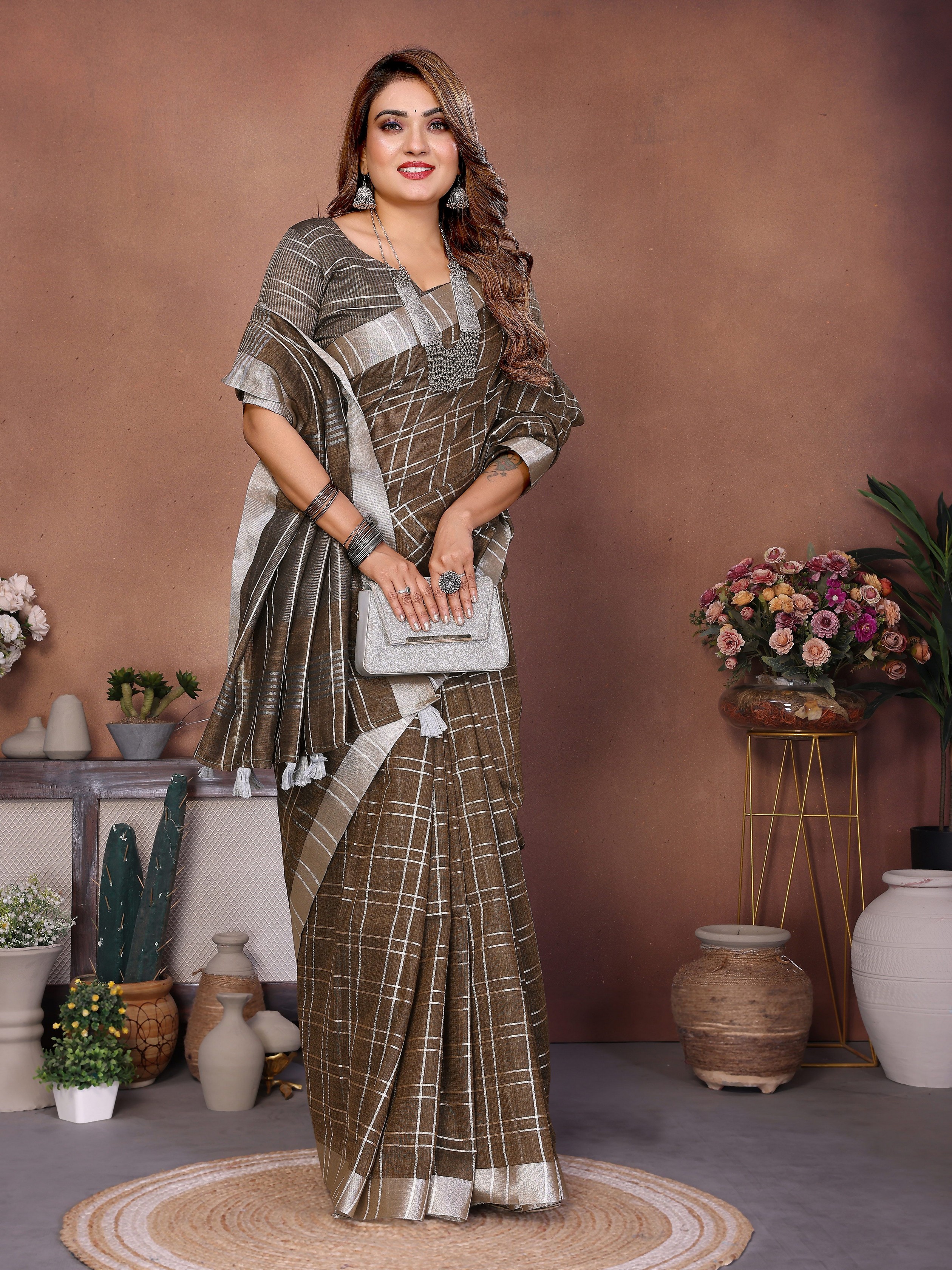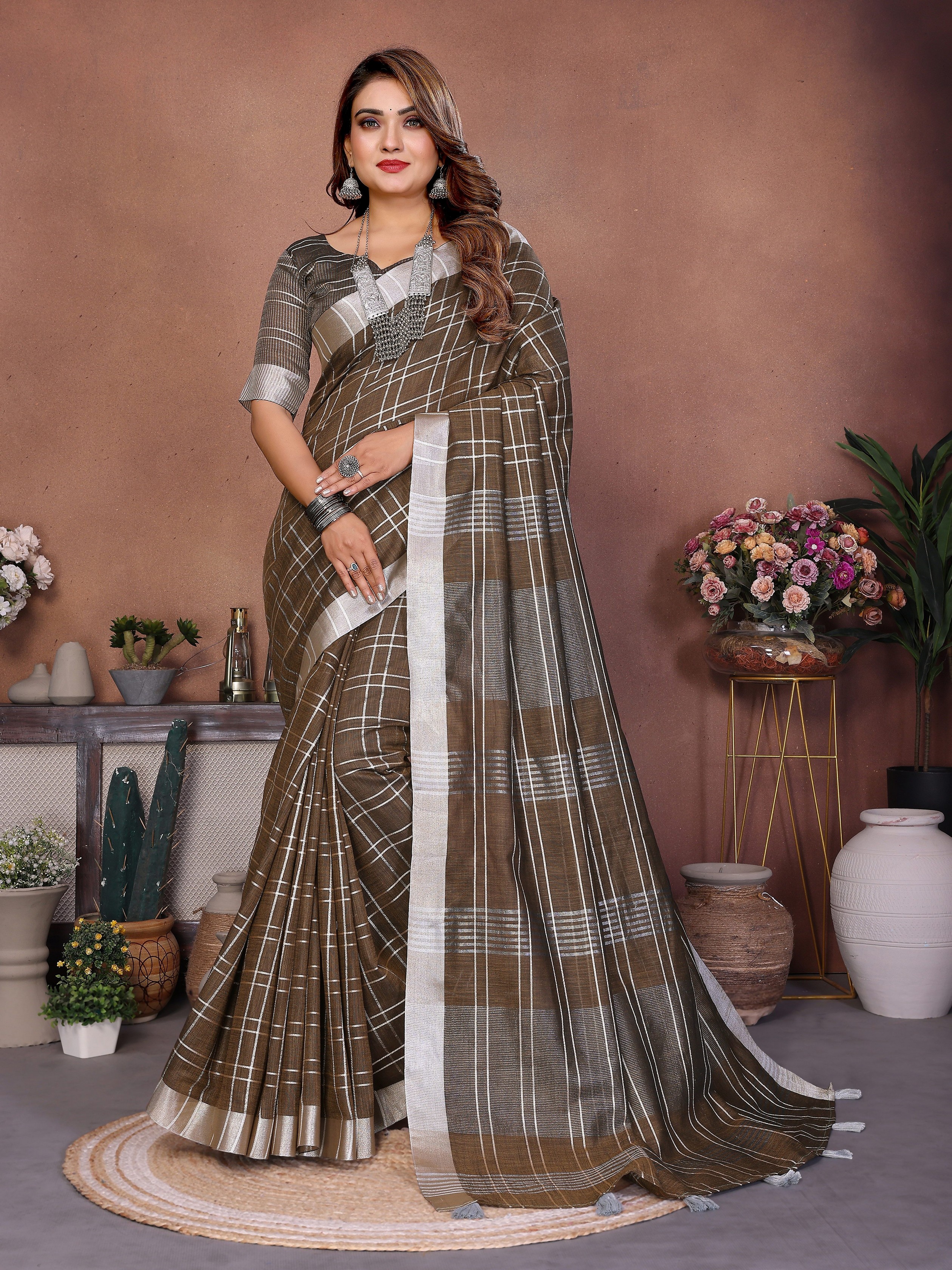 Brown Color Linen Cotton Fabric Woven Checks Designer Trendy Ethnic Saree