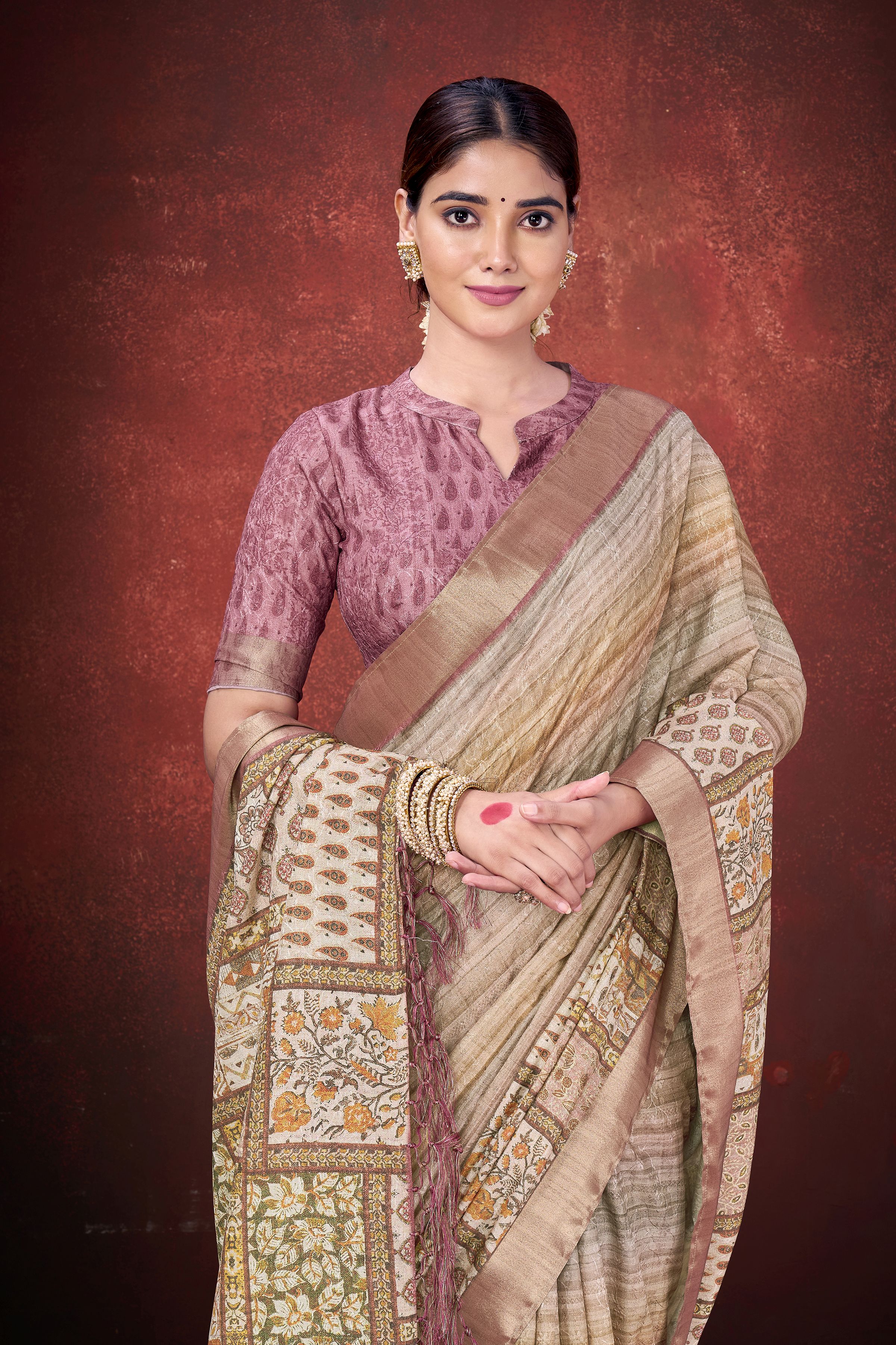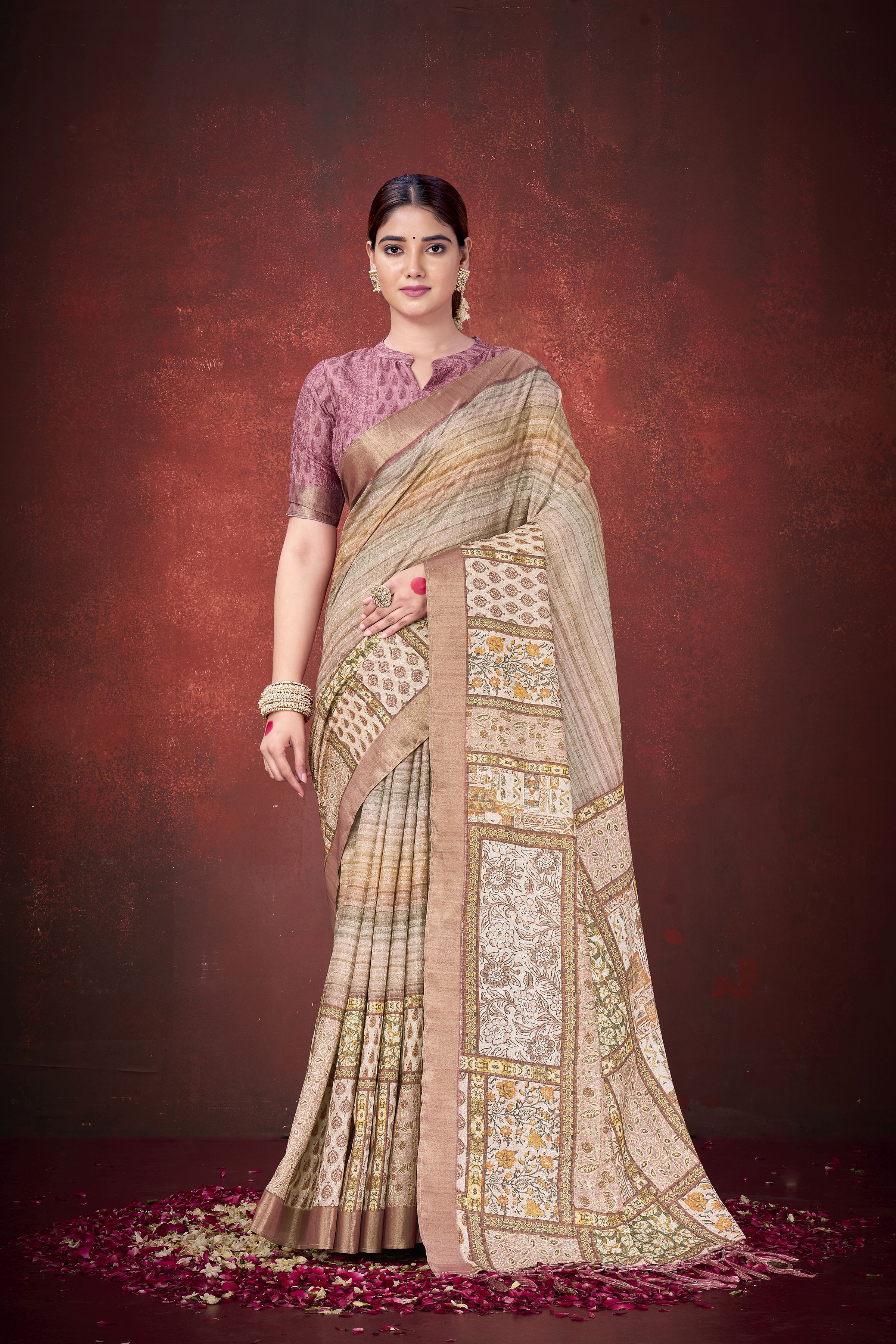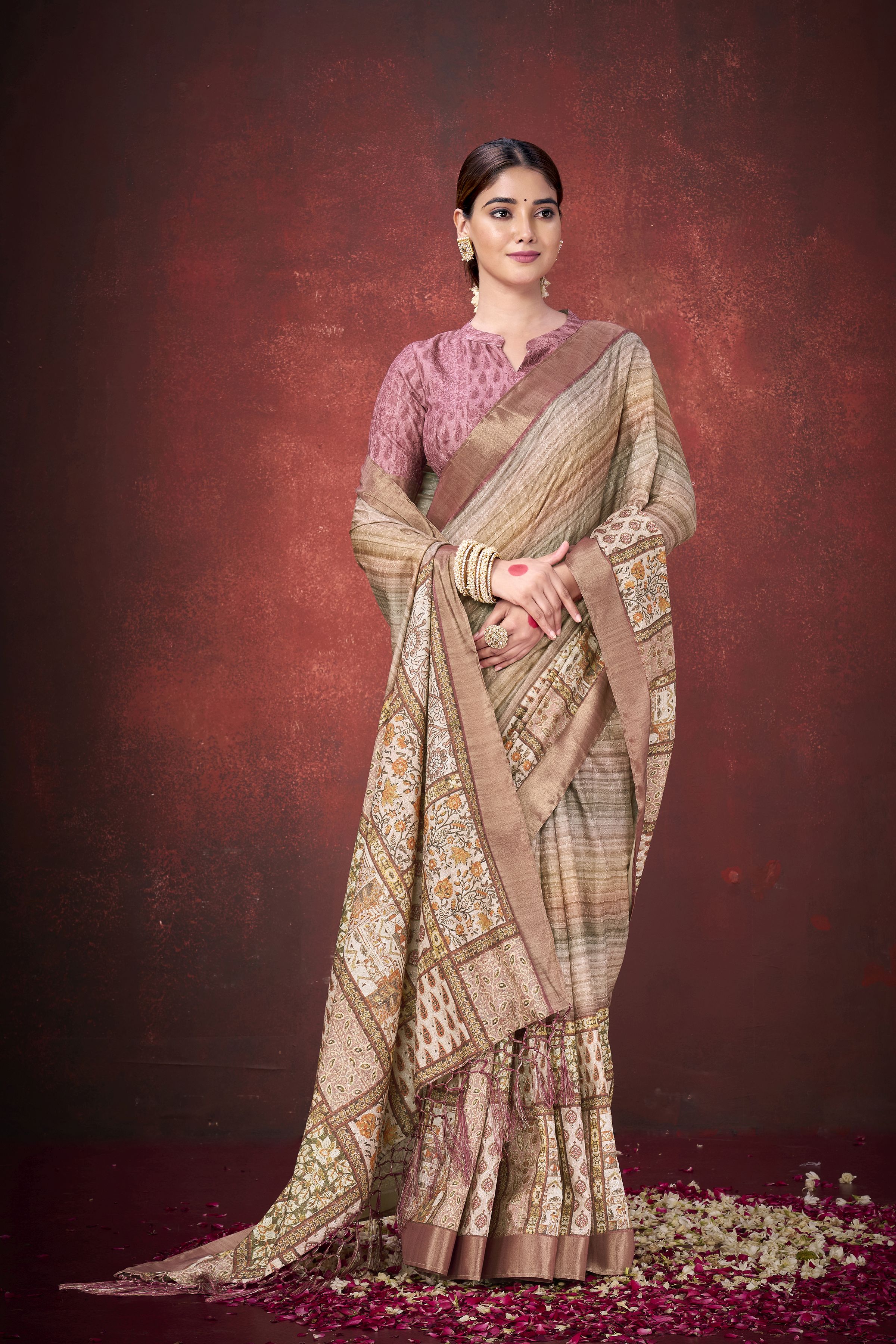 Brown Color Smart Partywear Spun Silk Traditional Print Saree