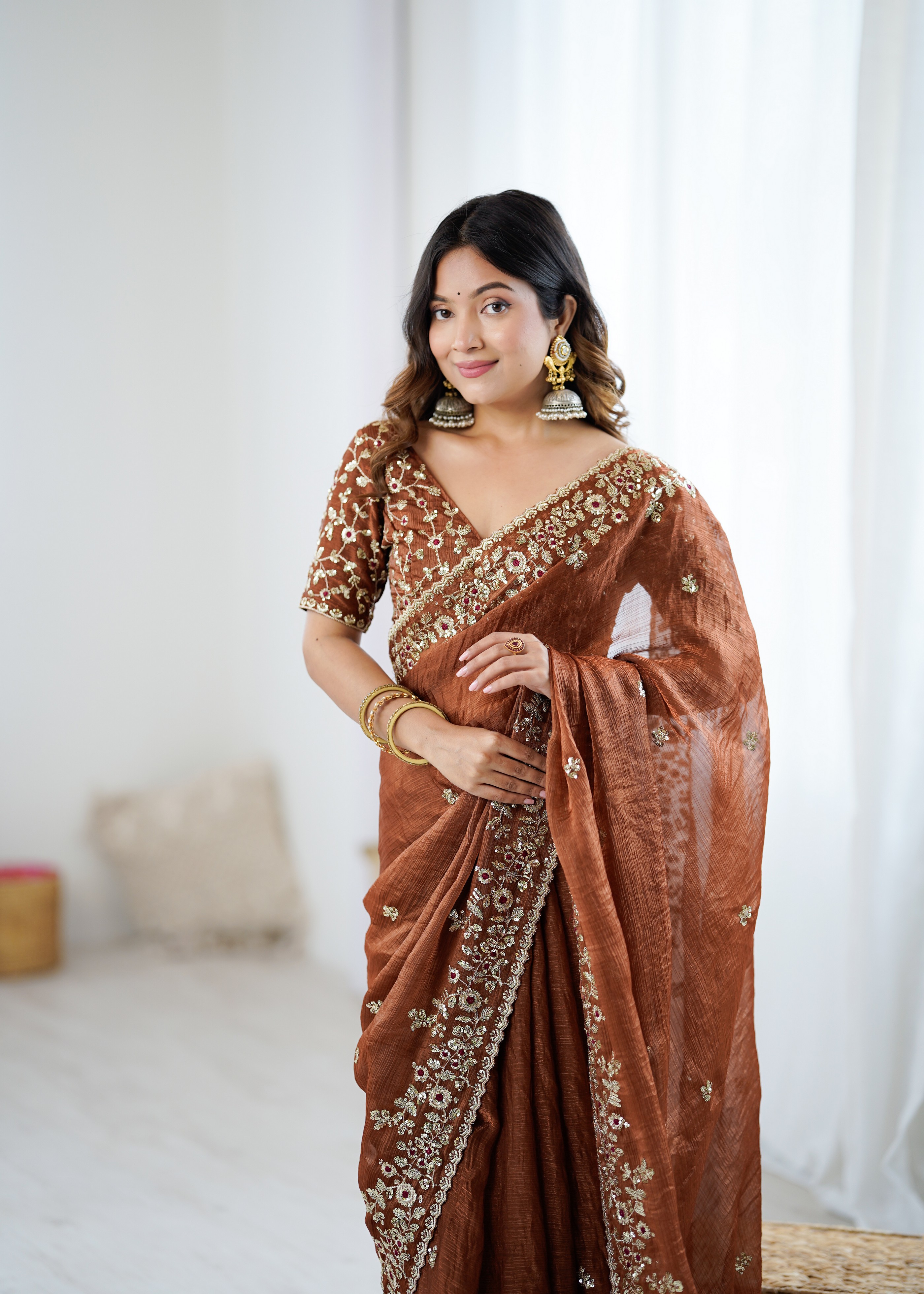 Brown Color Trendy Fendy Chiffon Fabric Glamorous Partywear Saree