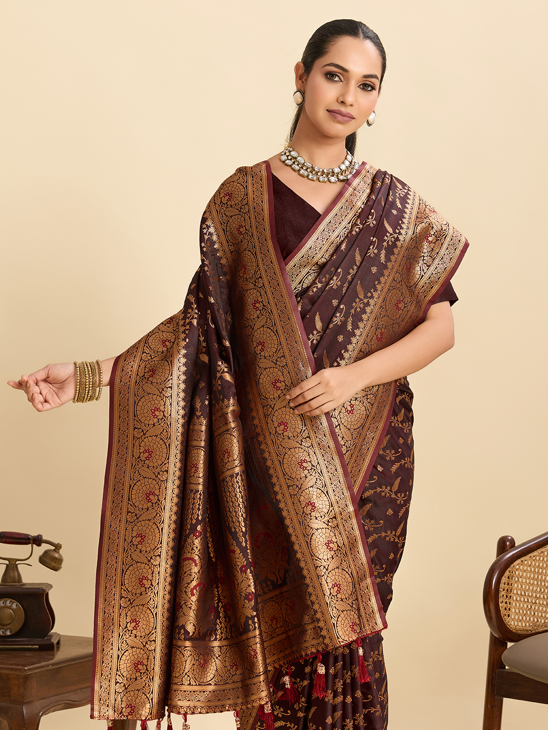 Coffee Color Wevon Jari Designer Soft Silk Partywear Saree