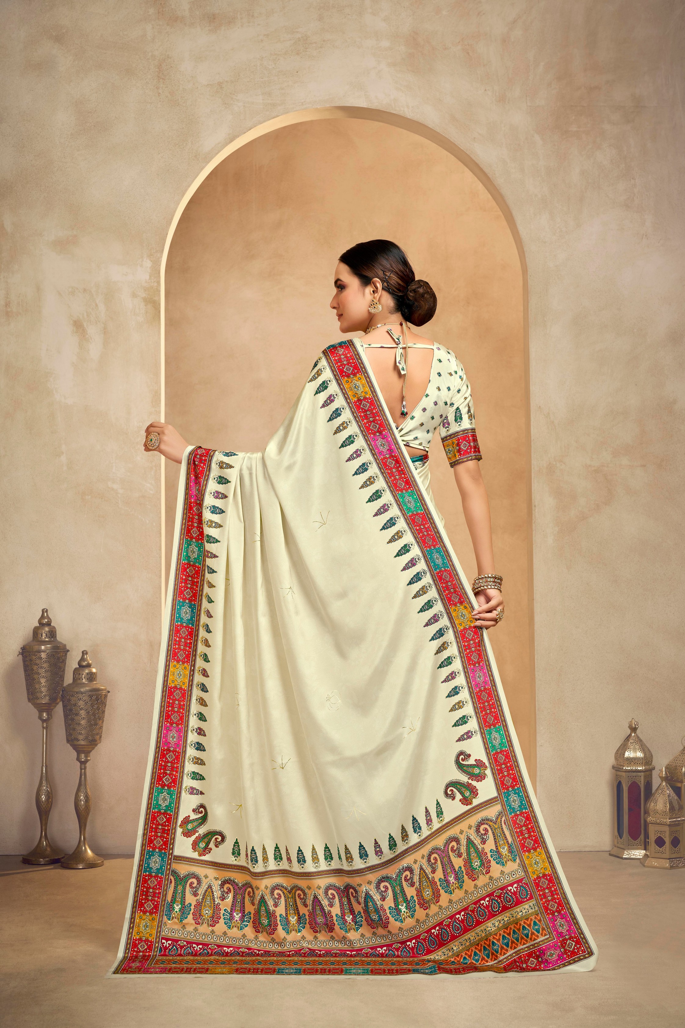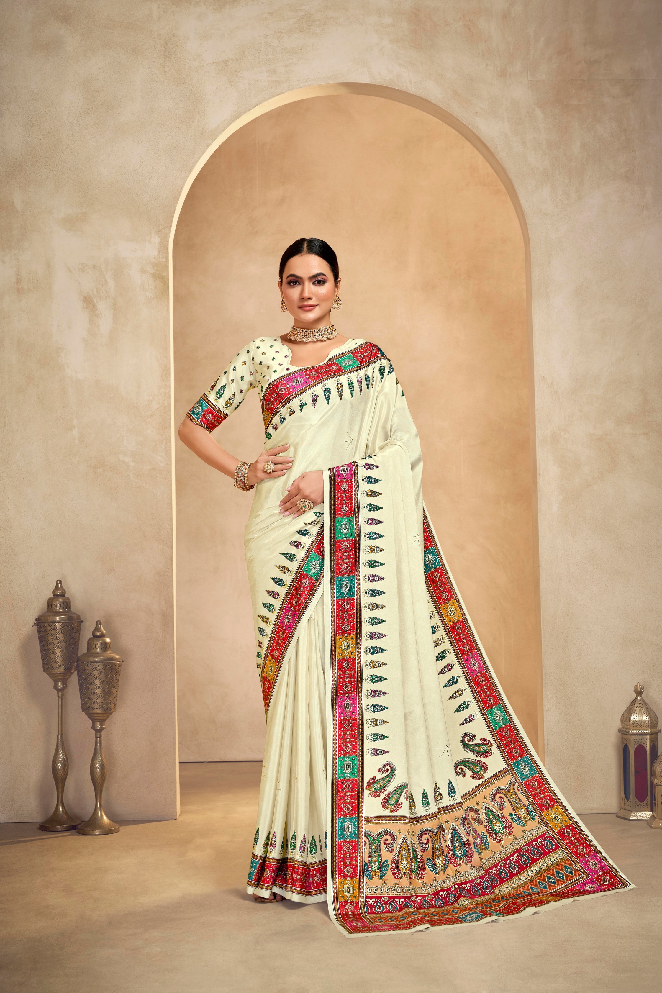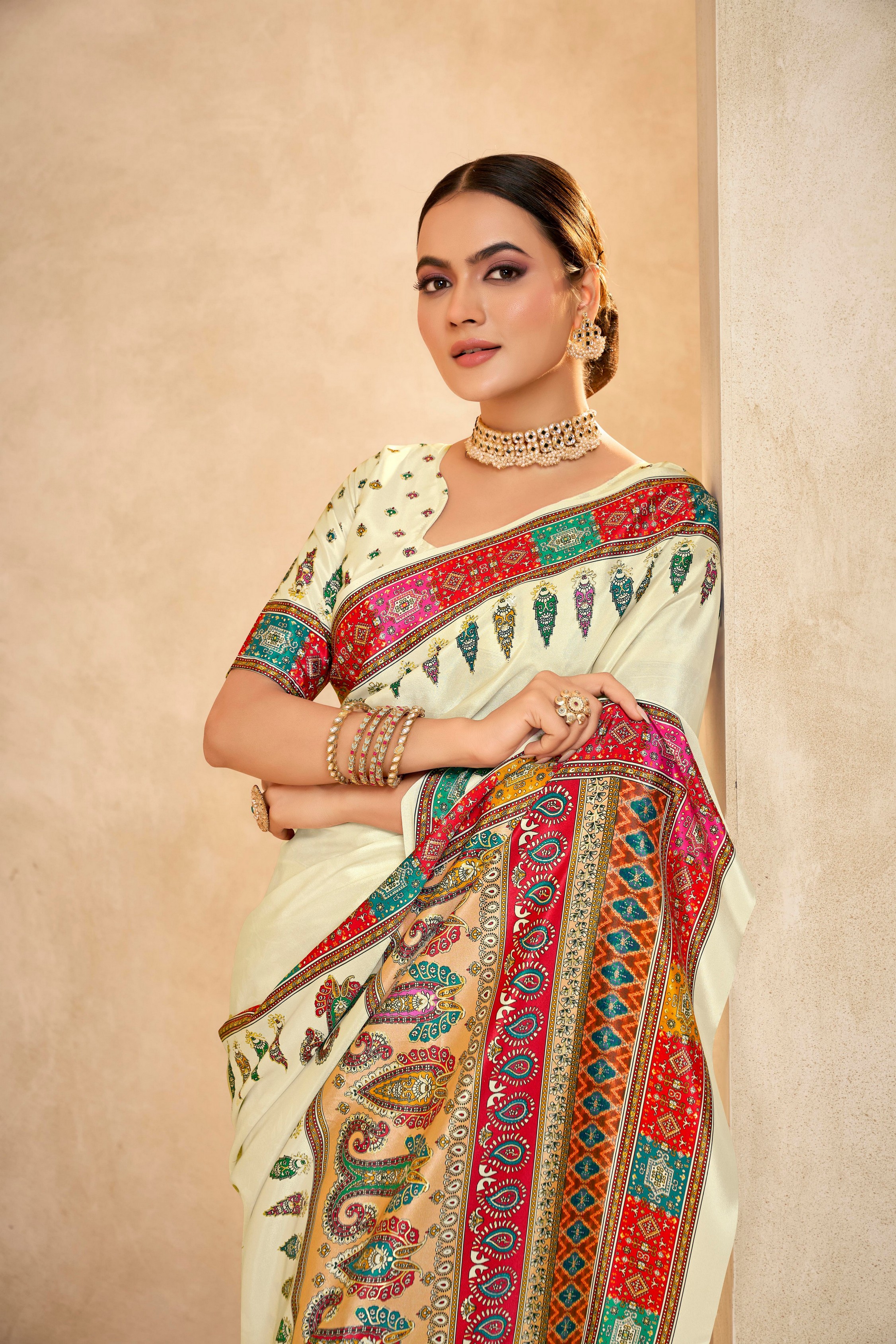 Cream Color Crepe Silk Fabric Position Digital Foil Printed Saree