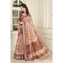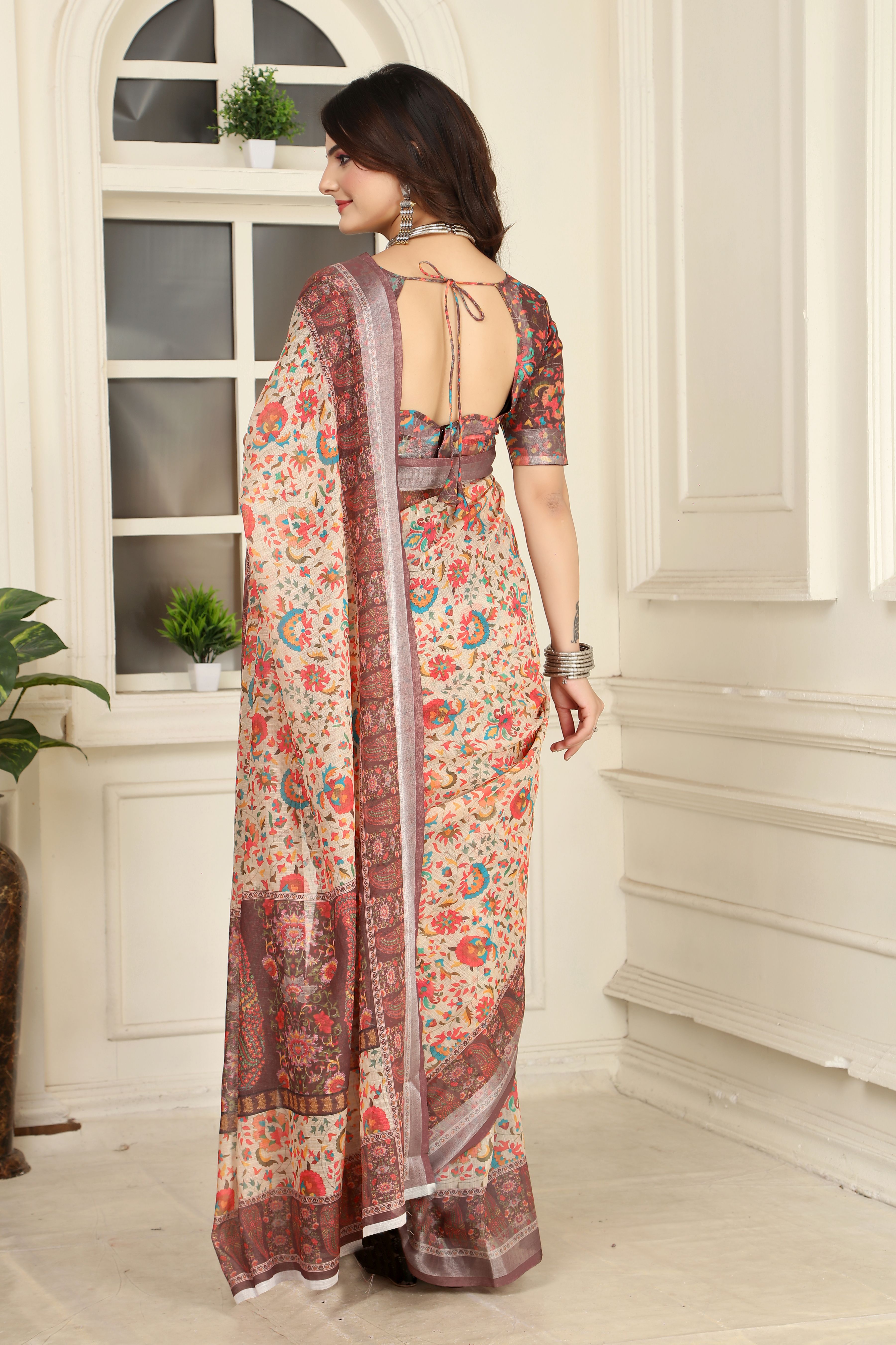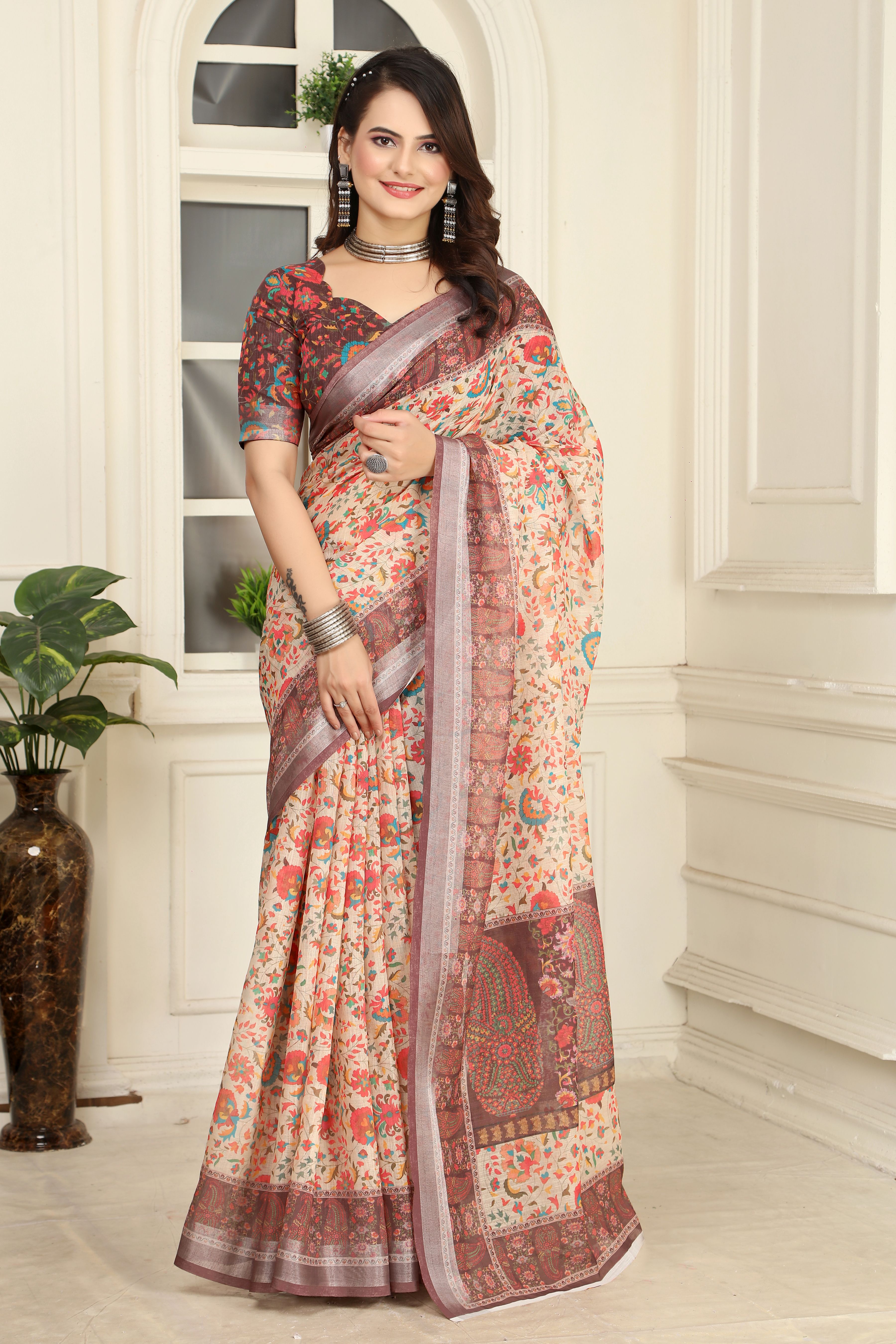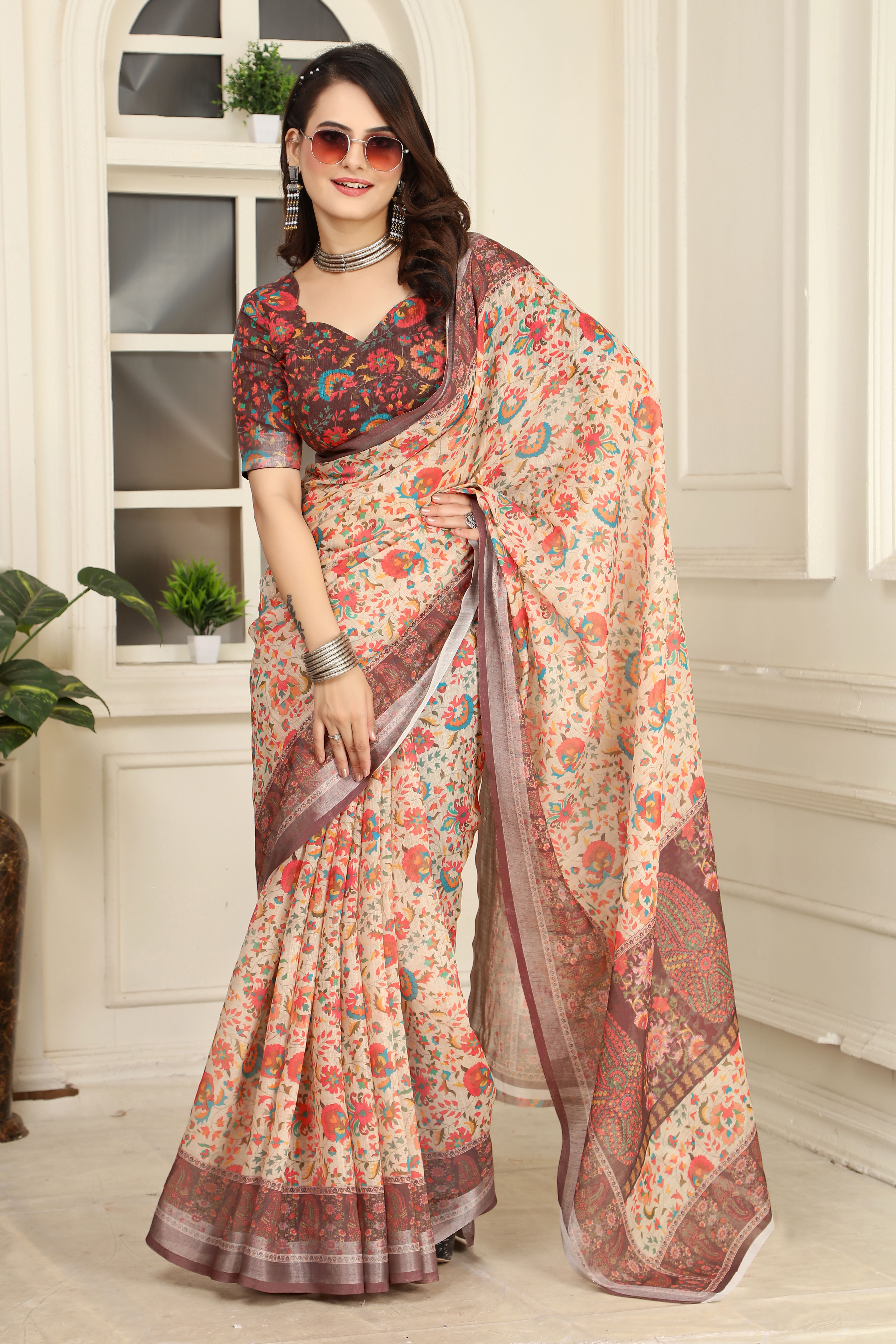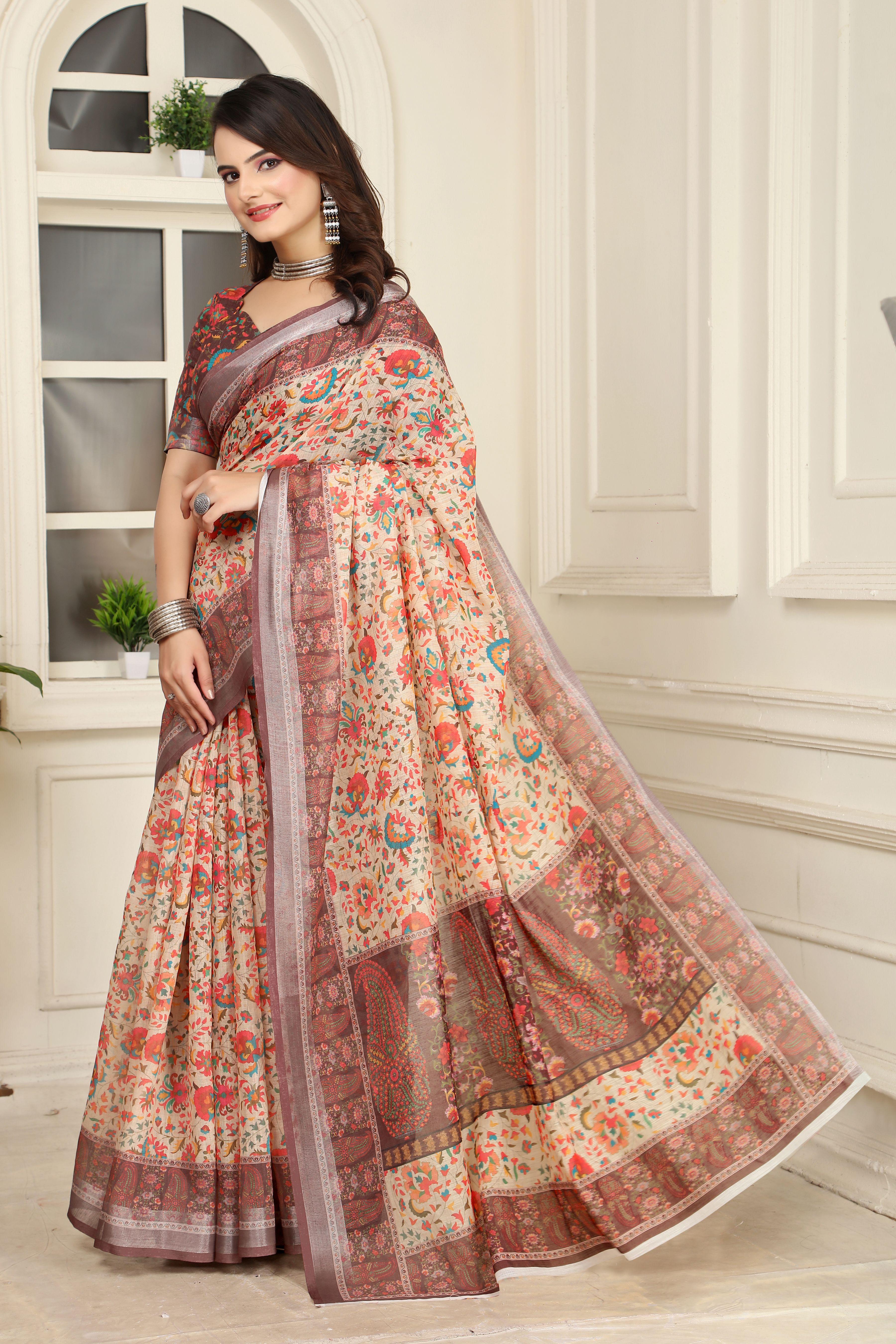 Cream Color Linen Cotton Fabric Beautiful Printed Saree