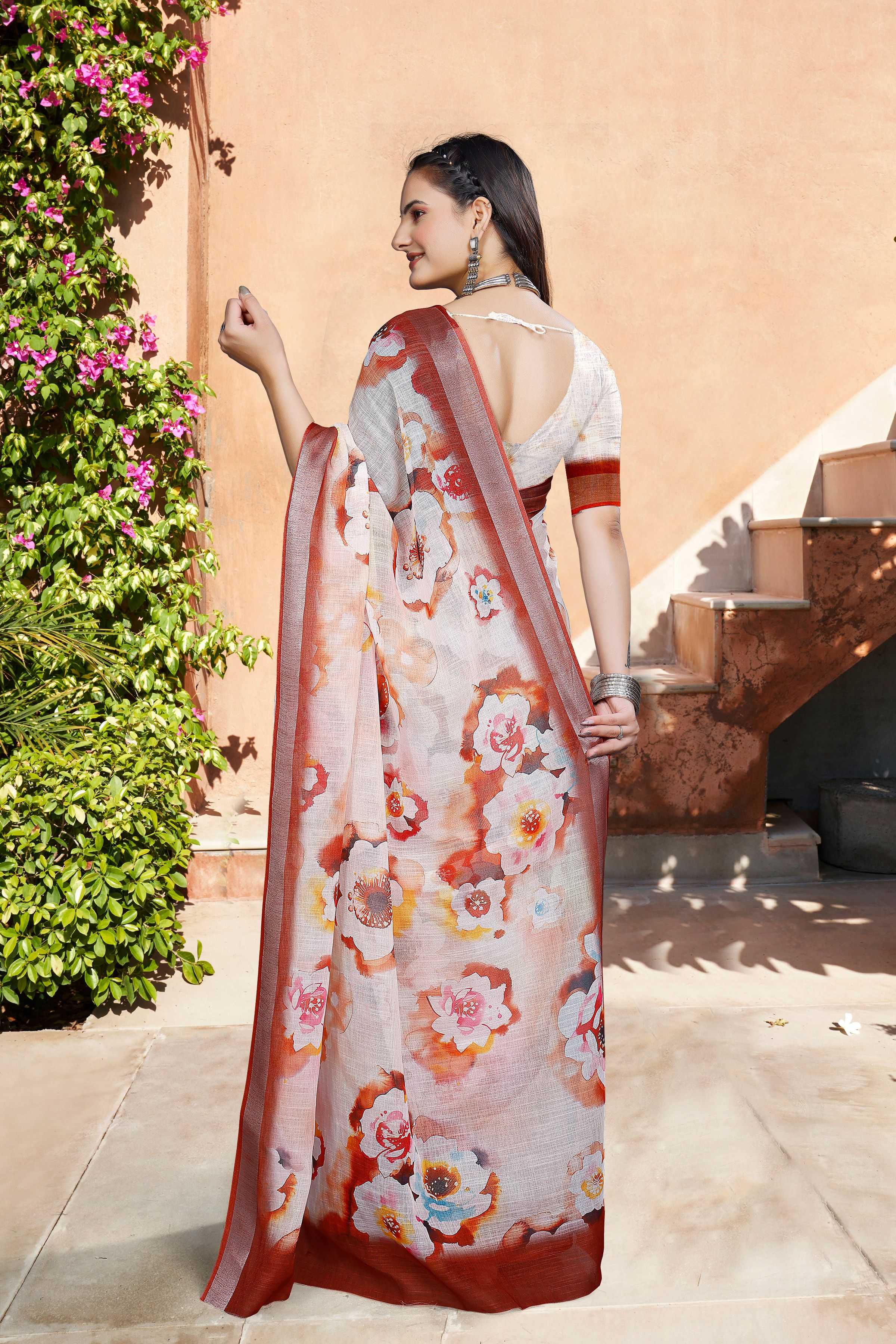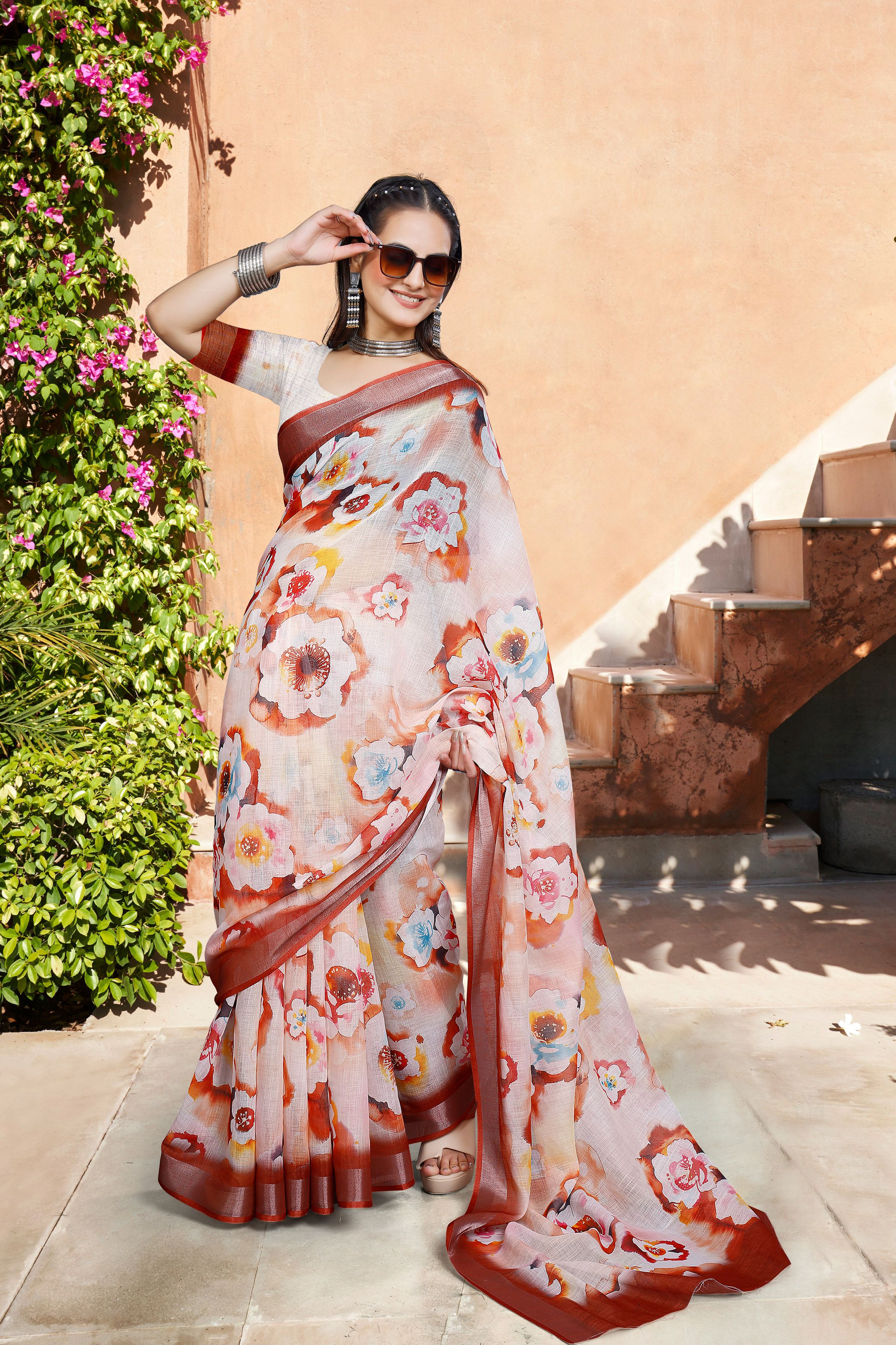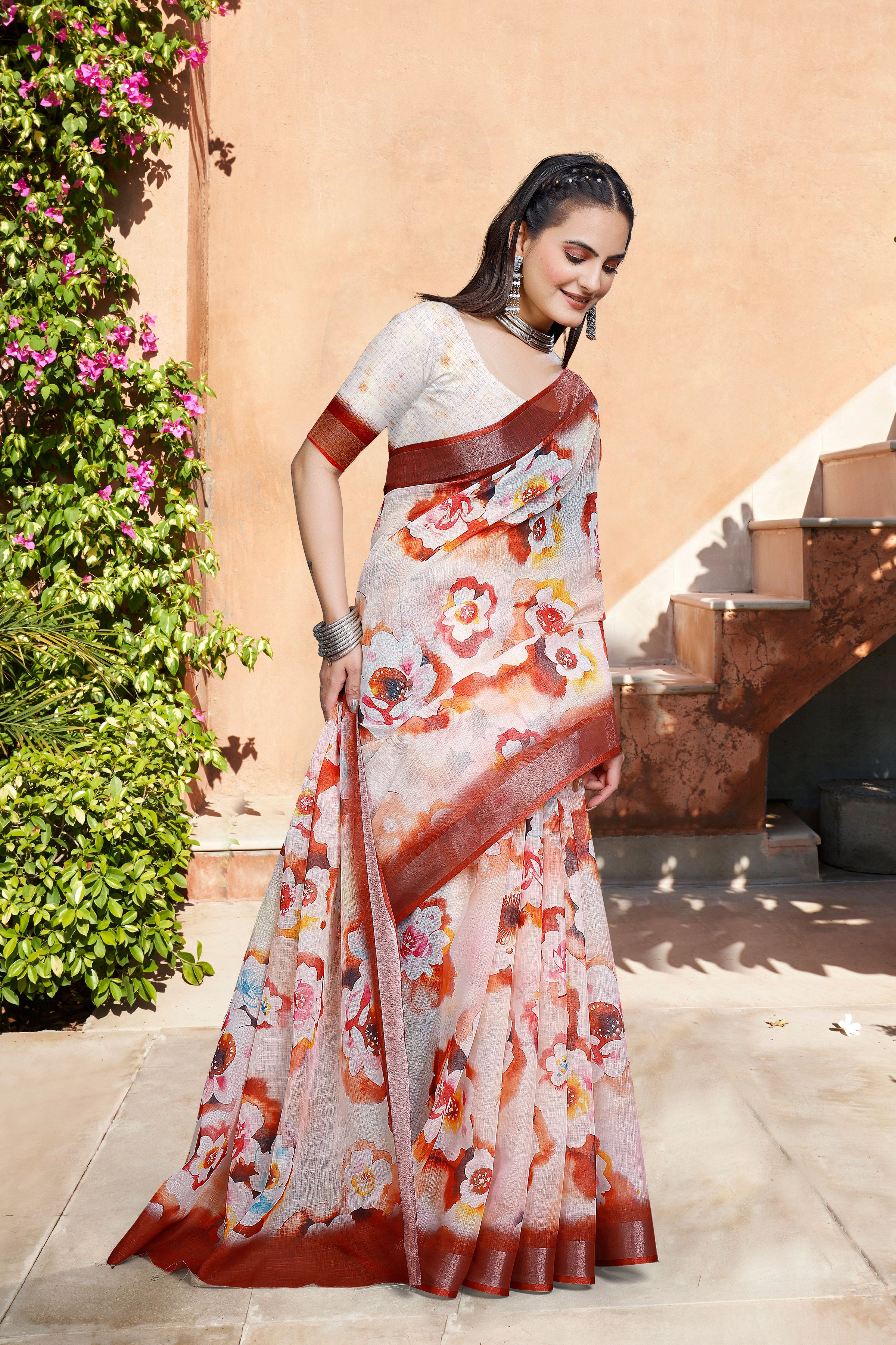 Look These Festive Saree in Fine Colored.These Saree Are Linen Cotton And Blouse is Fabricated On Linen Cotton Pair.Its Beautified With Woven Jari Border With Designer Digital Printed.