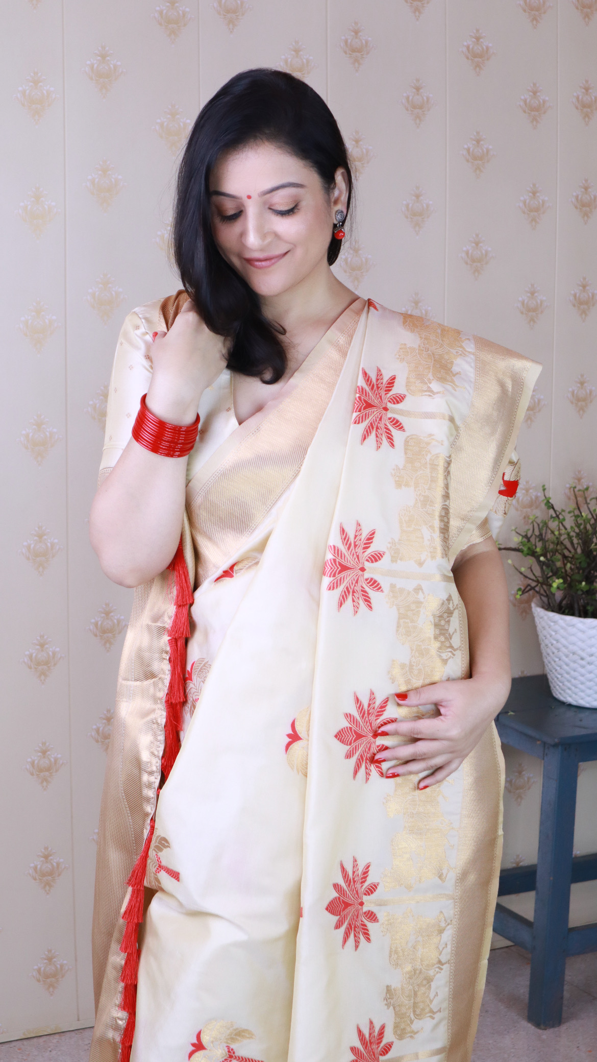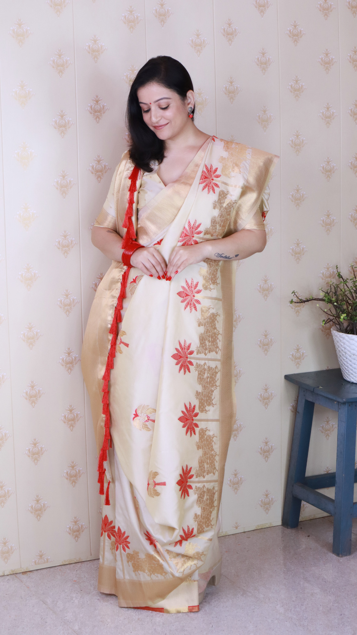 CreamColor Soft Silk Fabric Woven Meenakari Designer Ceremonial Partywear Saree