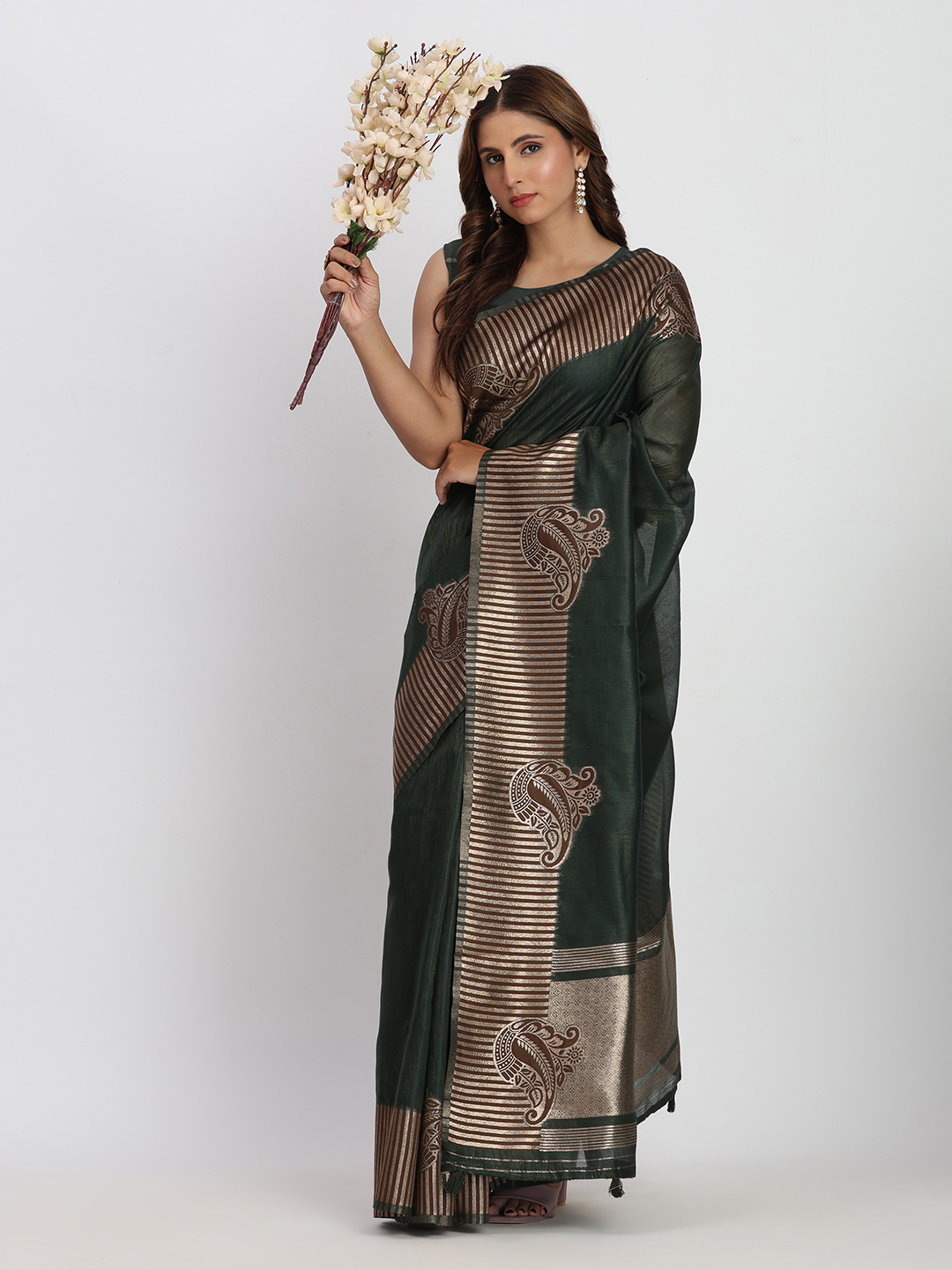 Dark Green Color Linen Cotton Fabric Woven Galla Designer Traditional Partywear Saree