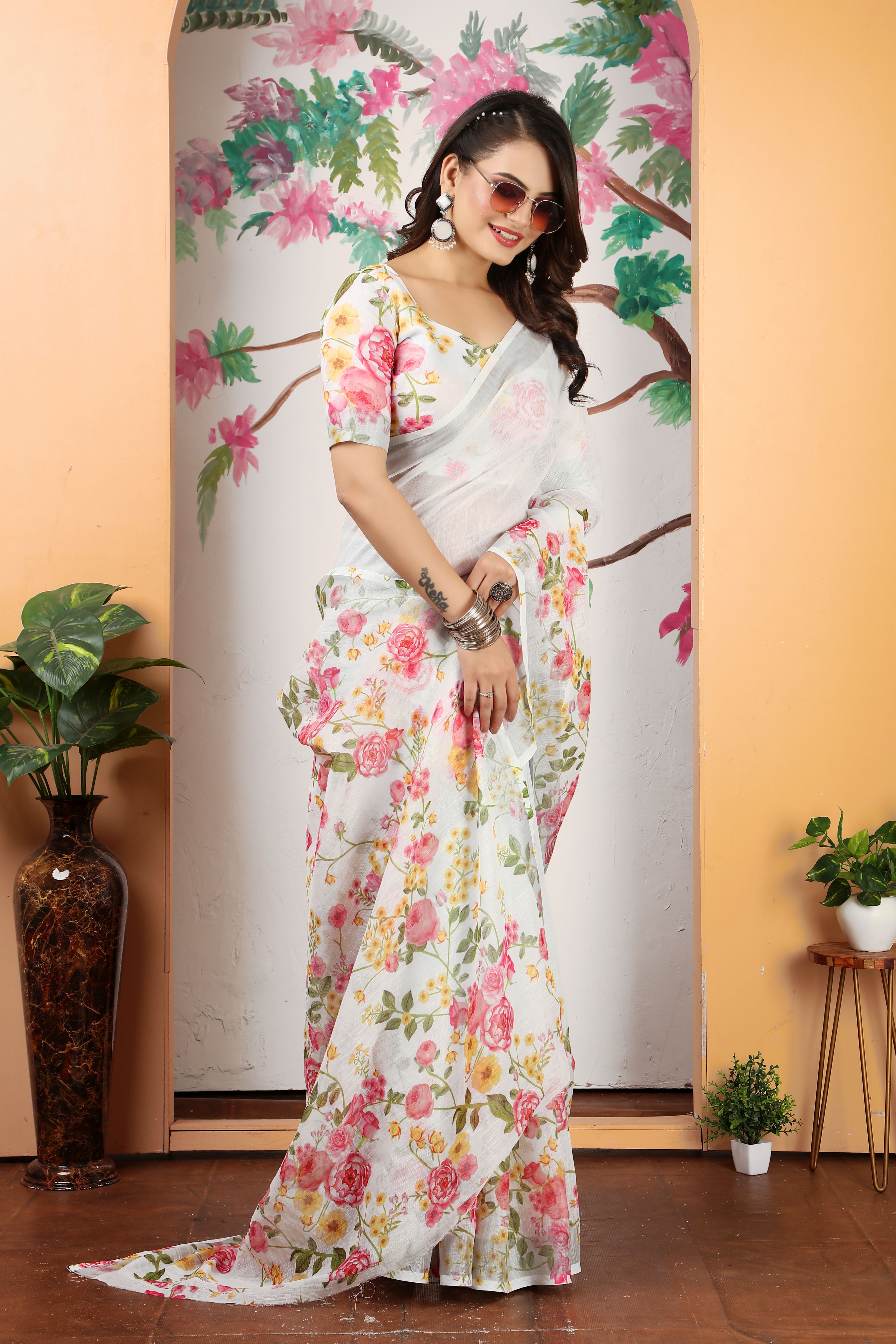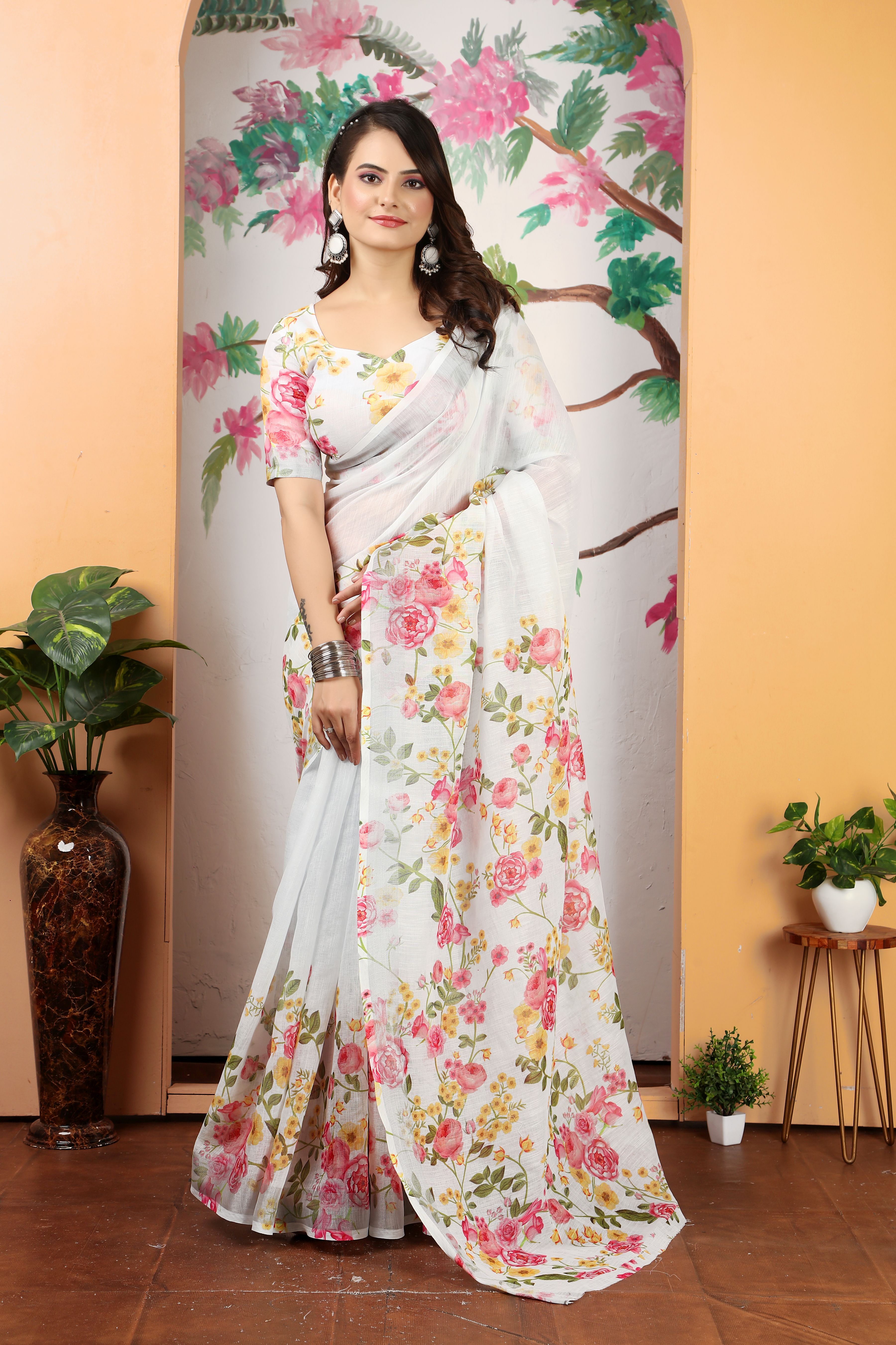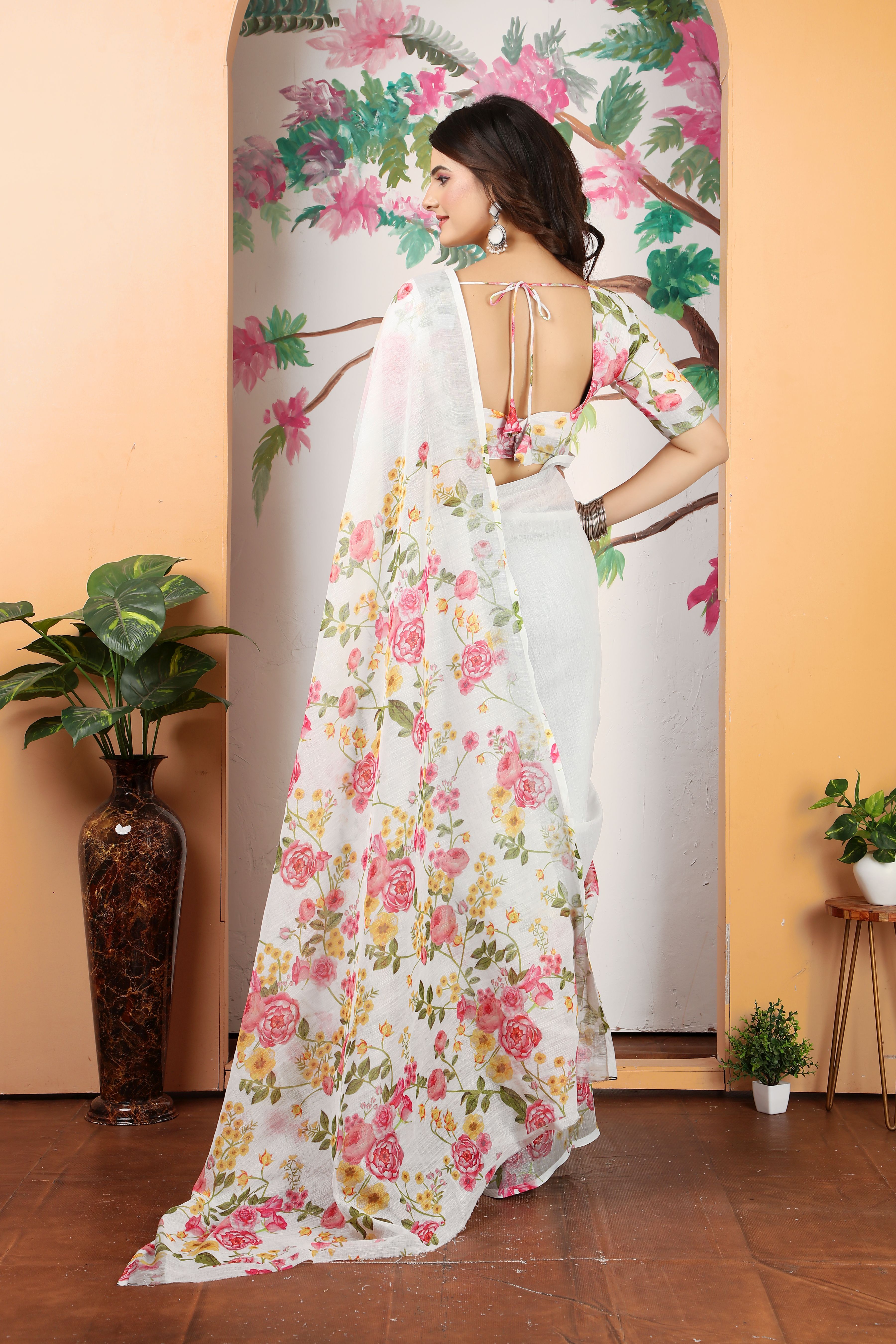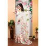 Ethnic Off White Color Beatutiful Linen Cotton Digital Printed Saree