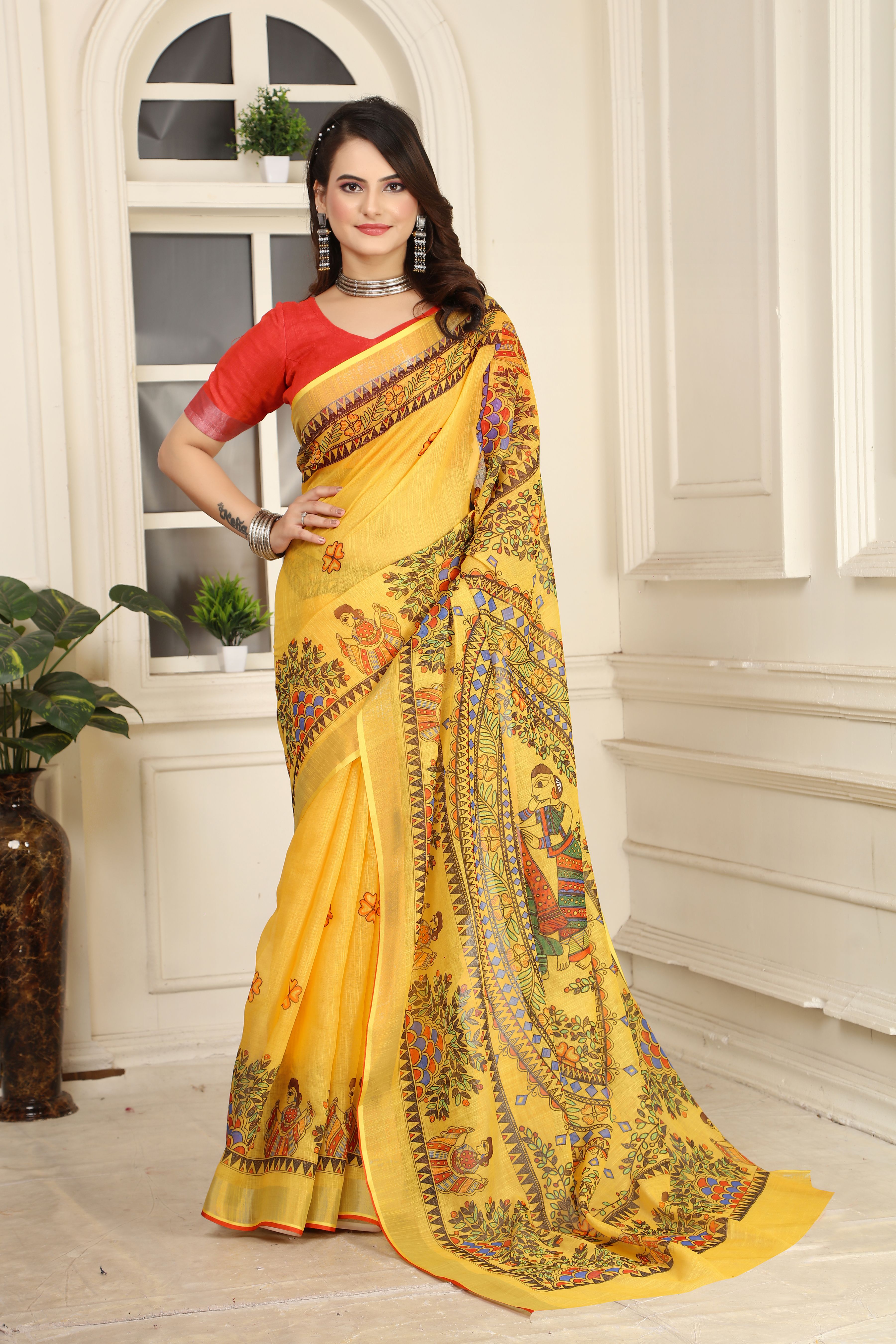 Ethnic Yellow Color Beatutiful Linen Cotton Digital Printed Saree