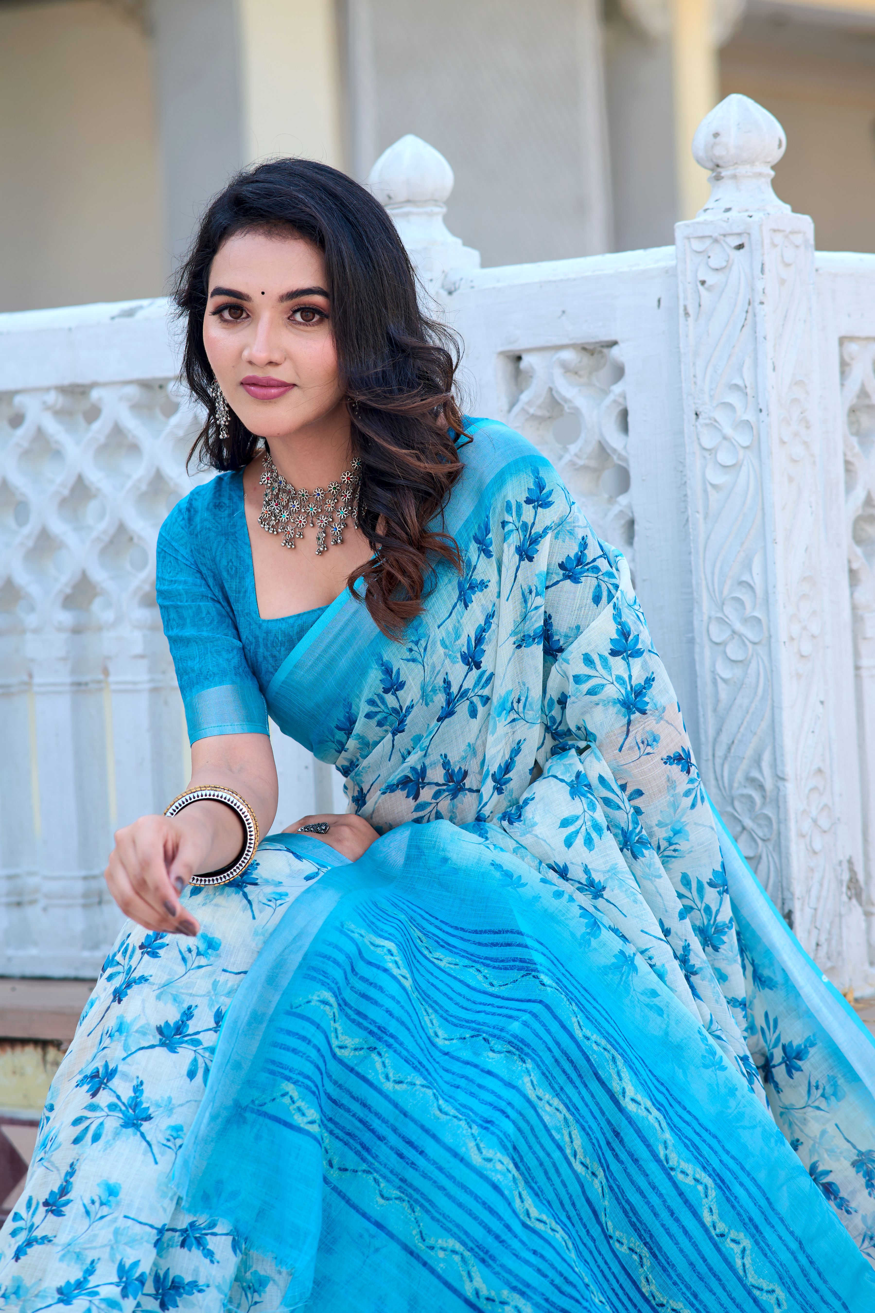 Firozi Color Beautiful Linen Cotton Fabric Designer Festive Wear Saree