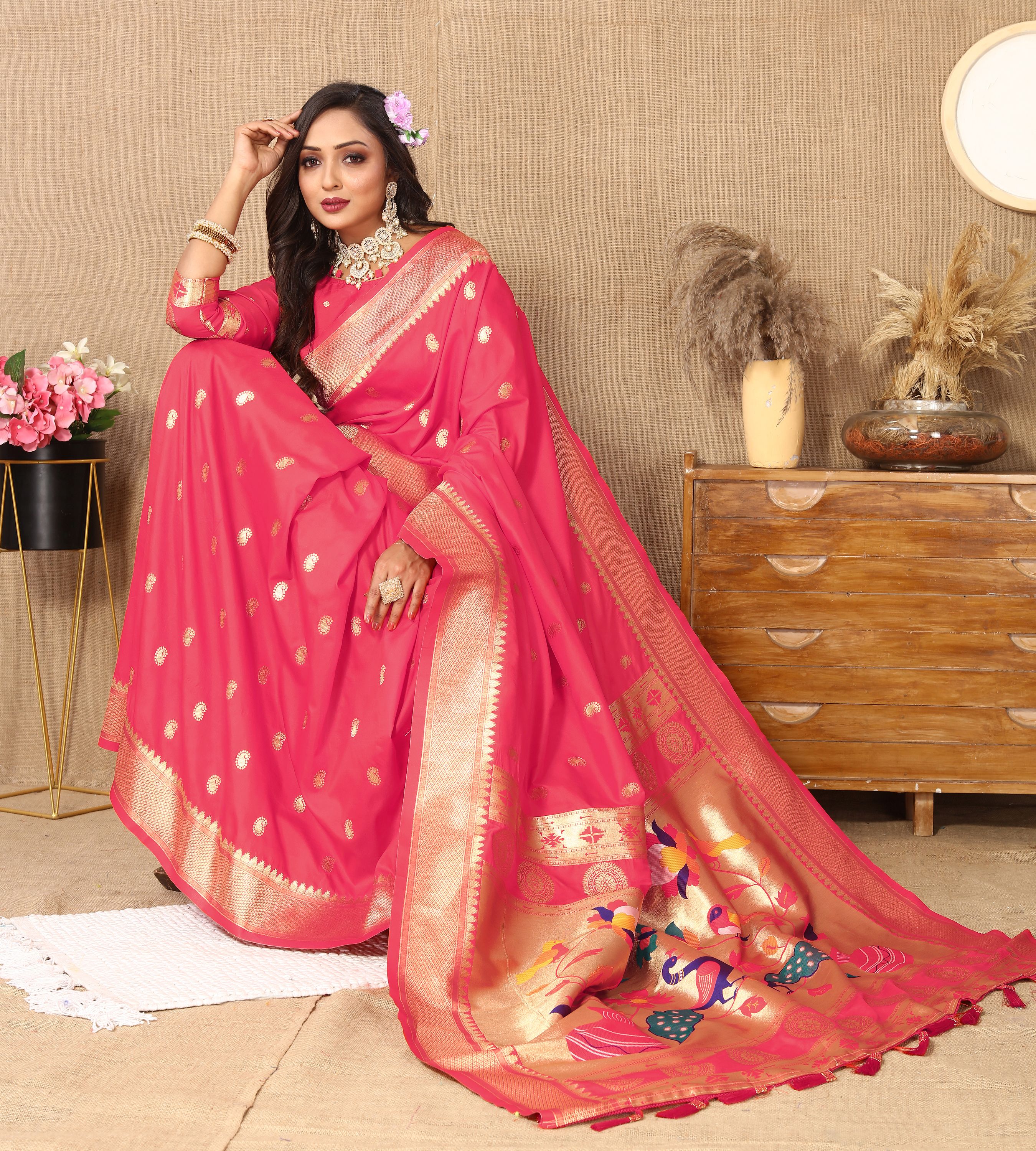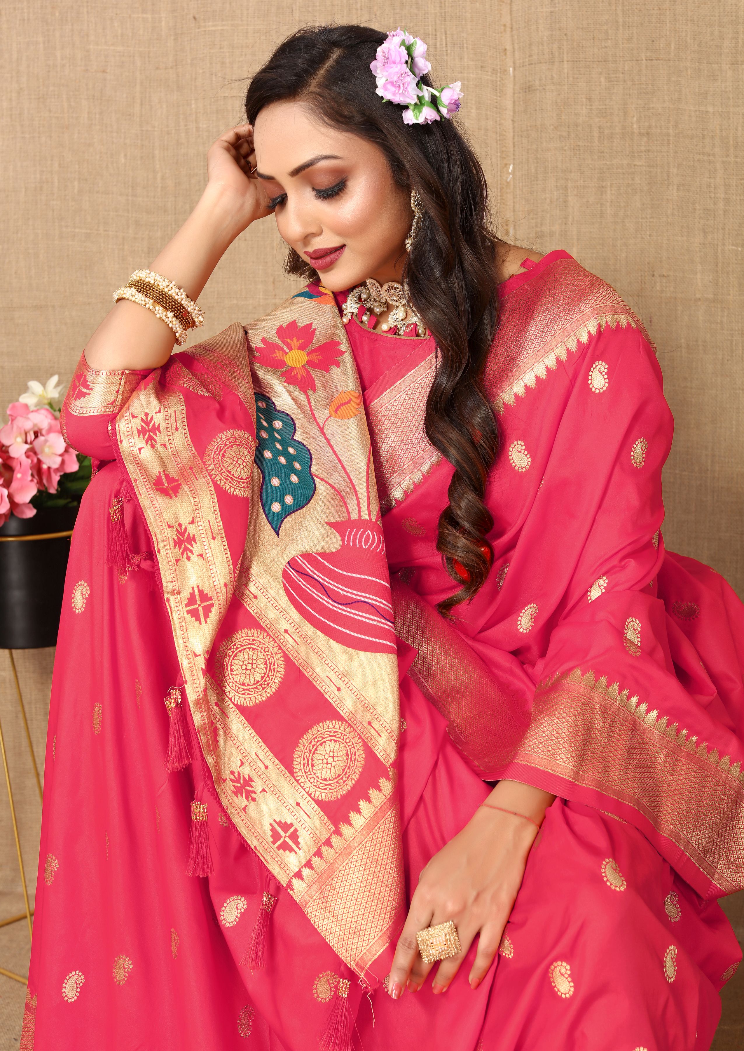 Gajri Color Paithani Silk Woven Meenakari Jacquard Designer Traditional Rich Ethnic Saree