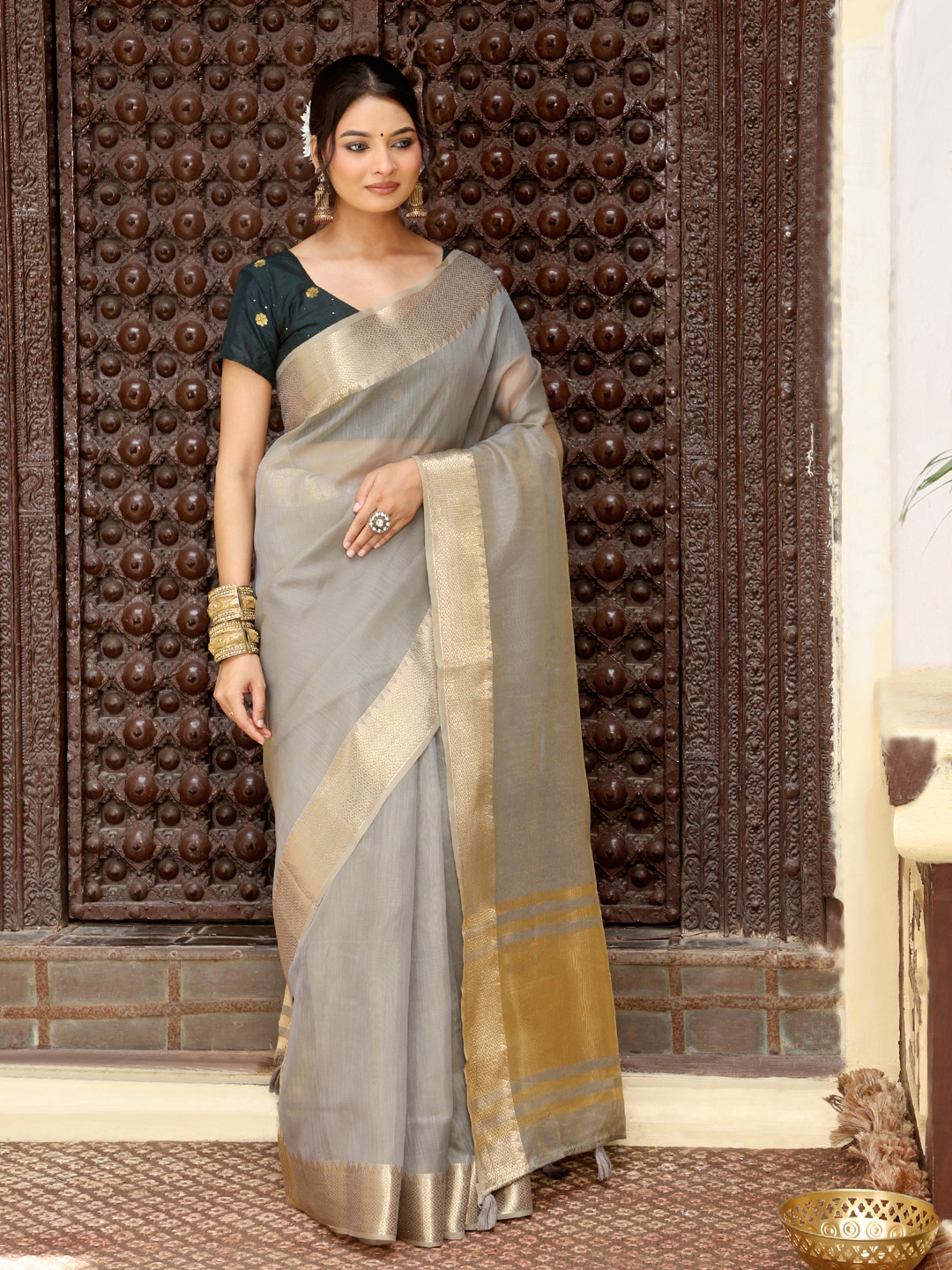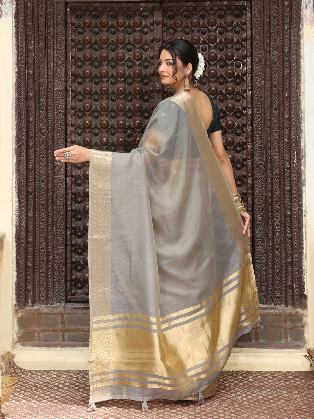 Gray Color Rich Ethnic Cotton Based Saree with Rich Woven Designer Looks