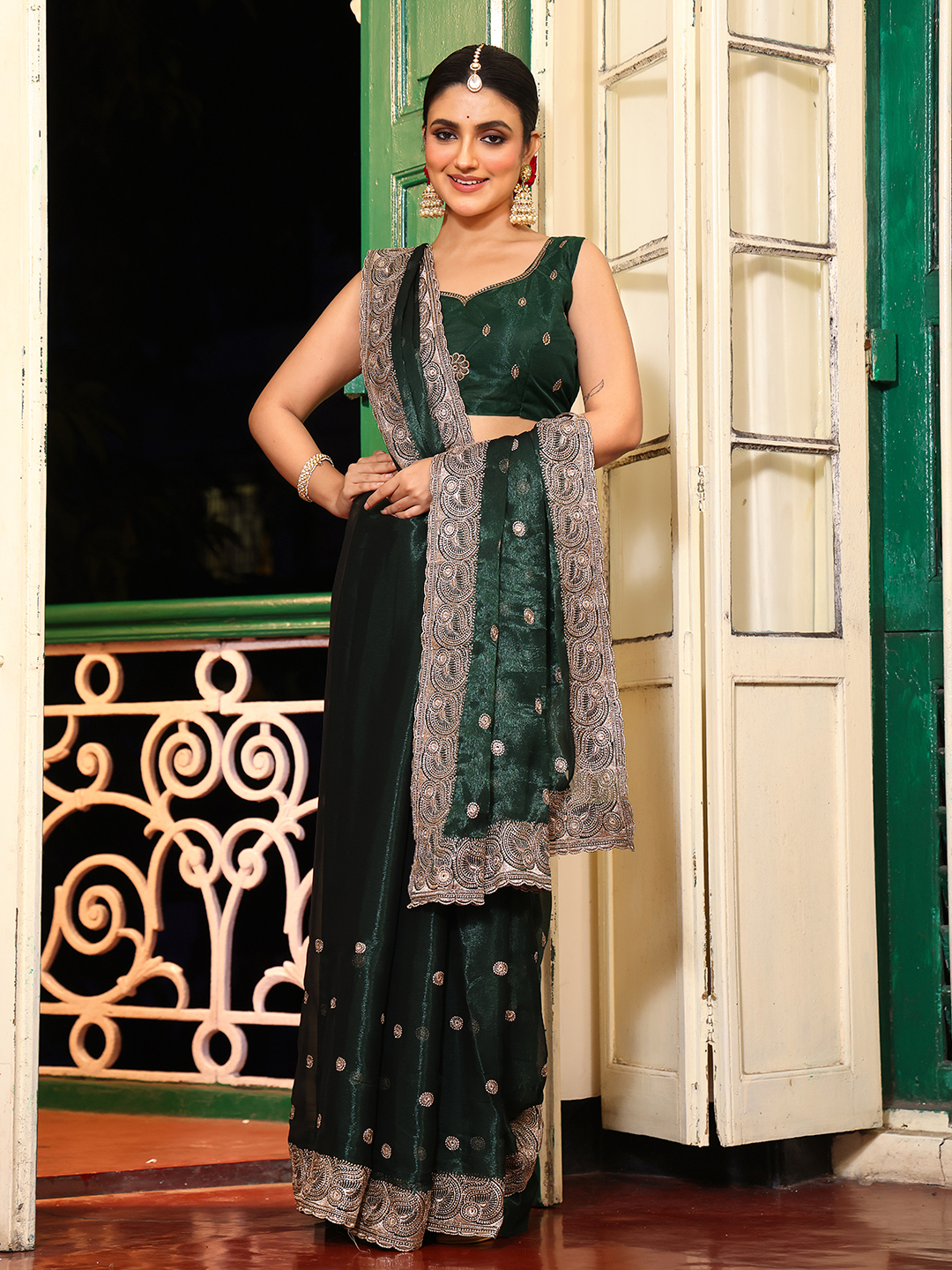 Green Color Embroidery Work Organza Fabric Beautiful Ceremonial Saree