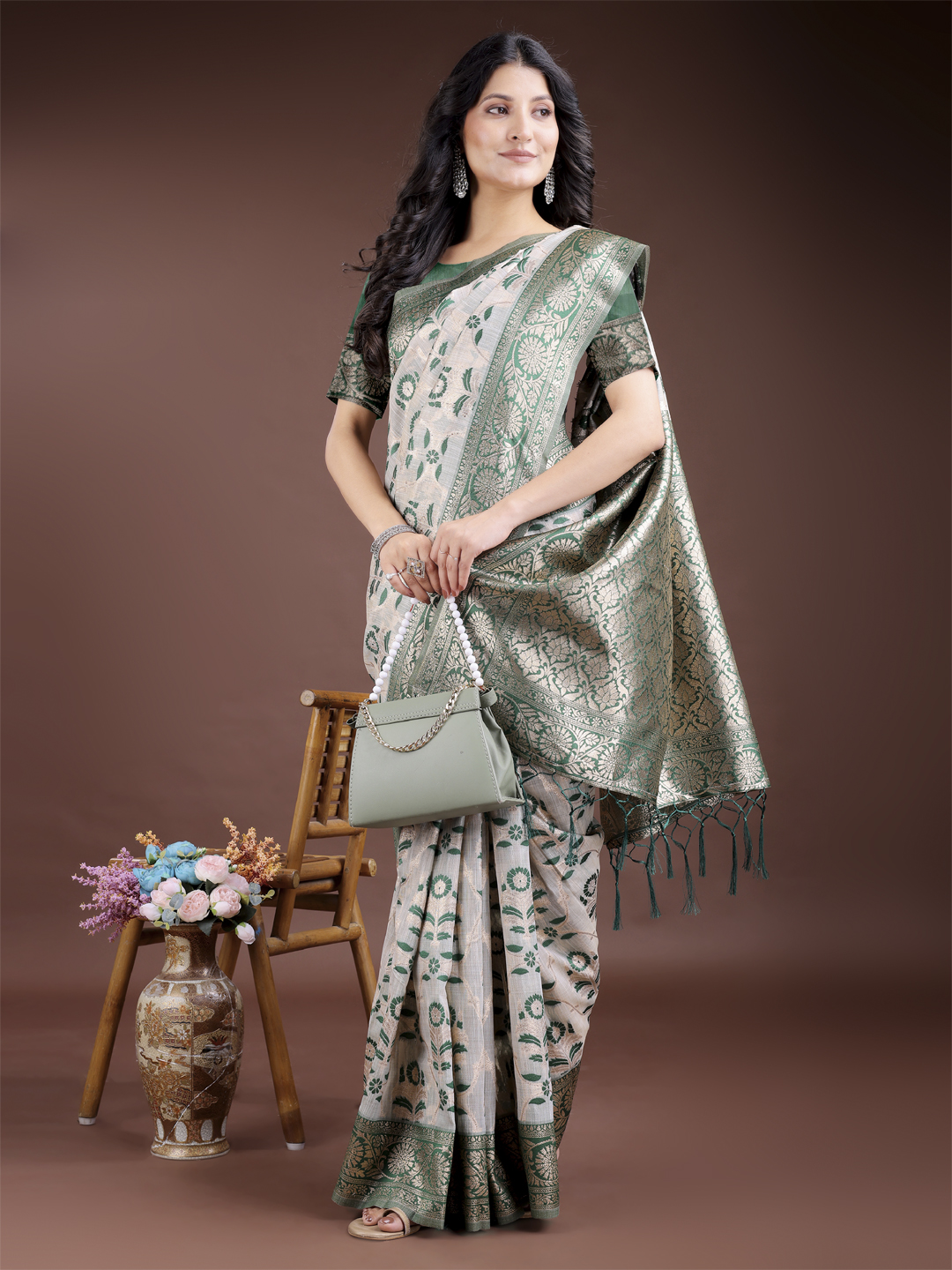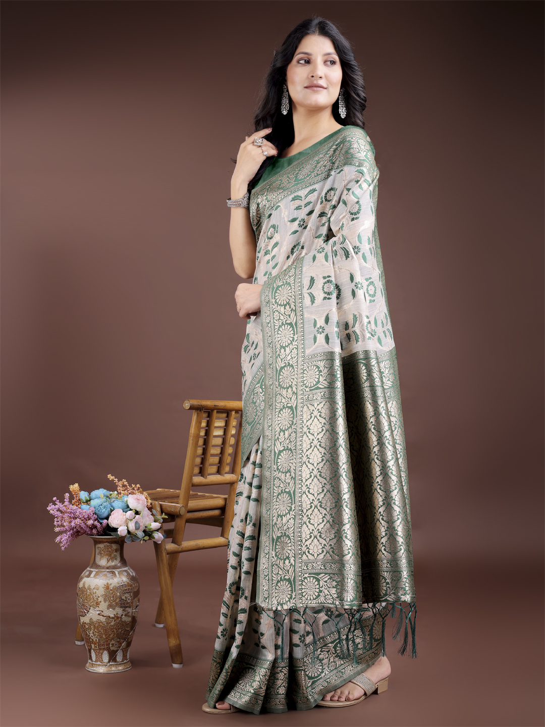 Green Color Linen Cotton Wevon Jacquard Designer Beautiful Festive Saree