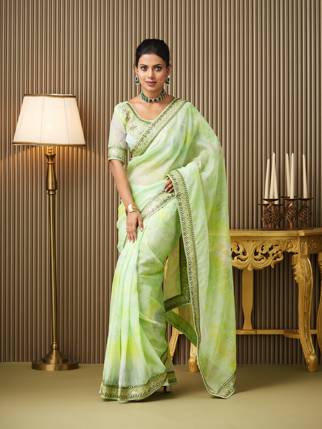 Green Color Organza fabric Embroidered Embellished Work Ceremonial Saree