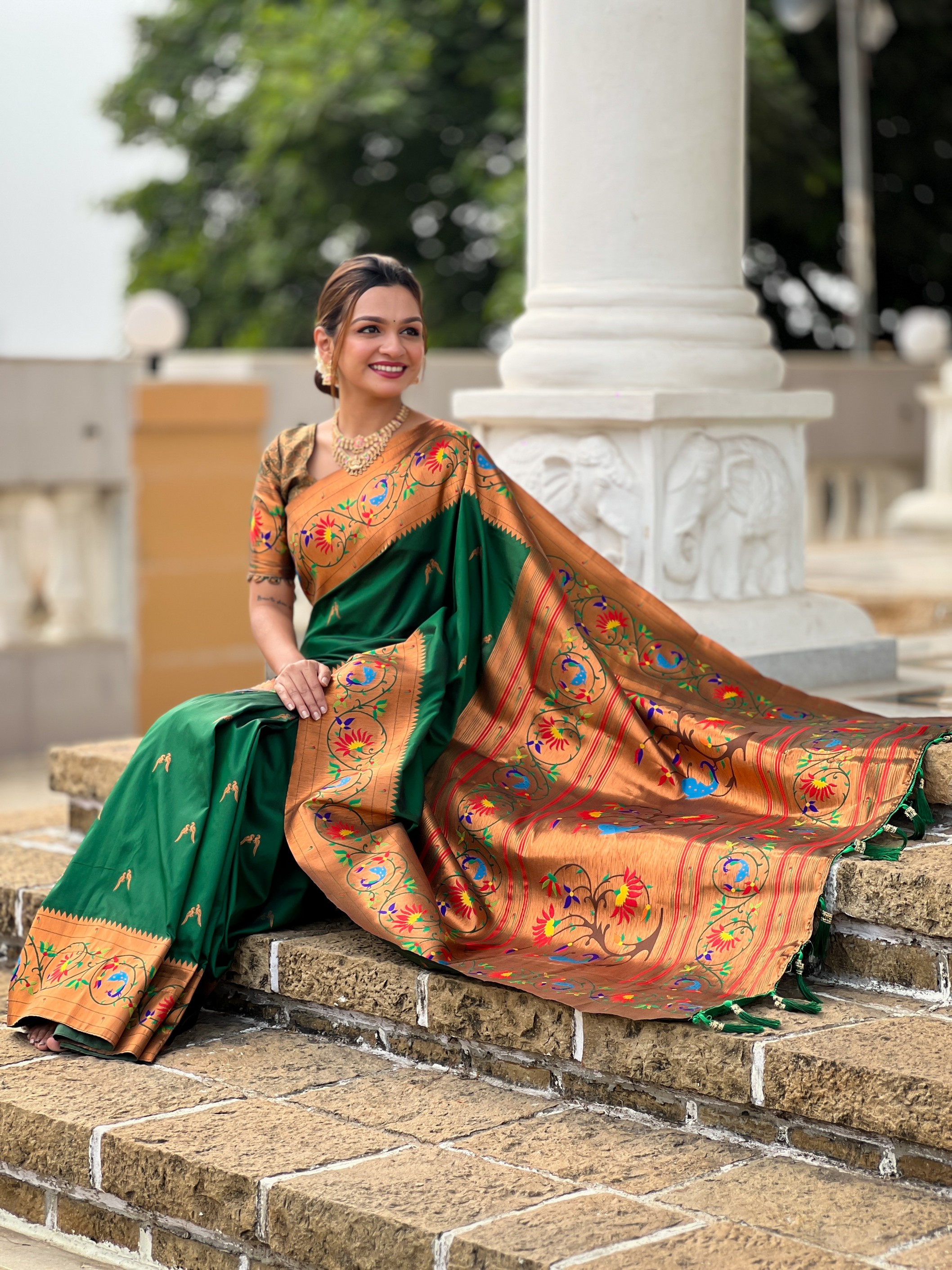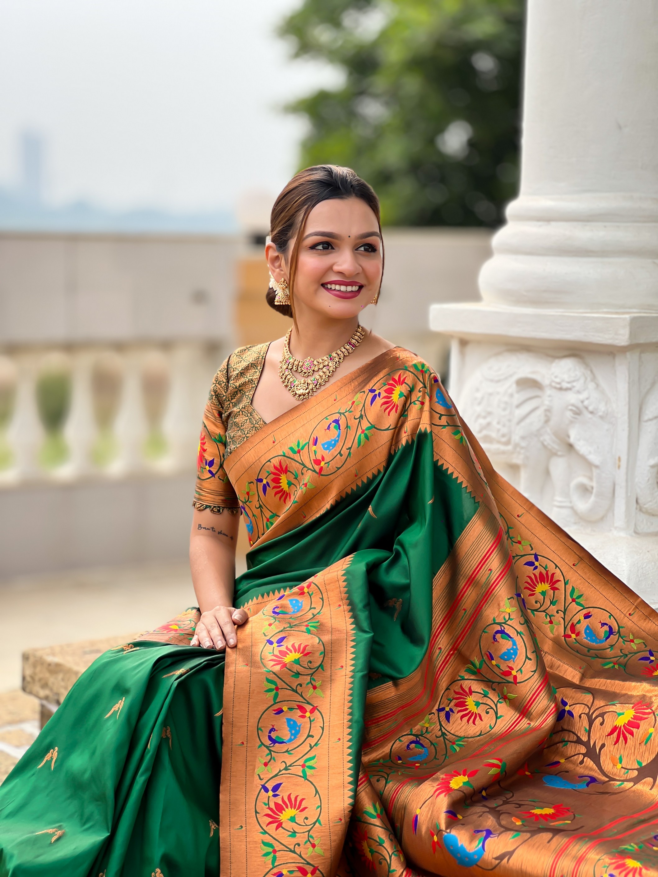 Green Color Paithani Silk Fabric Woven Meenakari Jacquard Designer Graceful Wedding Saree