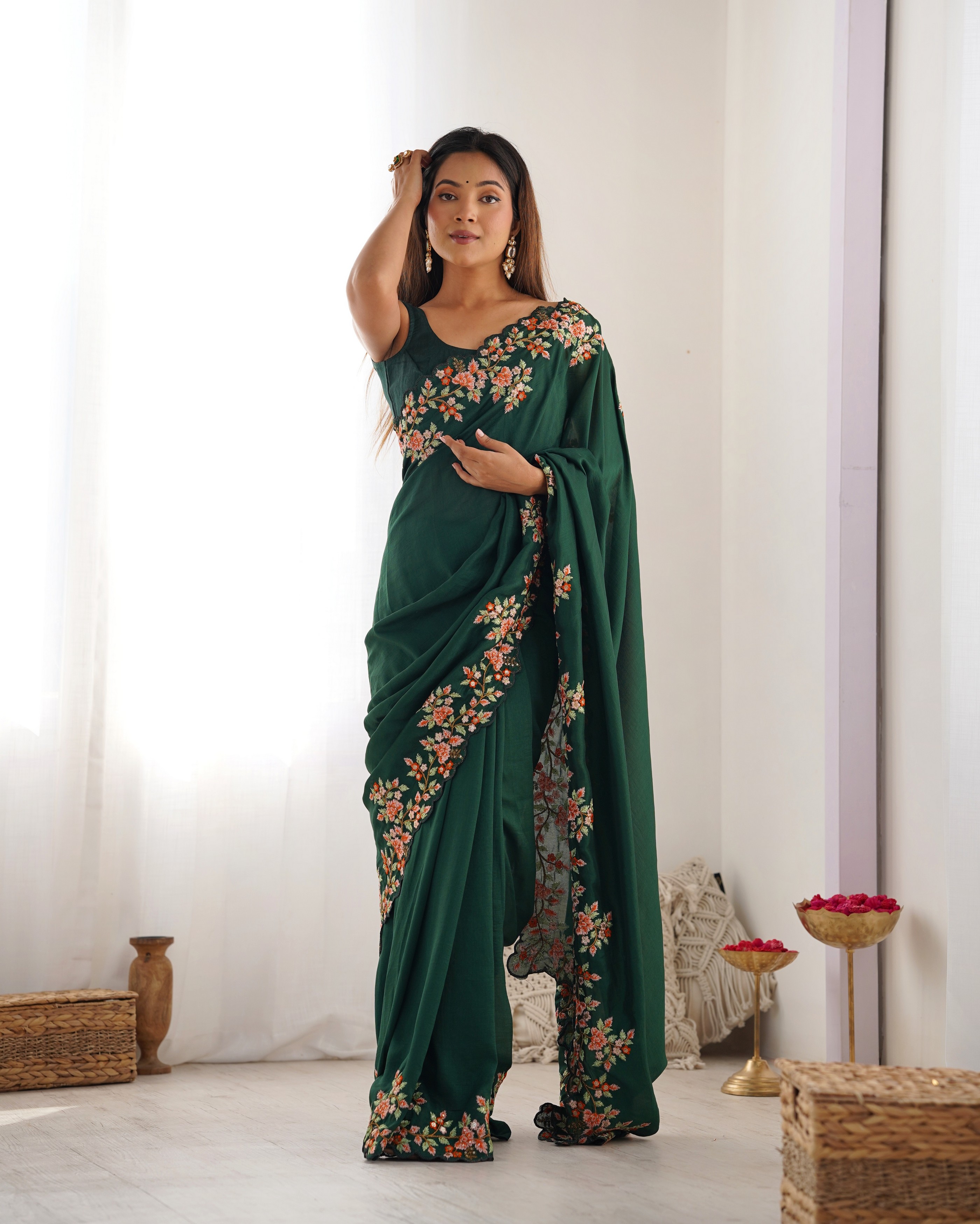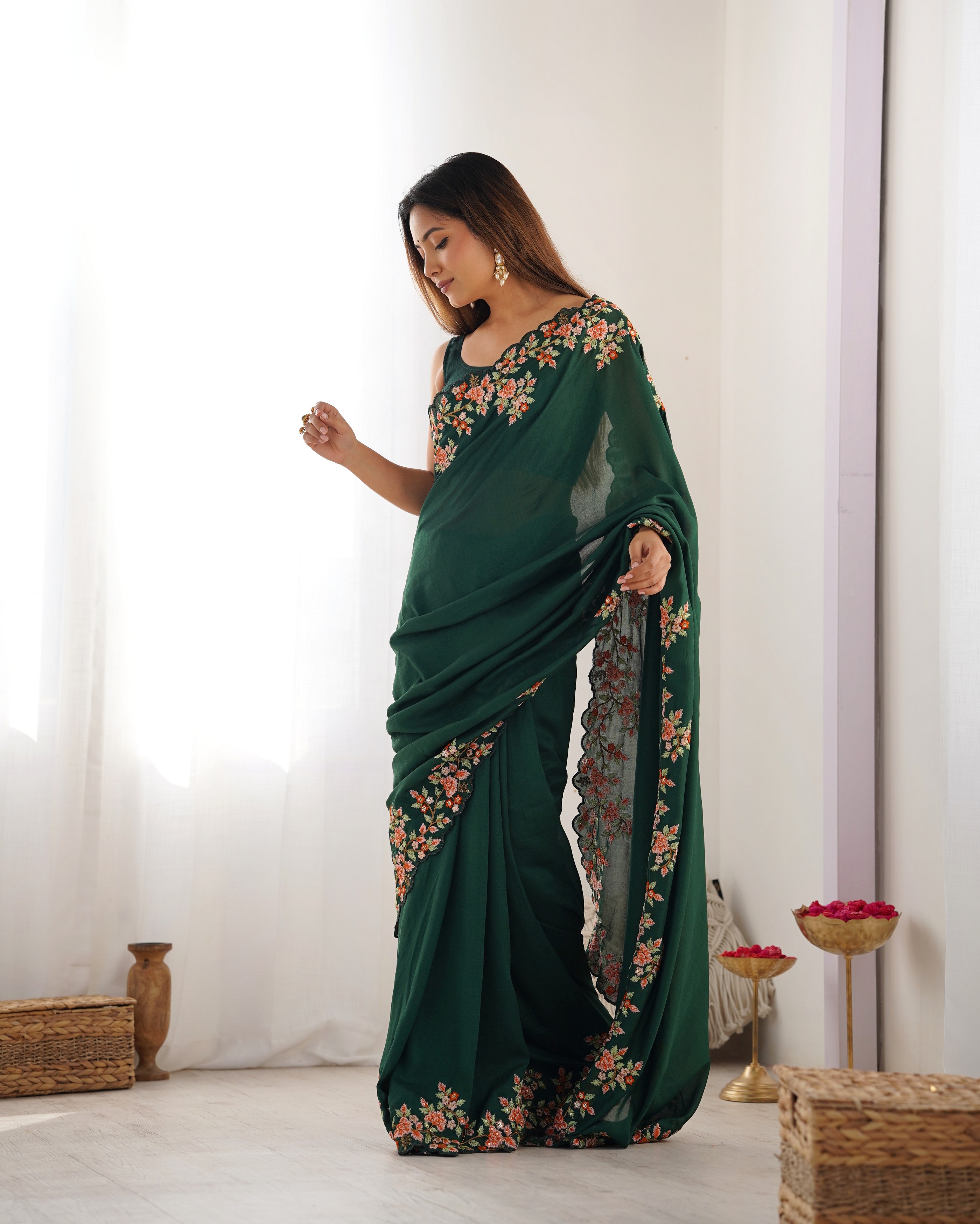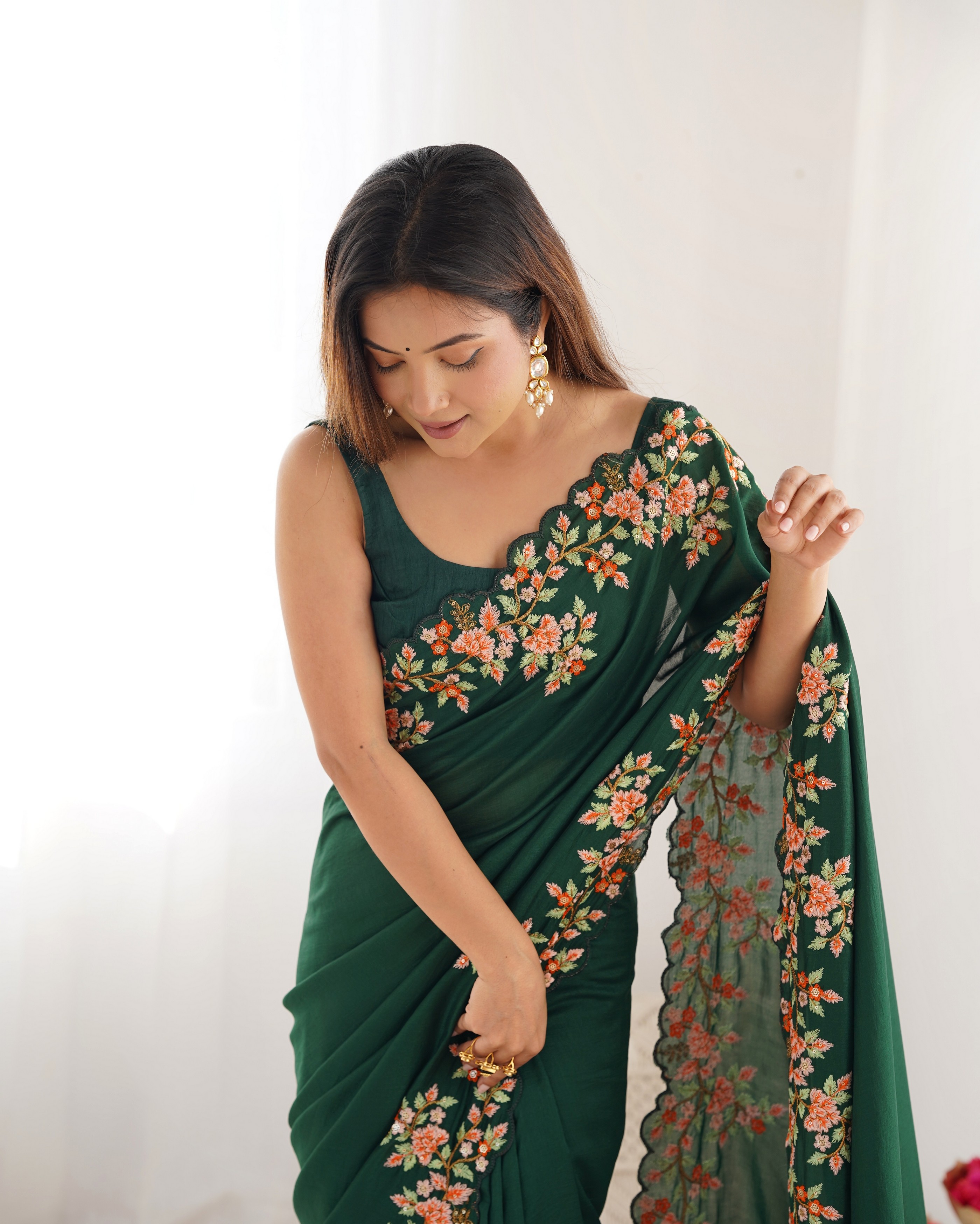 Green Color Vichitra Silk Fabric Designer Embrodery Work Ethnic Saree