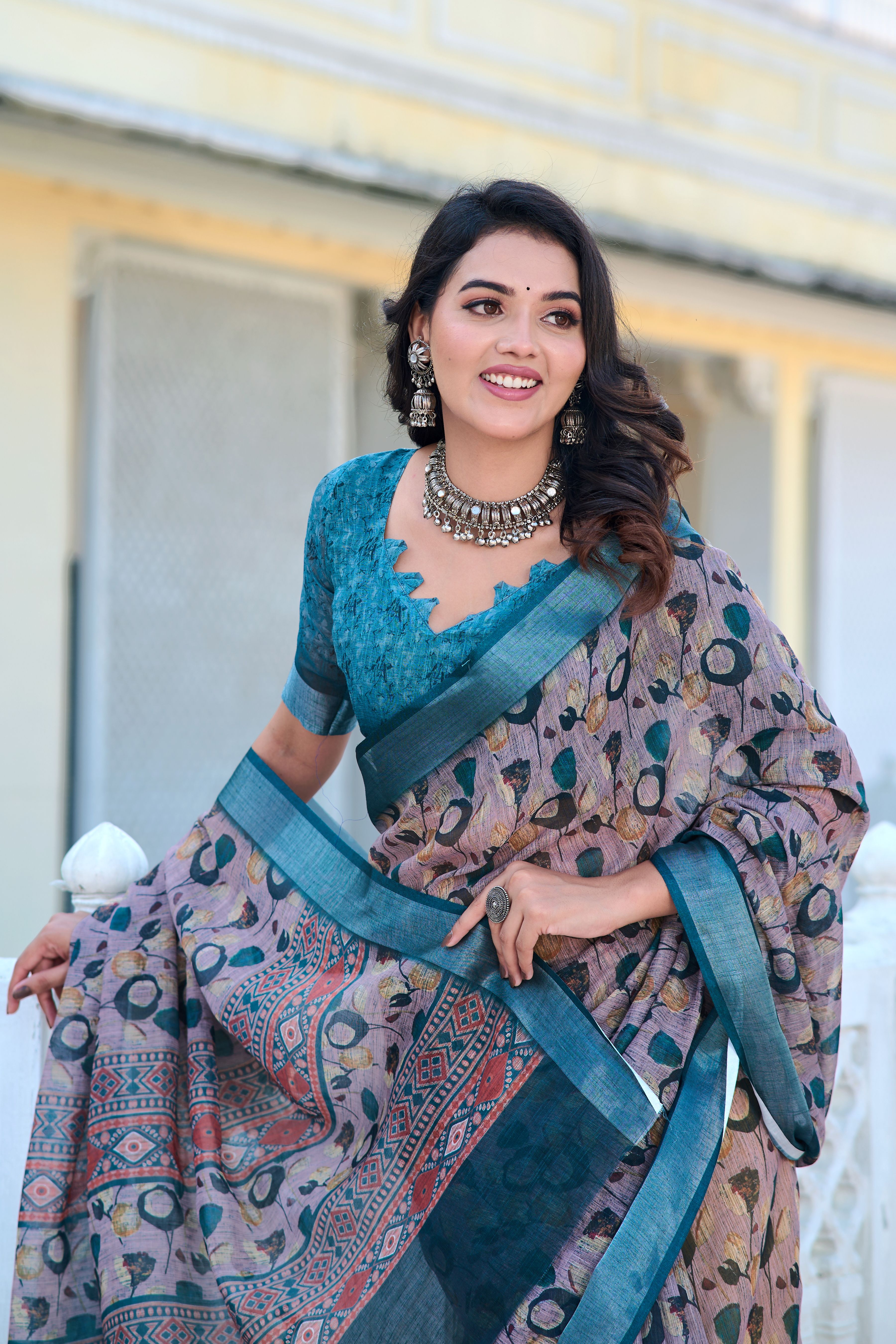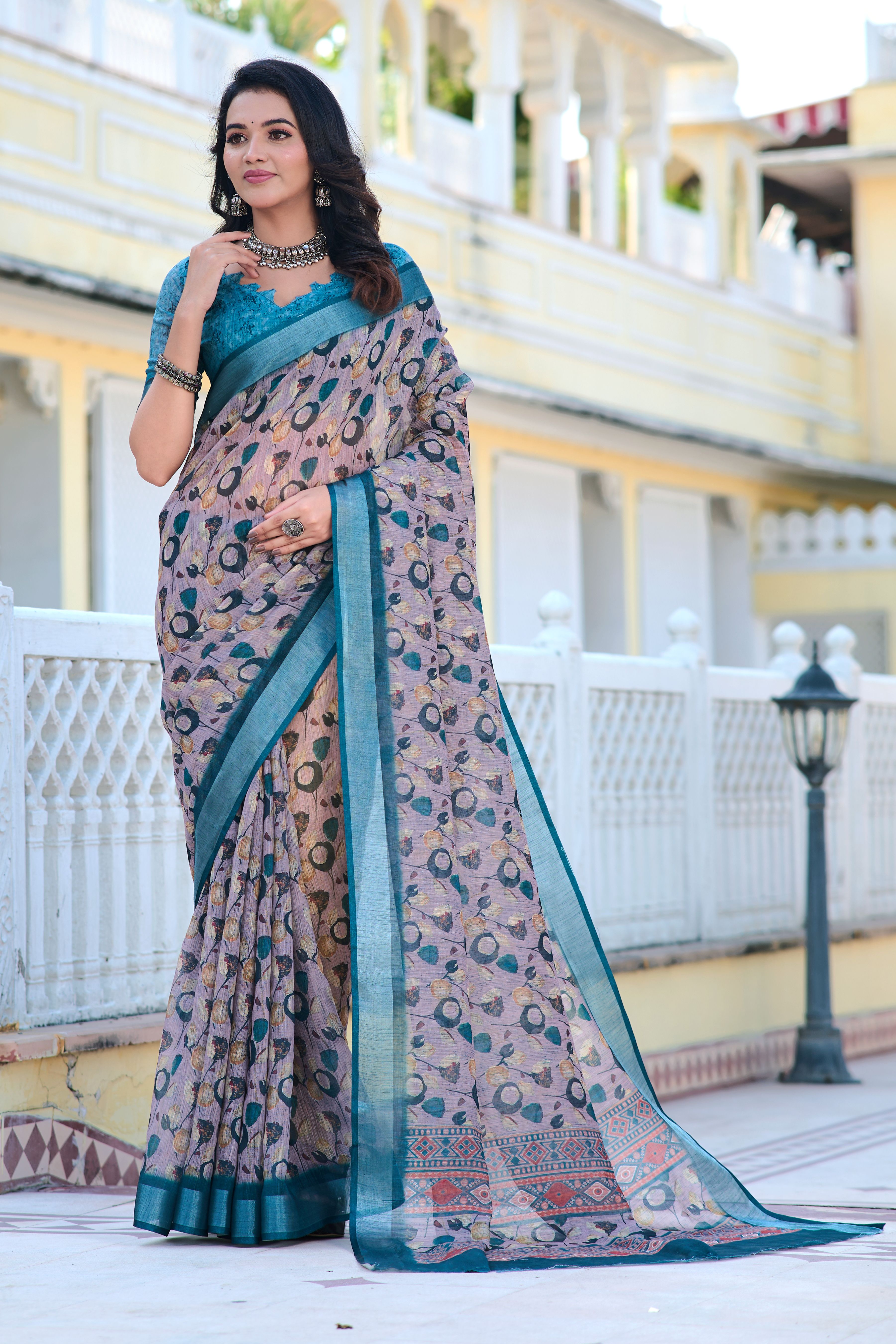 Garb These Festive Saree in Fine Colored.These Saree Are Linen Cotton And Blouse is Fabricated On Linen Cotton Pair.Its Beautified With Woven Jari Border With Designer Digital Printed.