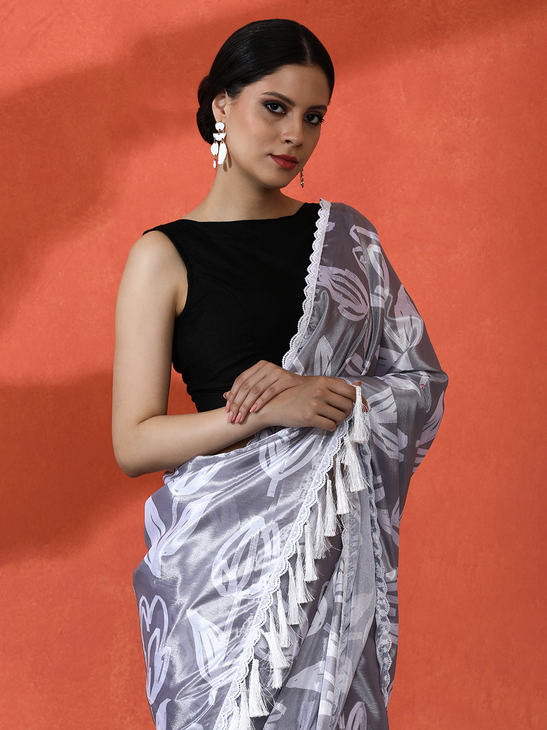 Grey Color Chinon Fabric Saree With Beautiful Digital Print For Ceremonial Wear