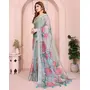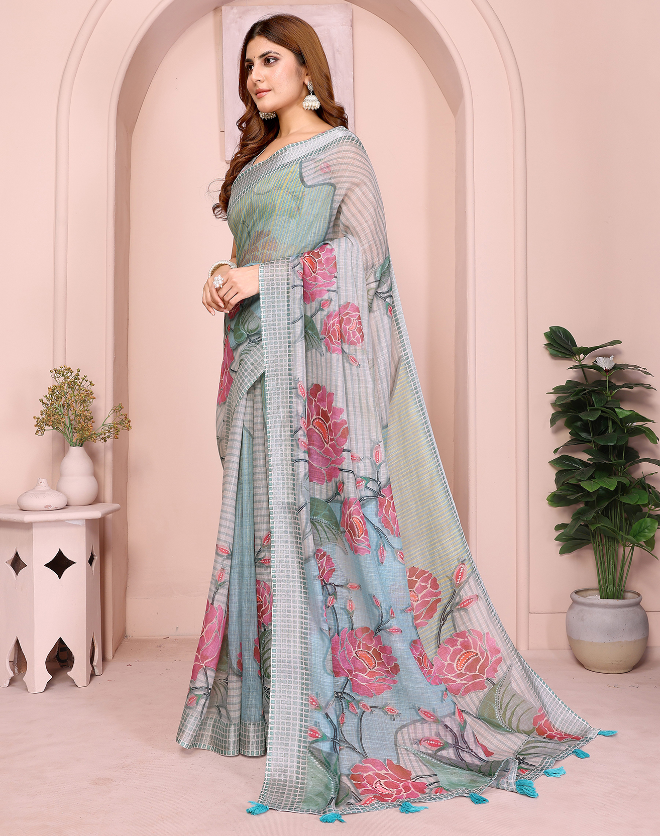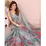 Grey Color Linen Cotton Fabric Festive Looks Printed Saree