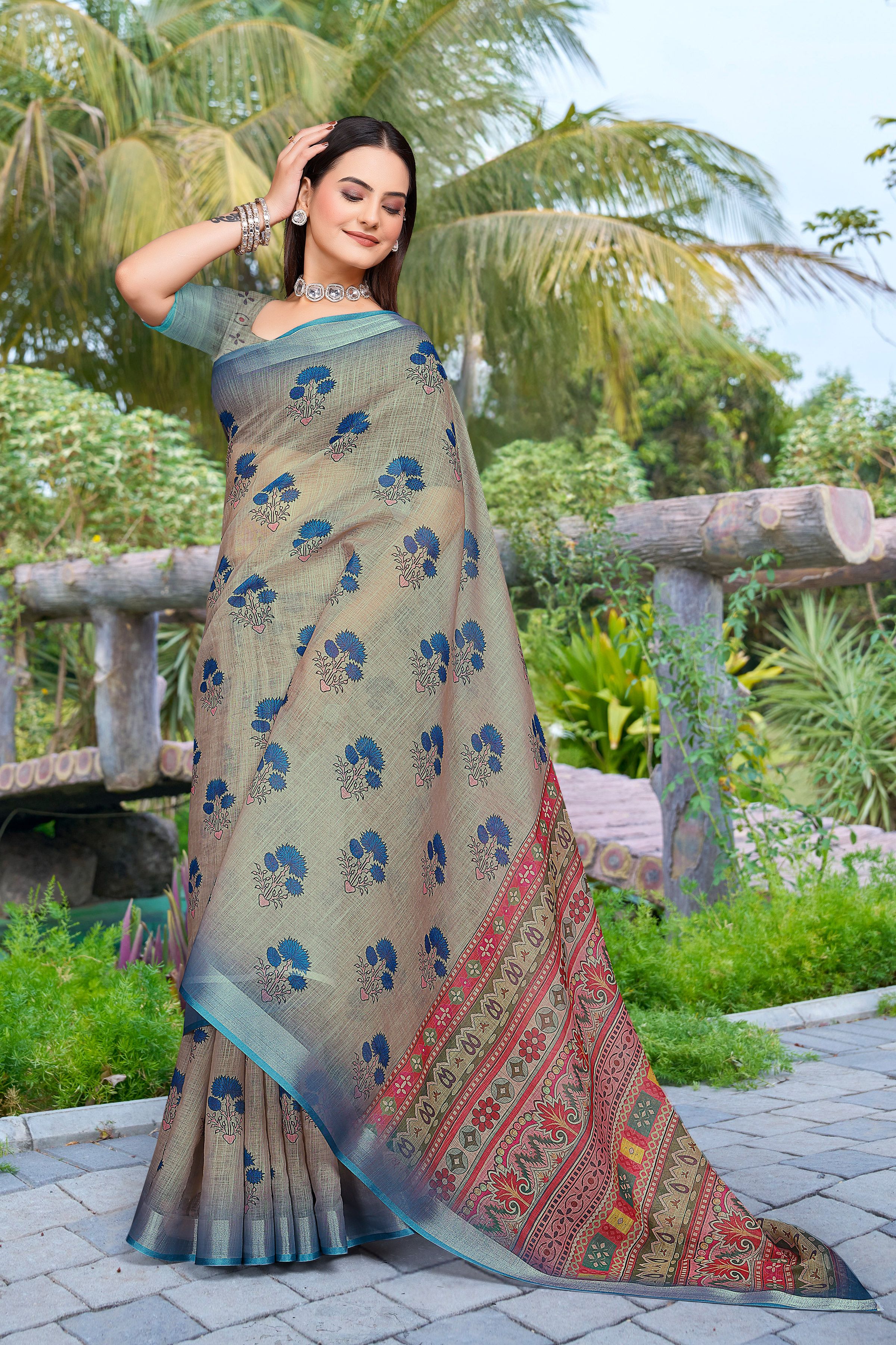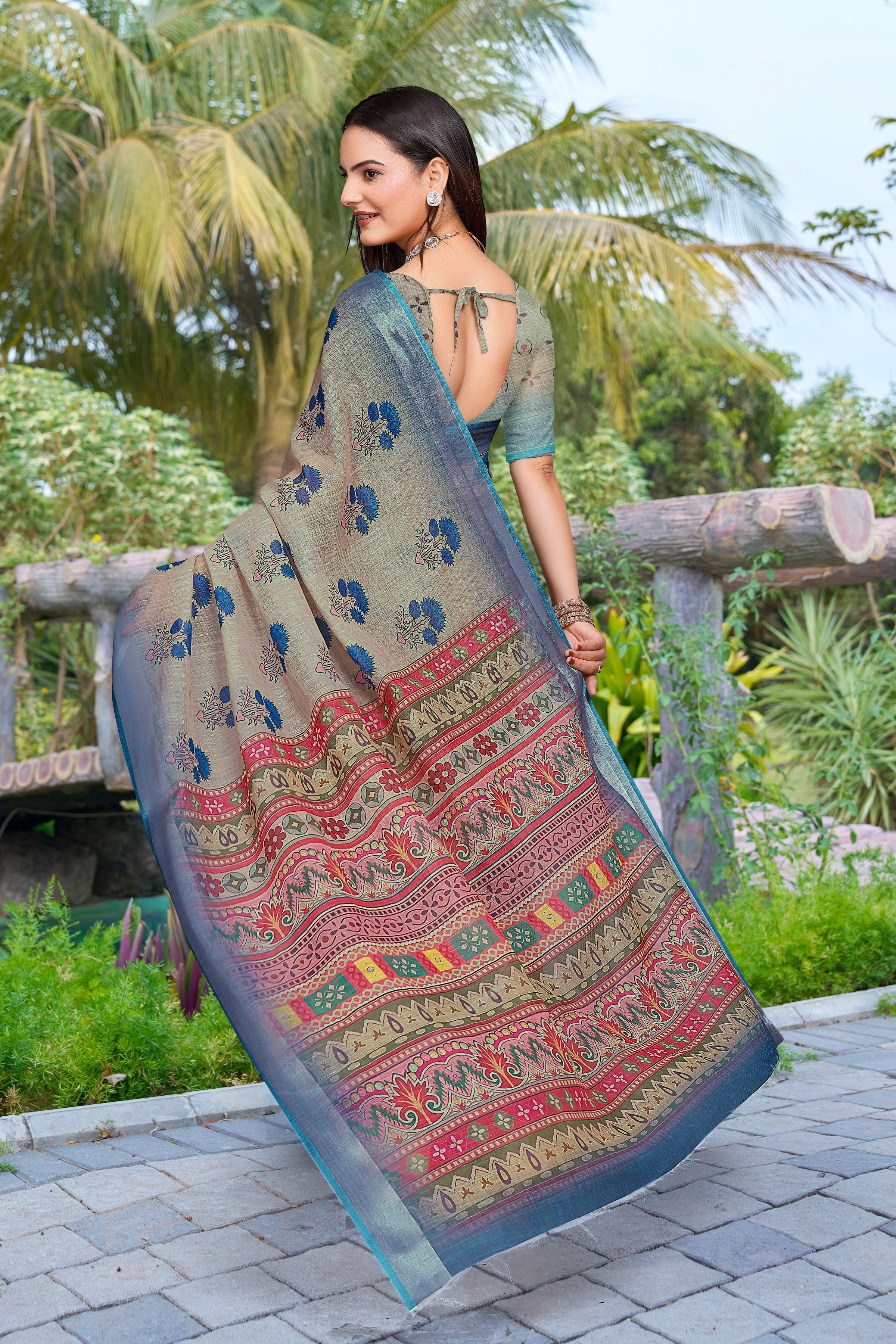 Grey Color Linen Cotton Fabric Woven Border Designer Printed Saree